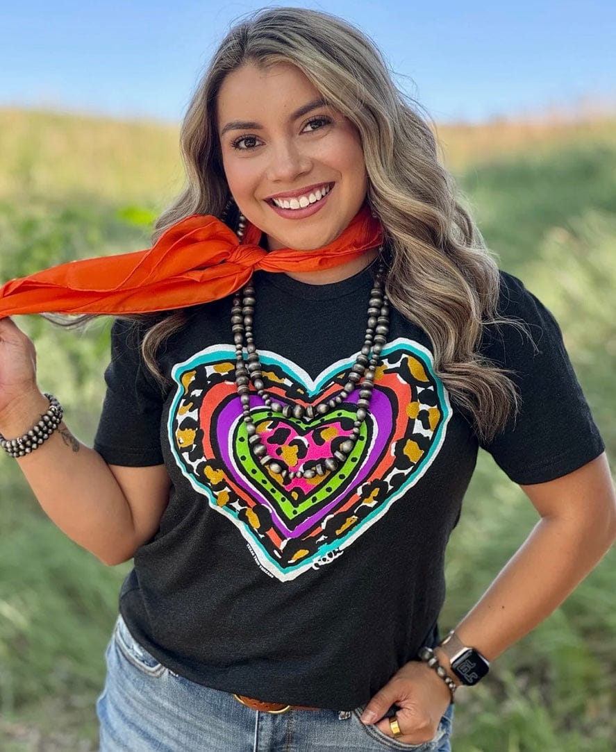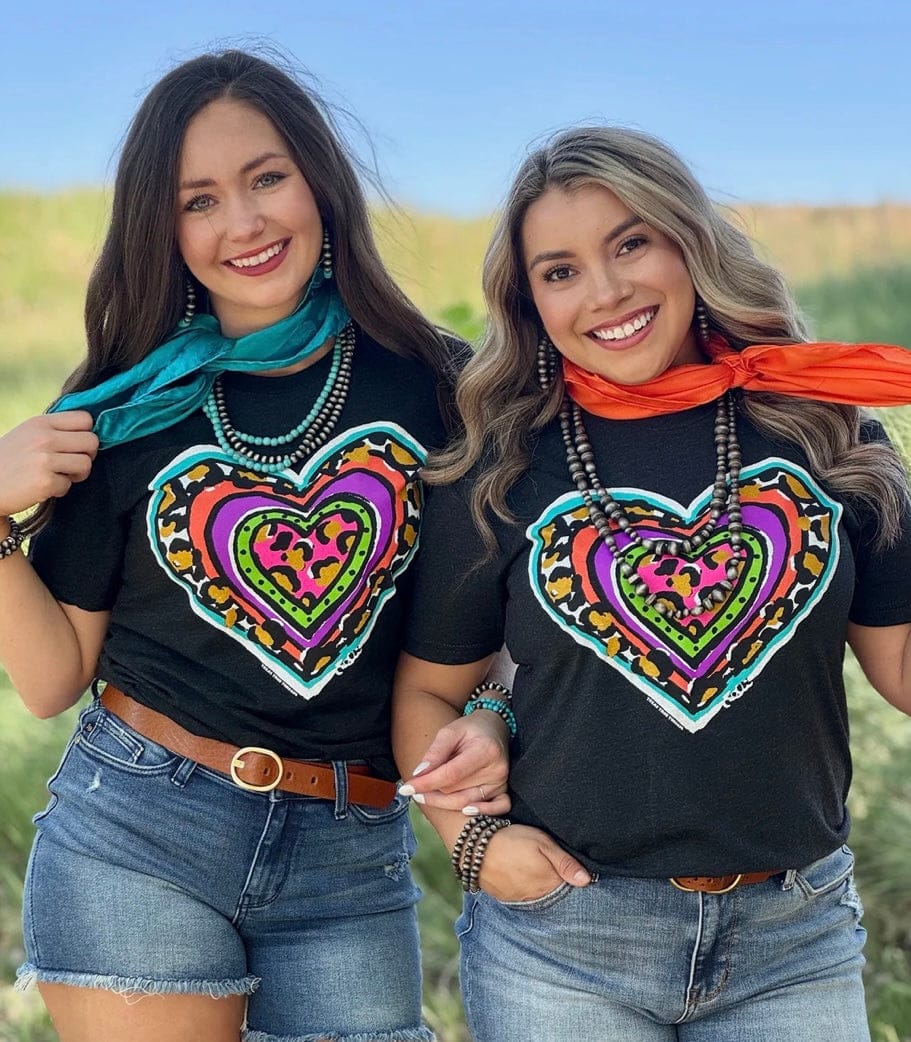 Valentine’s Day or any day—this tee brings the love! 💕 Our hand-drawn Heart Tee features all the prettiest colors mixed with a touch of bold leopard for the perfect Western-chic vibe. Cute, comfy, and totally wearable year-round, this one’s a must-have for layering or styling solo with your favorite denim and boots.