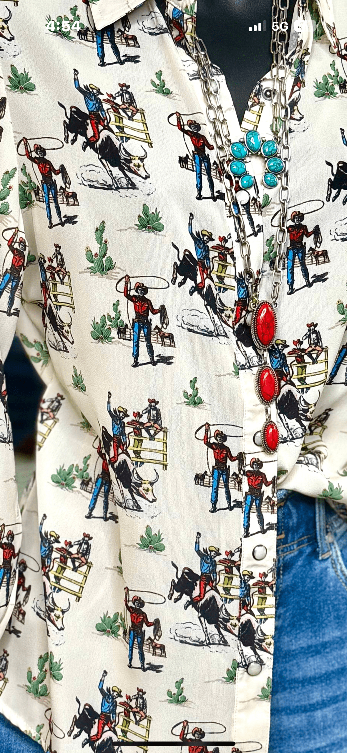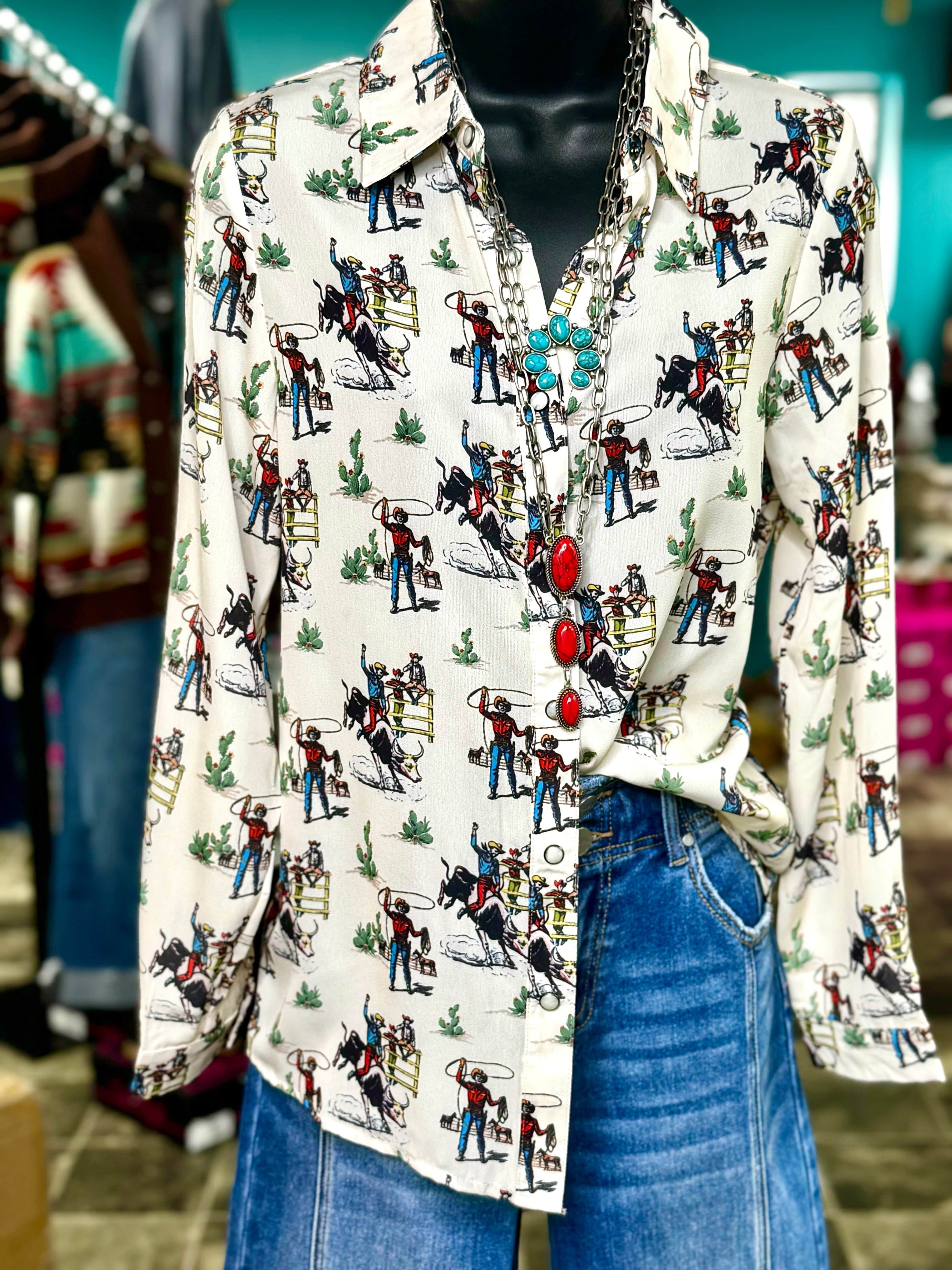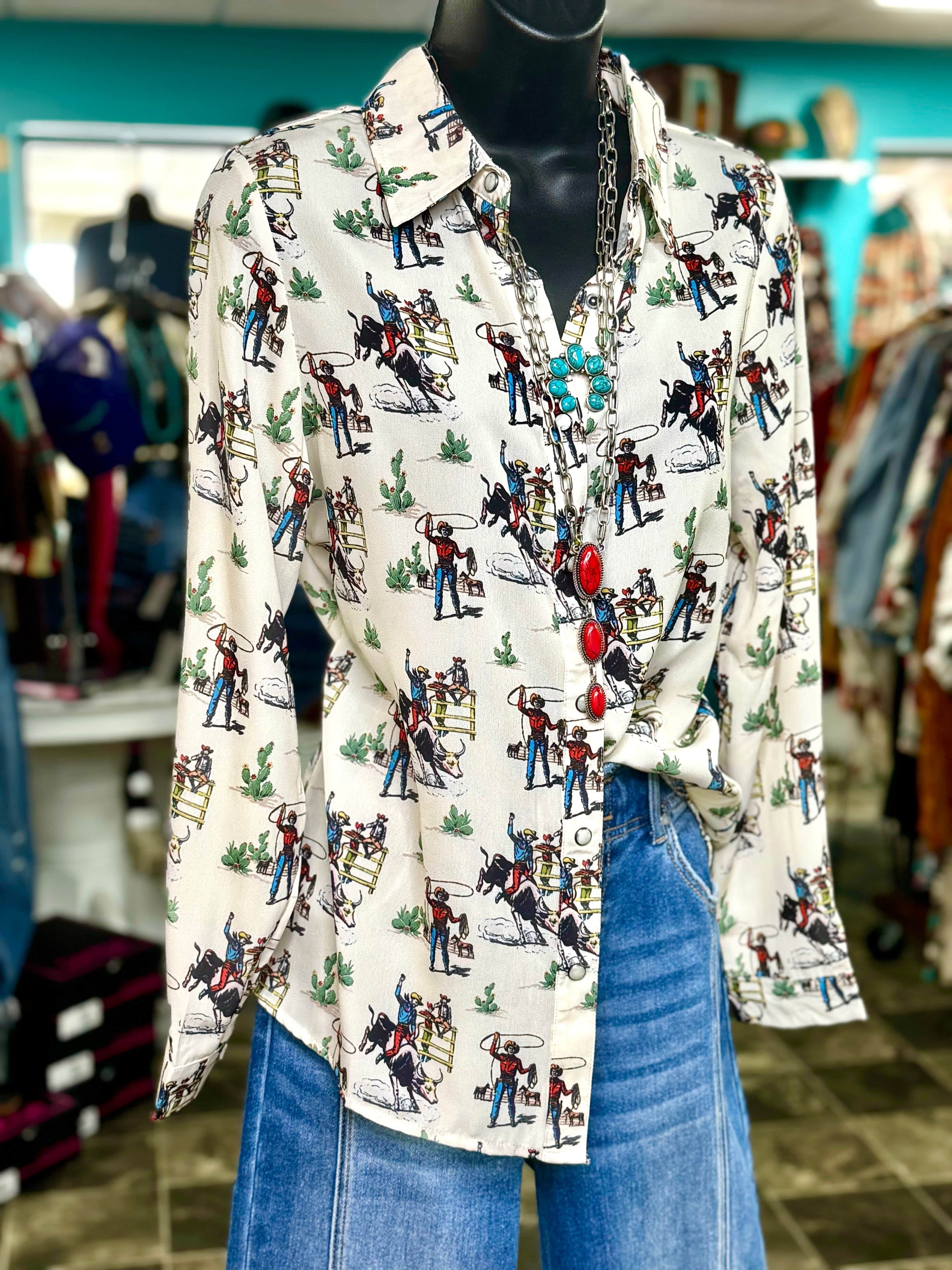 From one of my favorite makers, this top is so fun! Classic western style with bull riders, cowboy hats, a cute rodeo theme and all the western style you need! This fun button up can be worn as a top or so cute under a cardigan! Meets dress code for the arena too!