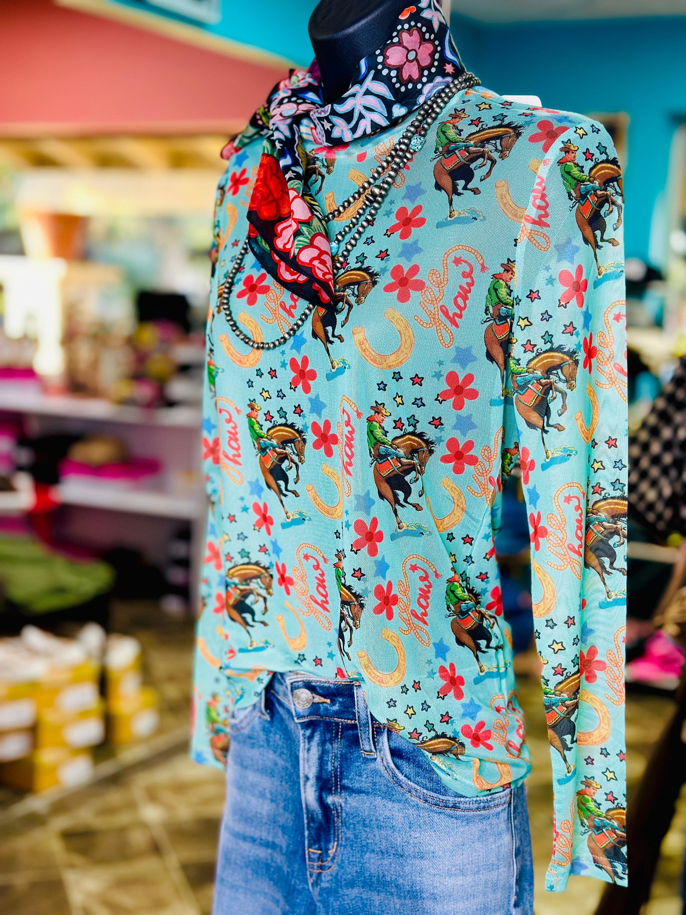 New and so cute!  This great fitting mesh top with a rodeo events and howdy horseshoe western retro print will be your fav too!  Wear it alone, under a blazer (Adorable!) or with one of our fun tees over it for an up to date look! Snag it up quick - limited quantities!
