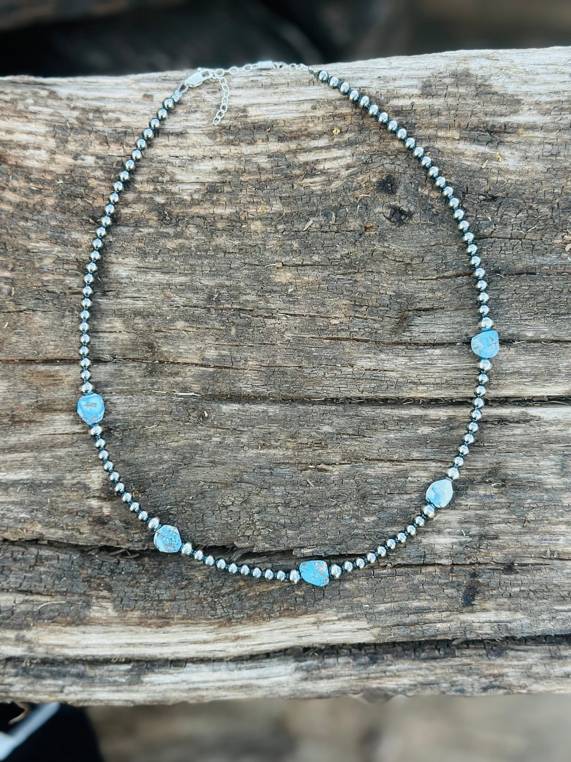Handcrafted in Texas, this stunning 16” necklace features genuine Desert Pearl sterling silver pearls paired with Golden Hills turquoise stones for a timeless Southwest look. Each bead is hand-strung to create a classic yet modern piece that elevates any outfit.