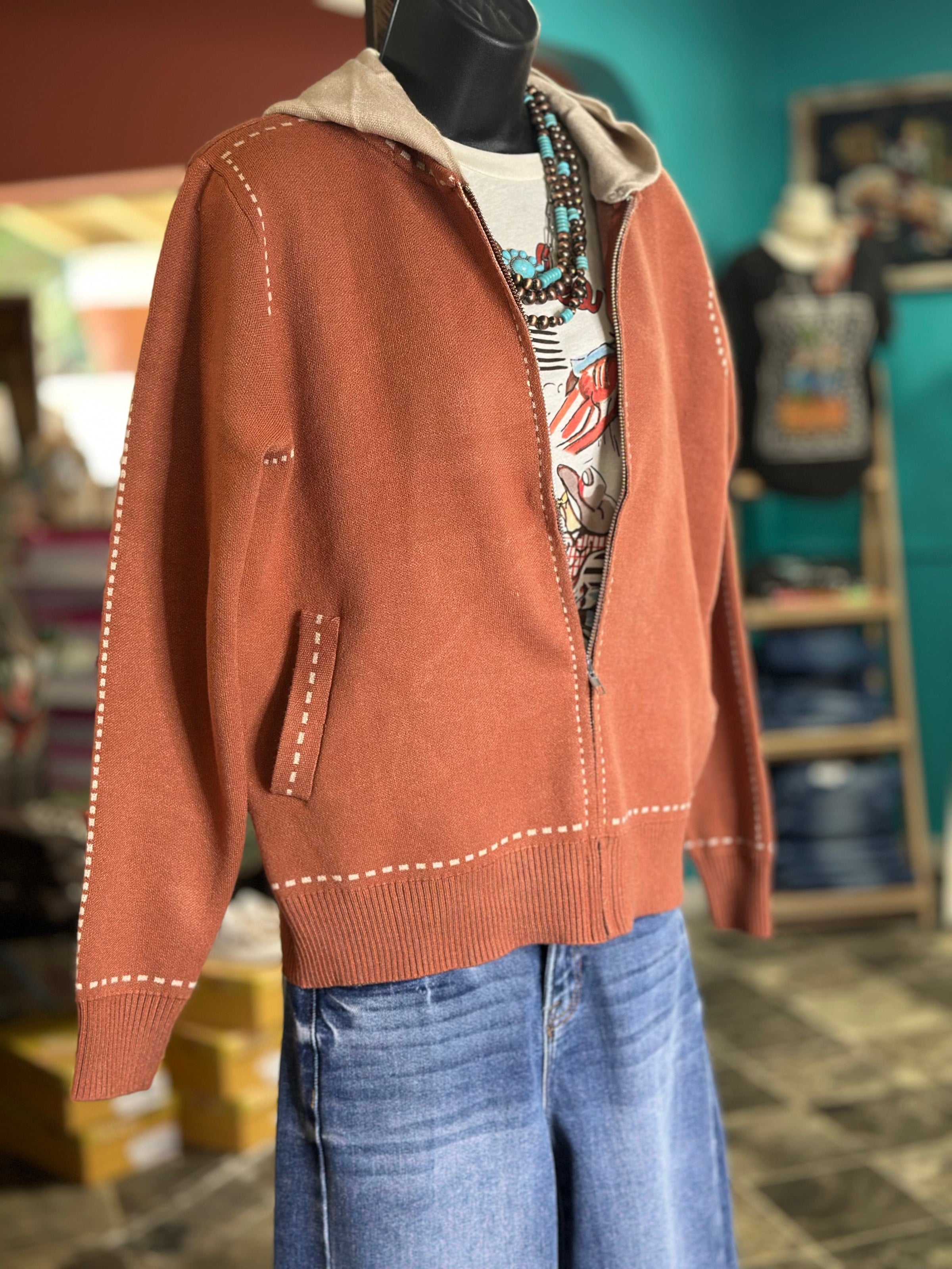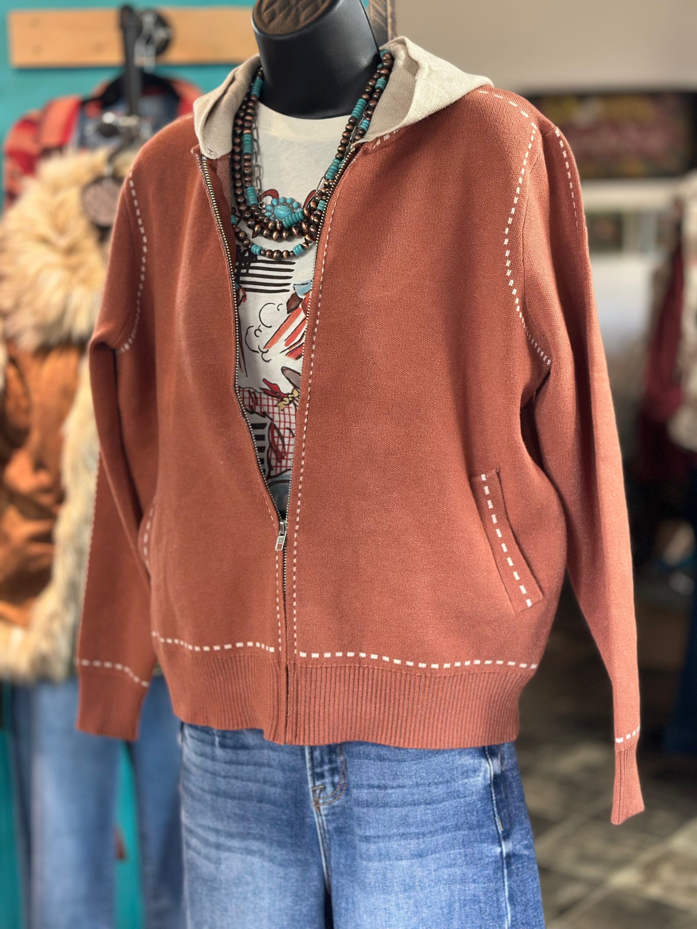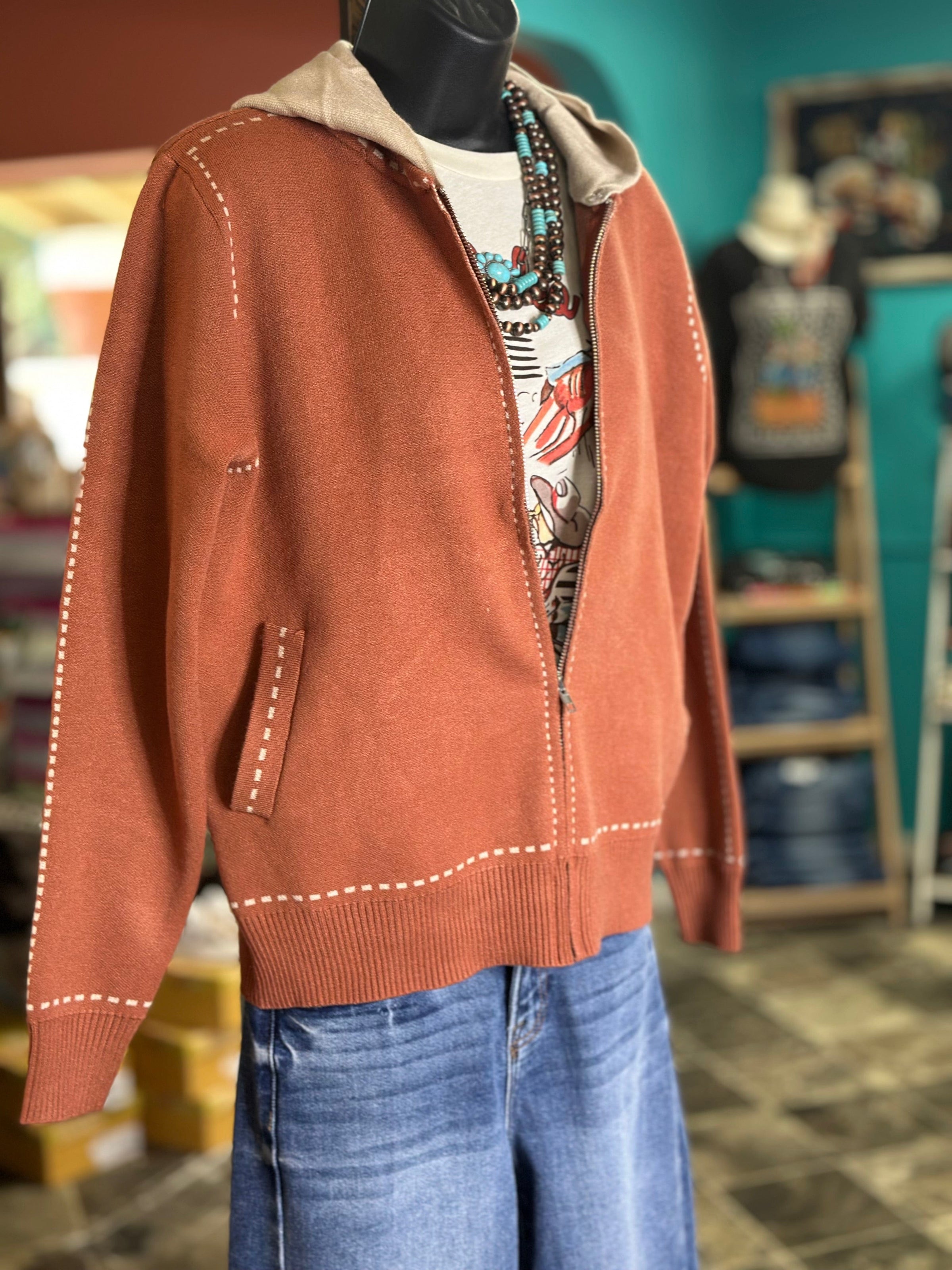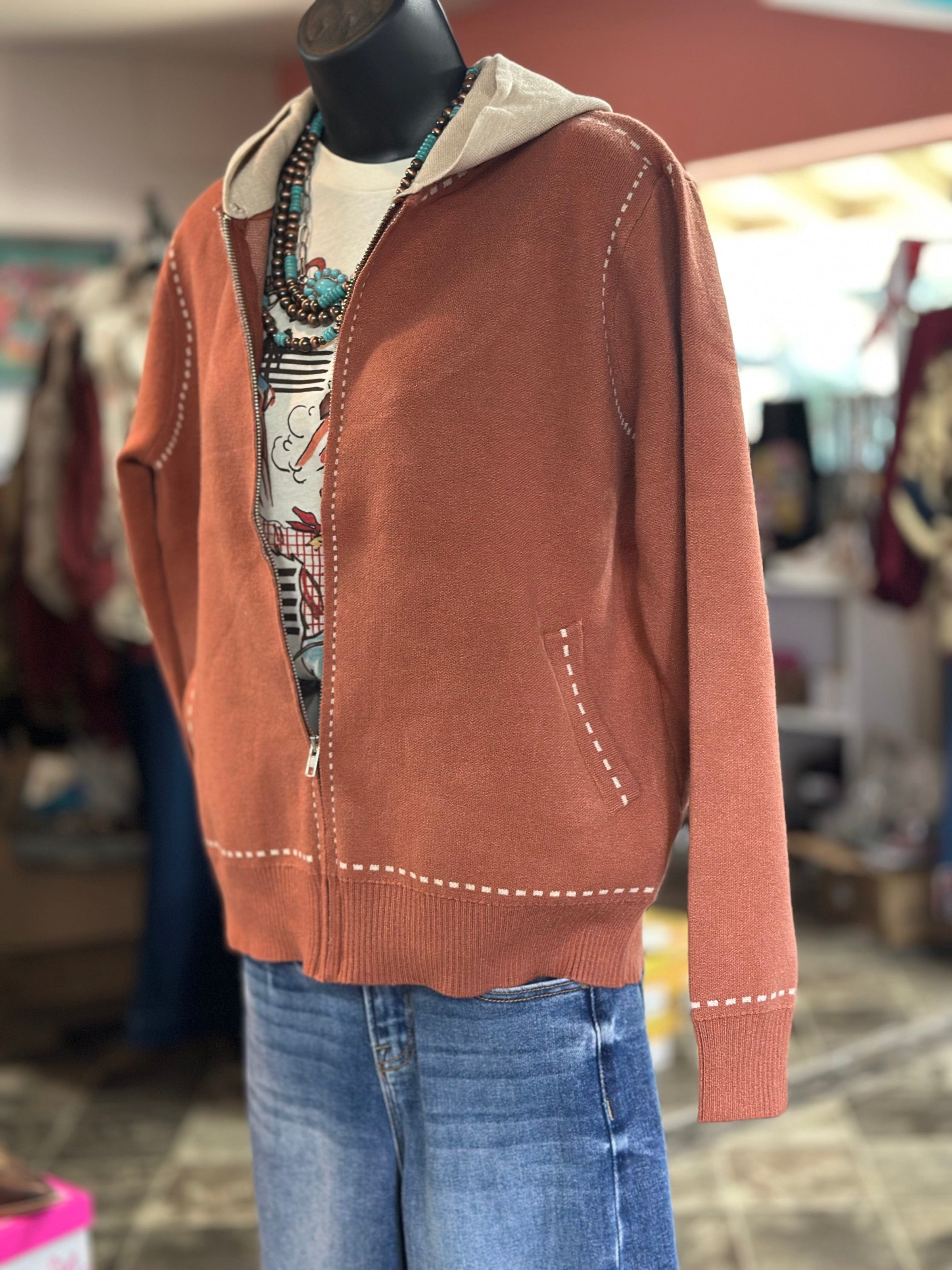 This is the cutest sweater! Super soft with a flat weave, buckstitch trim, zip up contrast hoodie cardigan in a perfect weight for fall! With a cozy and comfy weave, this cardigan is the perfect weight for any autumn day. Wear it for school, to a casual night out, or even to work. You'll love the softness of this popular zipper-style sweater. Whenever I need to slip into a fall fave, this one's always at the top of my list!! Limited quantities so don’t miss out