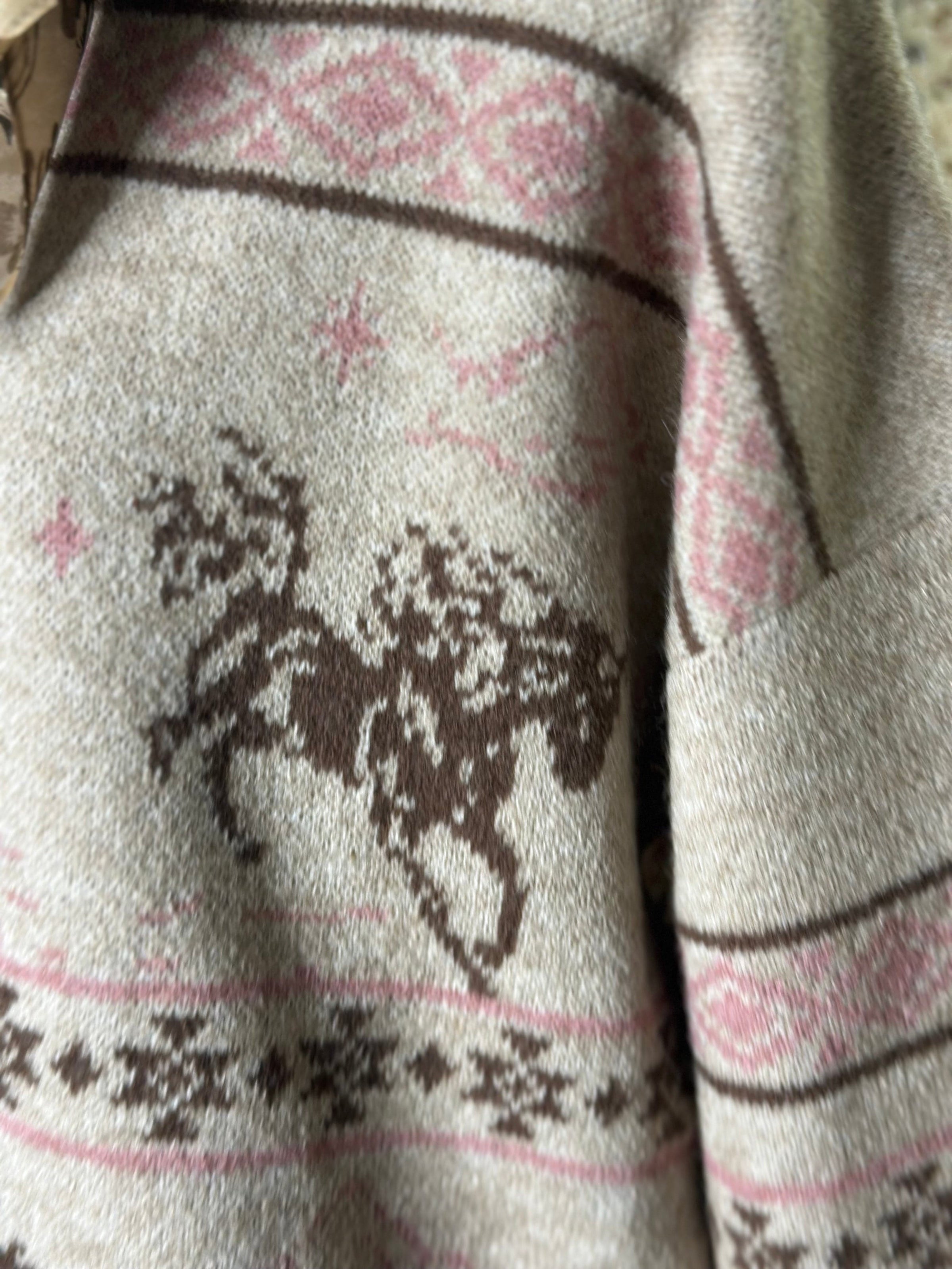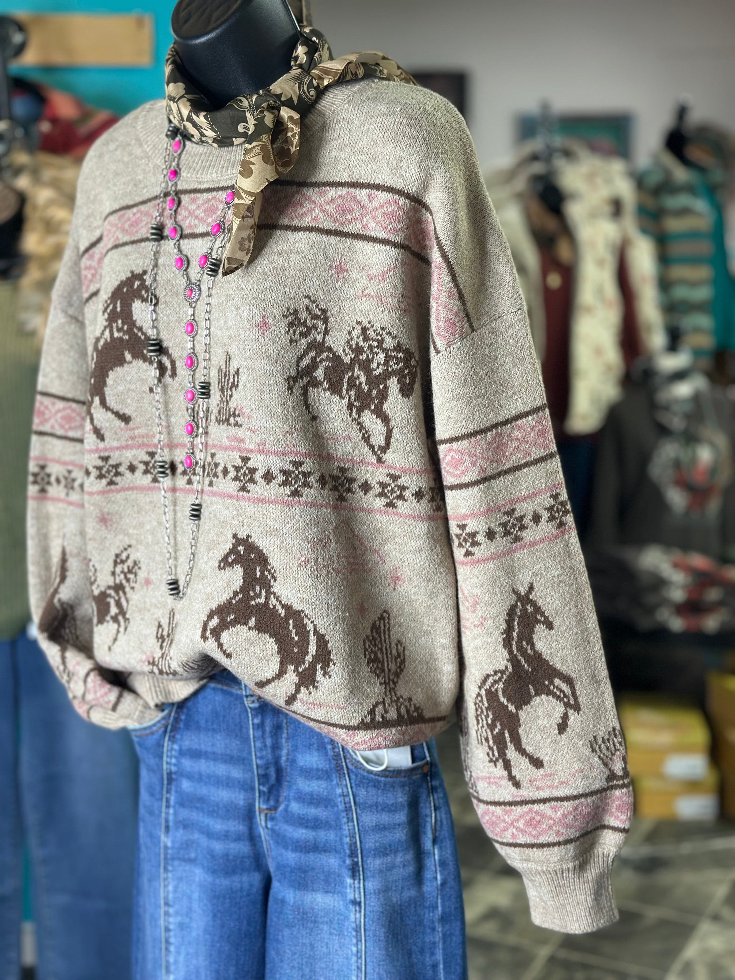 Saddle up in style with The Horses In The'West Sweater!   This cozy super soft western winner features an Aztec patter & horses for a playful Western vibe. Plus, its great fit will have you saying "yee-haw!"
