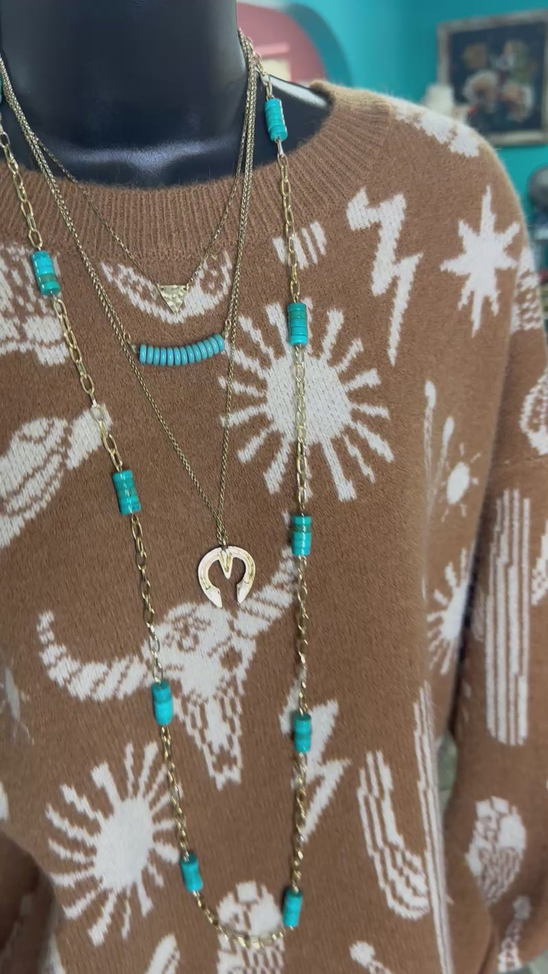 Saddle up in style with The Stay' Western In The Desert Teal Sweater! This cozy super soft western winner features cactus, boots, and cowboy hats for a playful Western vibe. Plus, its great fit will have you saying "yee-haw!"