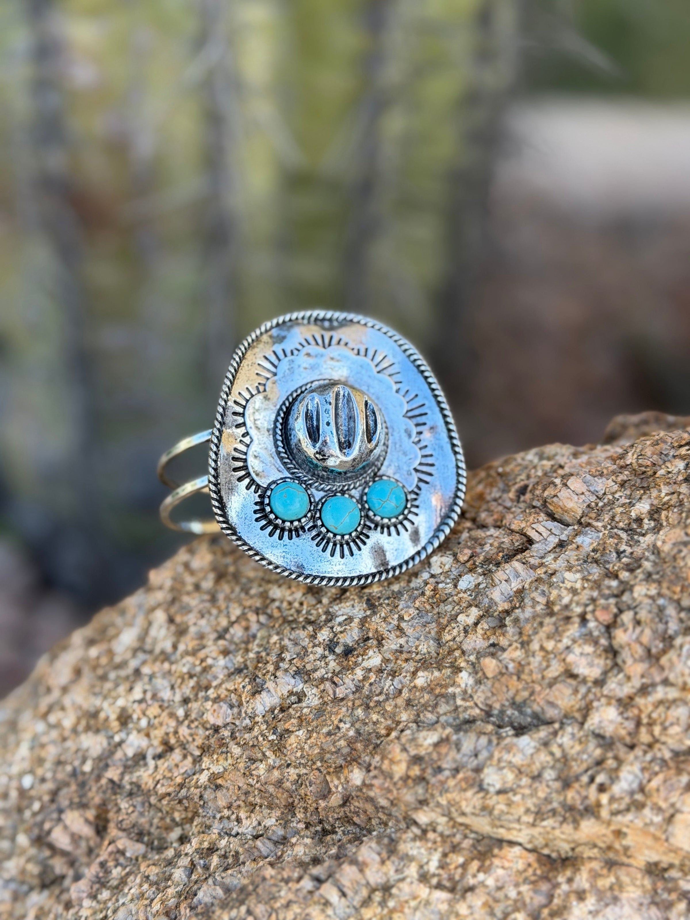We are loving this sombrero cuff bracelet we just got in! Featuring a vintage Southwest-inspired design, this bracelet adds the perfect Western touch to any outfit—without the hefty price tag. Wear it solo for a simple statement or stack it up with your favorite bangles and stretch bracelets for a bold, layered look. Easy to style, lightweight, and budget-friendly, this piece is a must-have accessory for any cowgirl closet!
