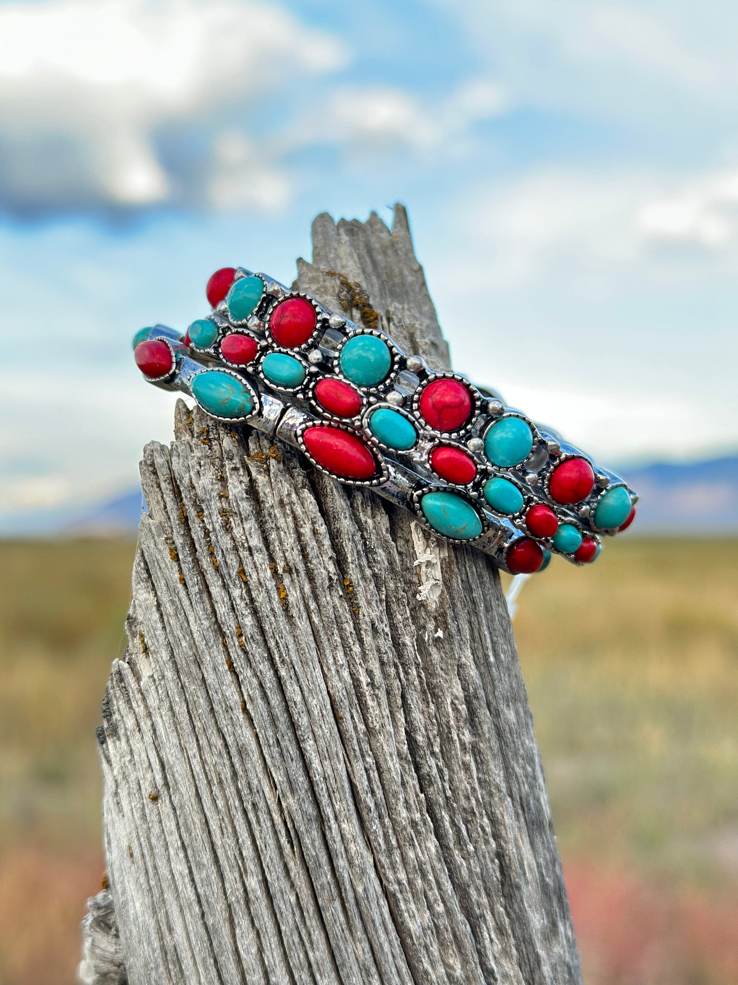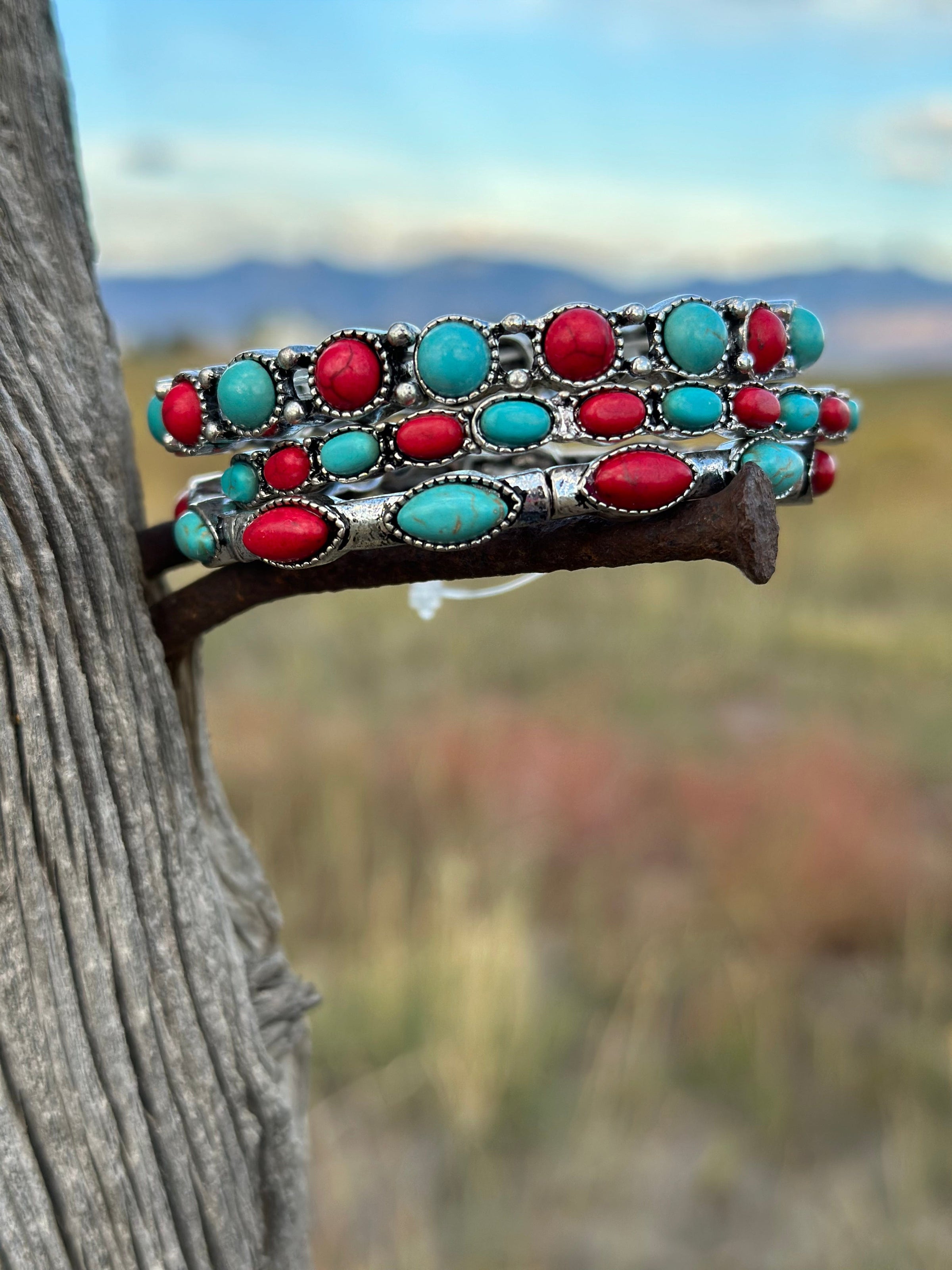 We love this great looking silver, coral, & turquoise stretch bracelet set we just got in! So cute to accent all your outfits, or makes a great little gift!
