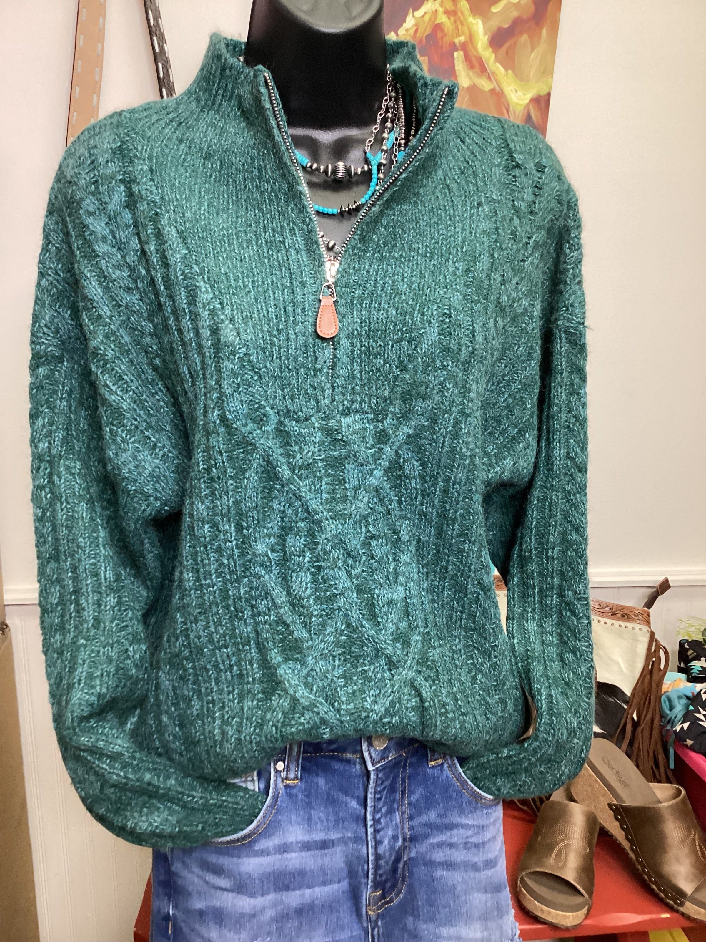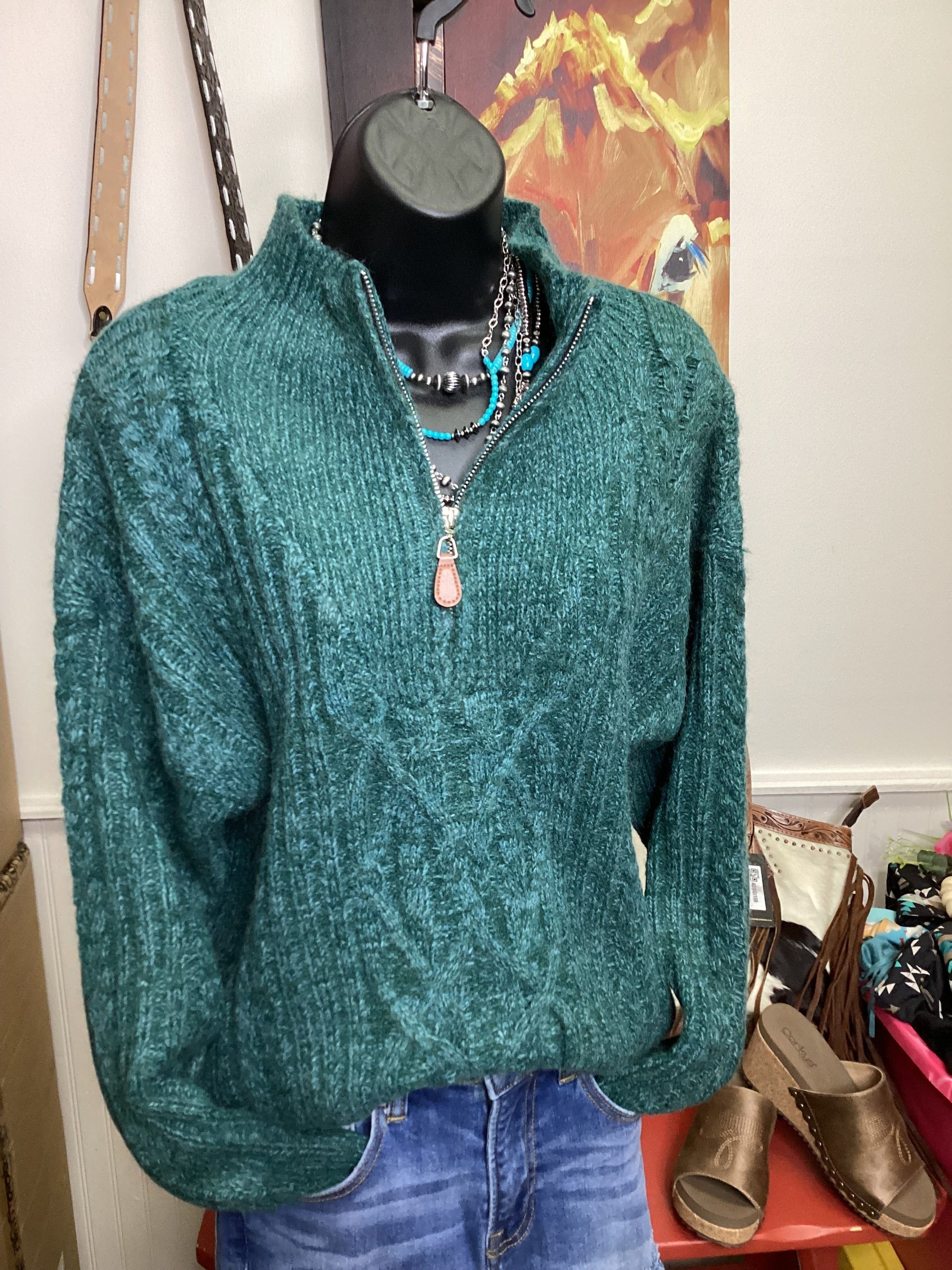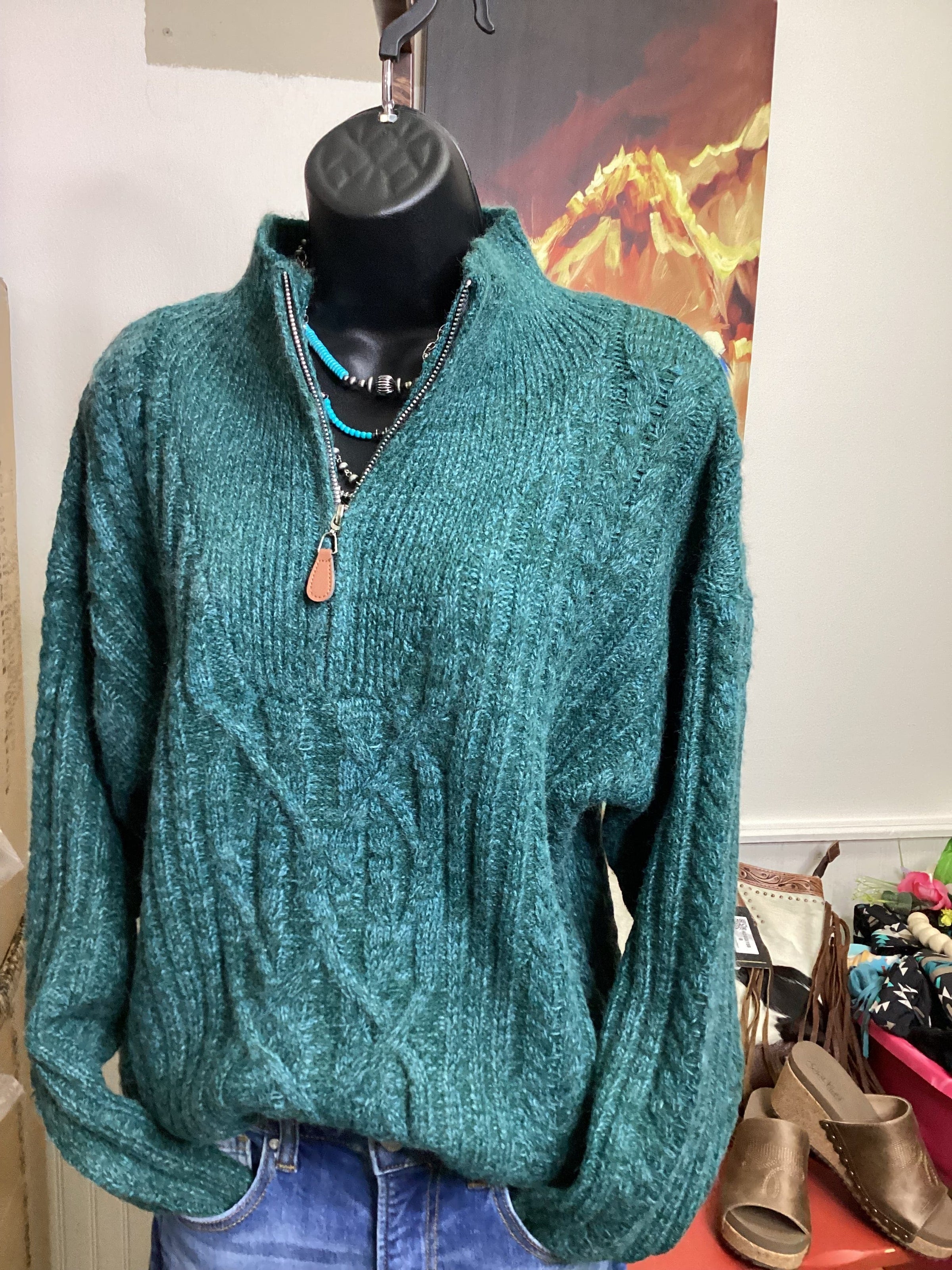 Soft weave with a classic western look!  The style you need for fall! This cute sweater in the prettiest teal color with a quarter zip that will take you from school, to running errands to the football game and make you look cute doing it!  This is one of our favorite sweaters in our fall line up!Â