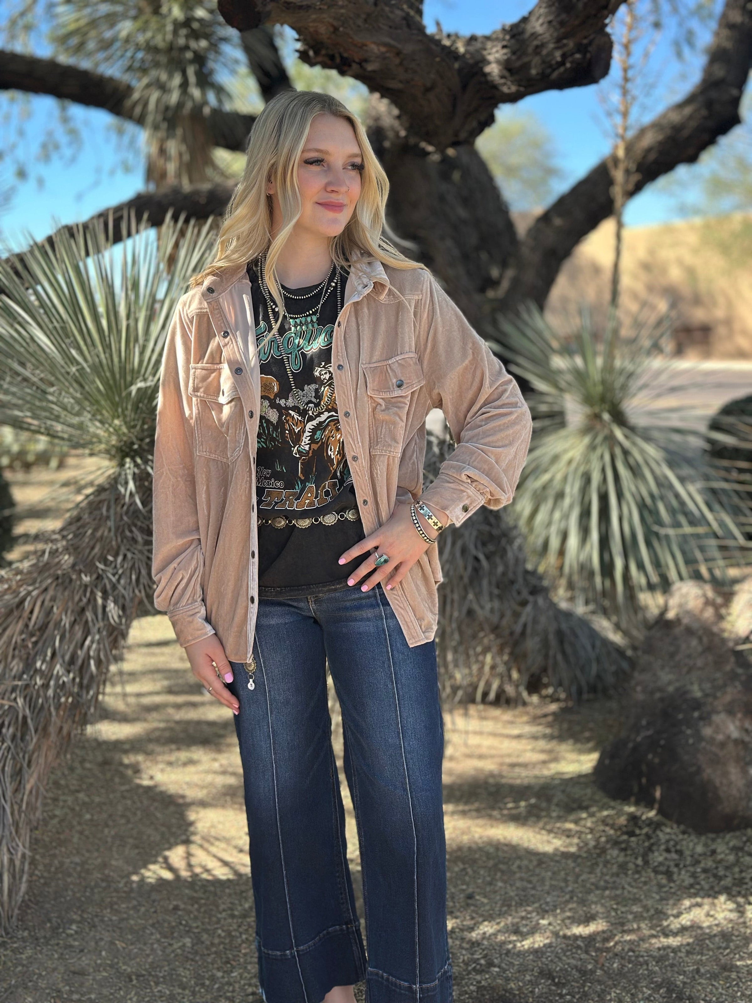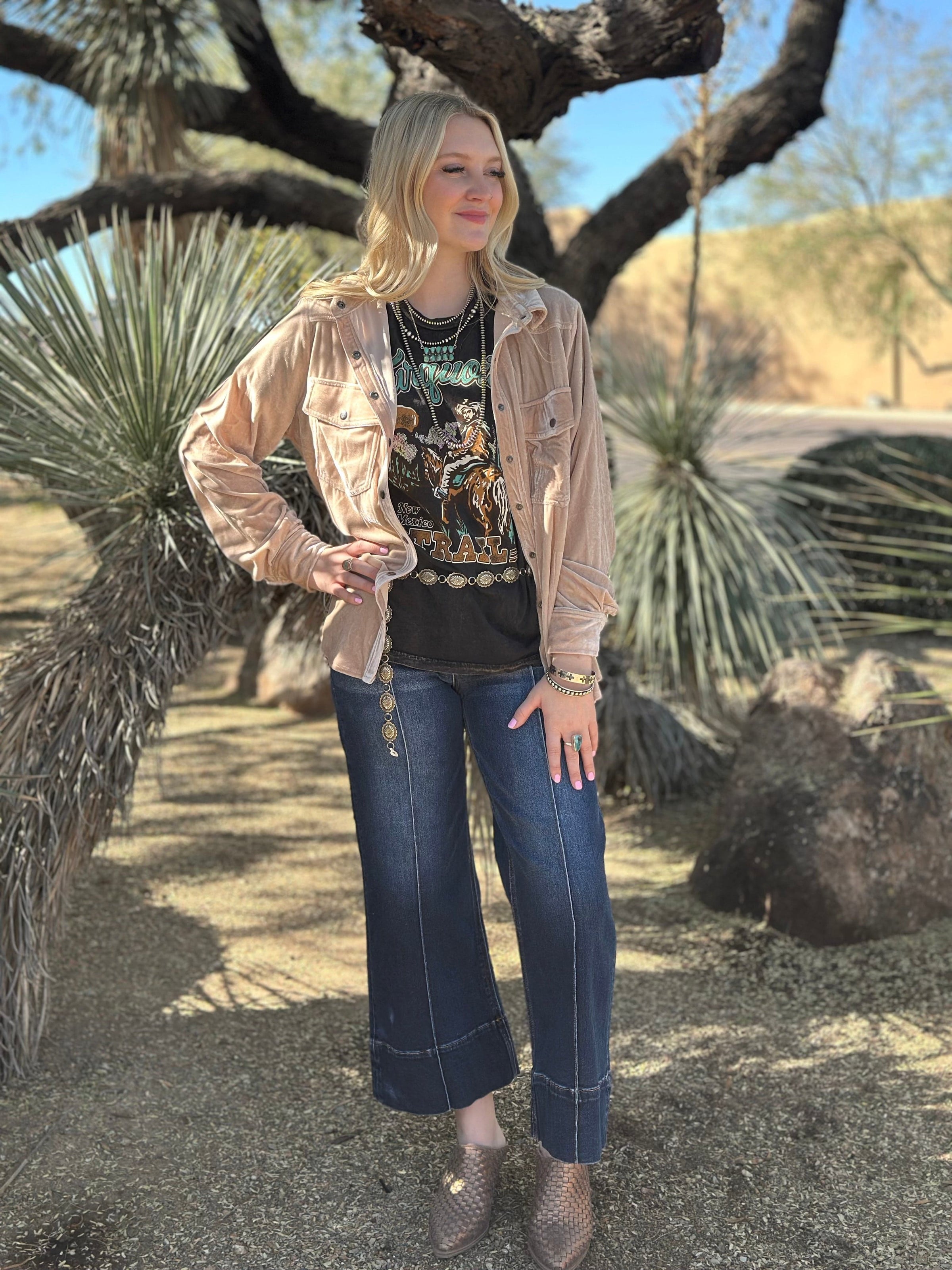 This Campagne Velvet Shirt/Jacket is pure western elegance š¤ š Styled like your favorite denim jacket but with the soft, luxe feel of velvet, itās the perfect mix of rodeo charm and holiday glam. The snap-front design and western yoke give it that true cowgirl touch, while the flattering fit makes it easy to dress up or wear casual.