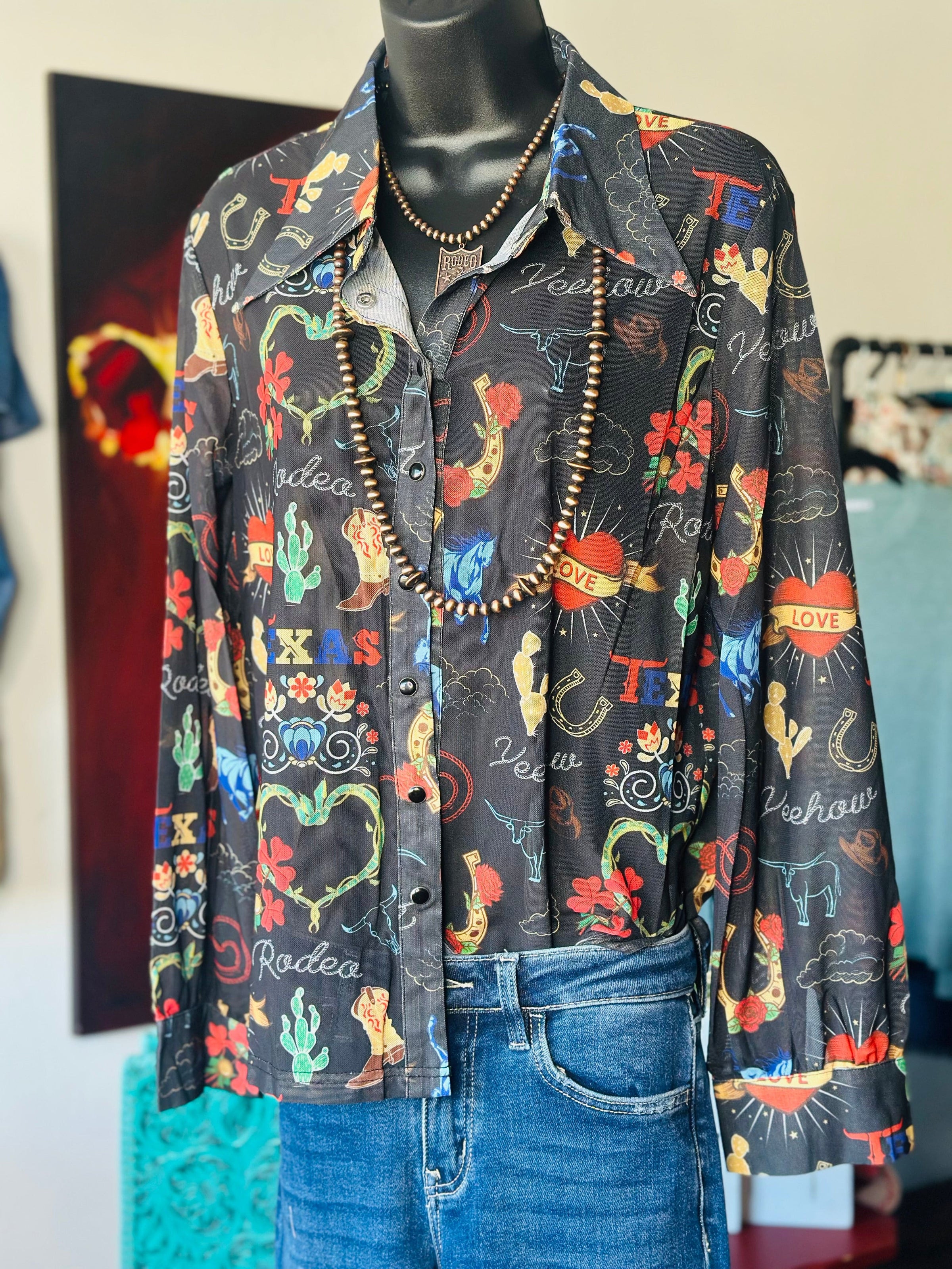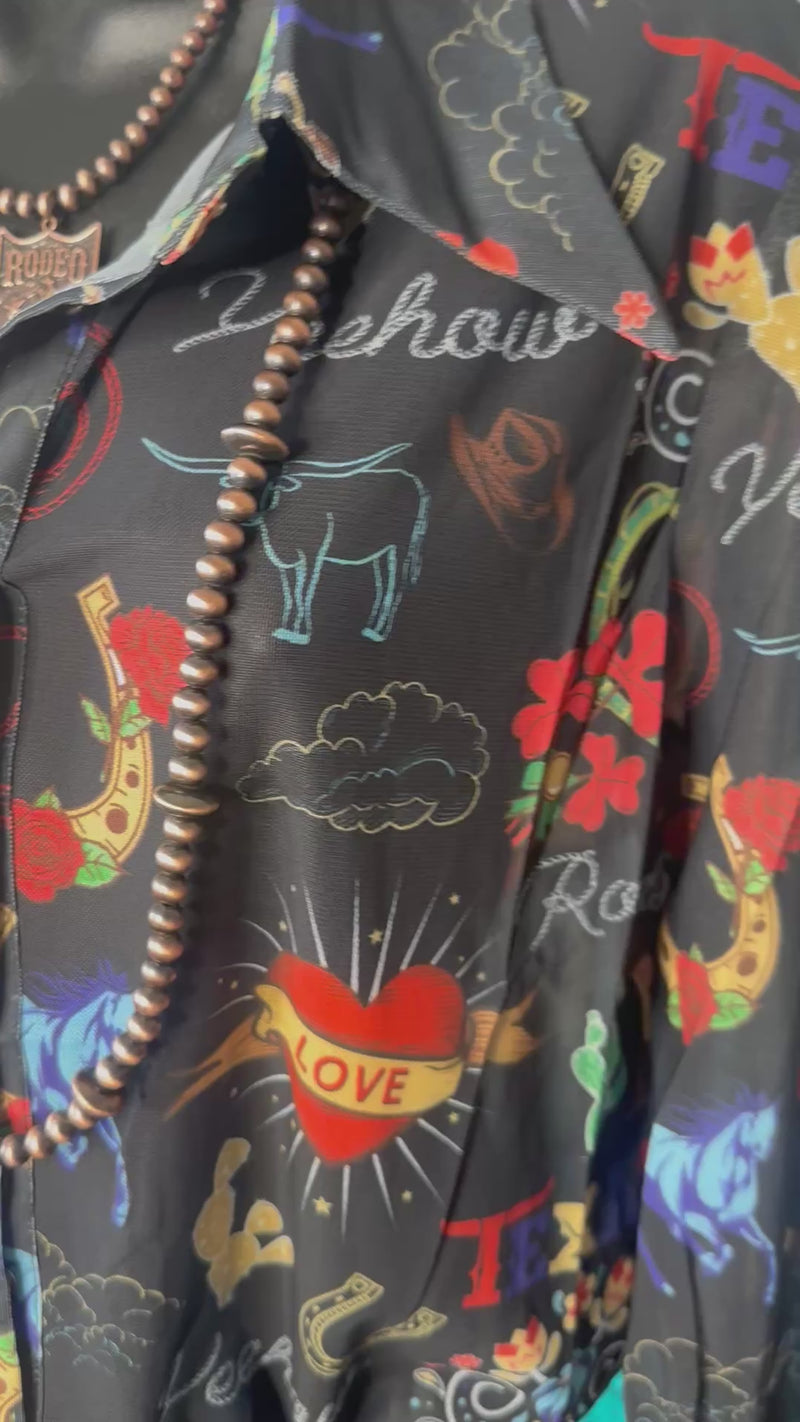 From one of my favorite makers, this top is gorgeous! All the fall vibes in this cowgirl approved pattern of boots, cowboys hats, and cactus all on the prettiest mesh top! This fun button up can be worn as a top or a jacket! Meets dress code for the arena too!