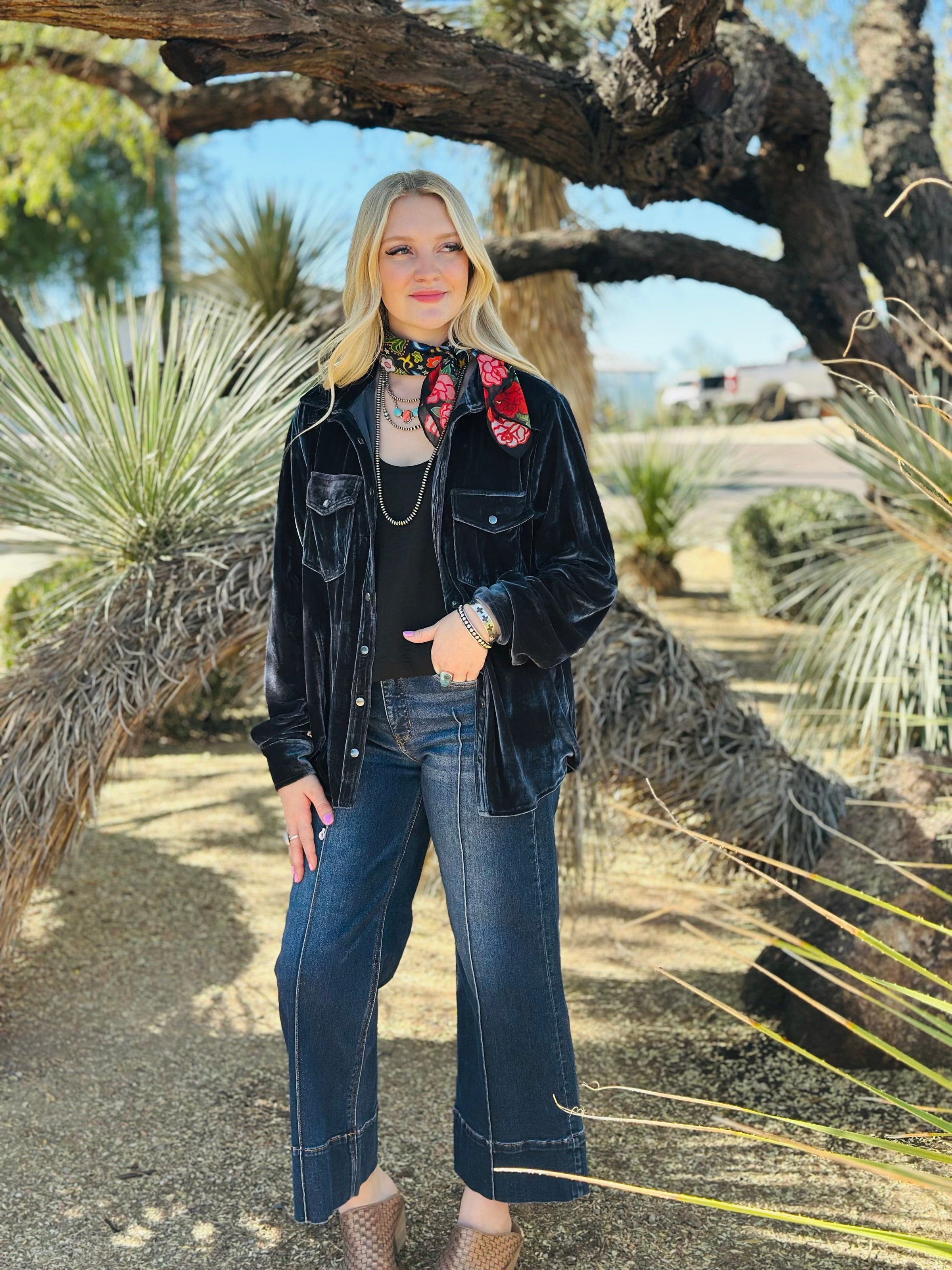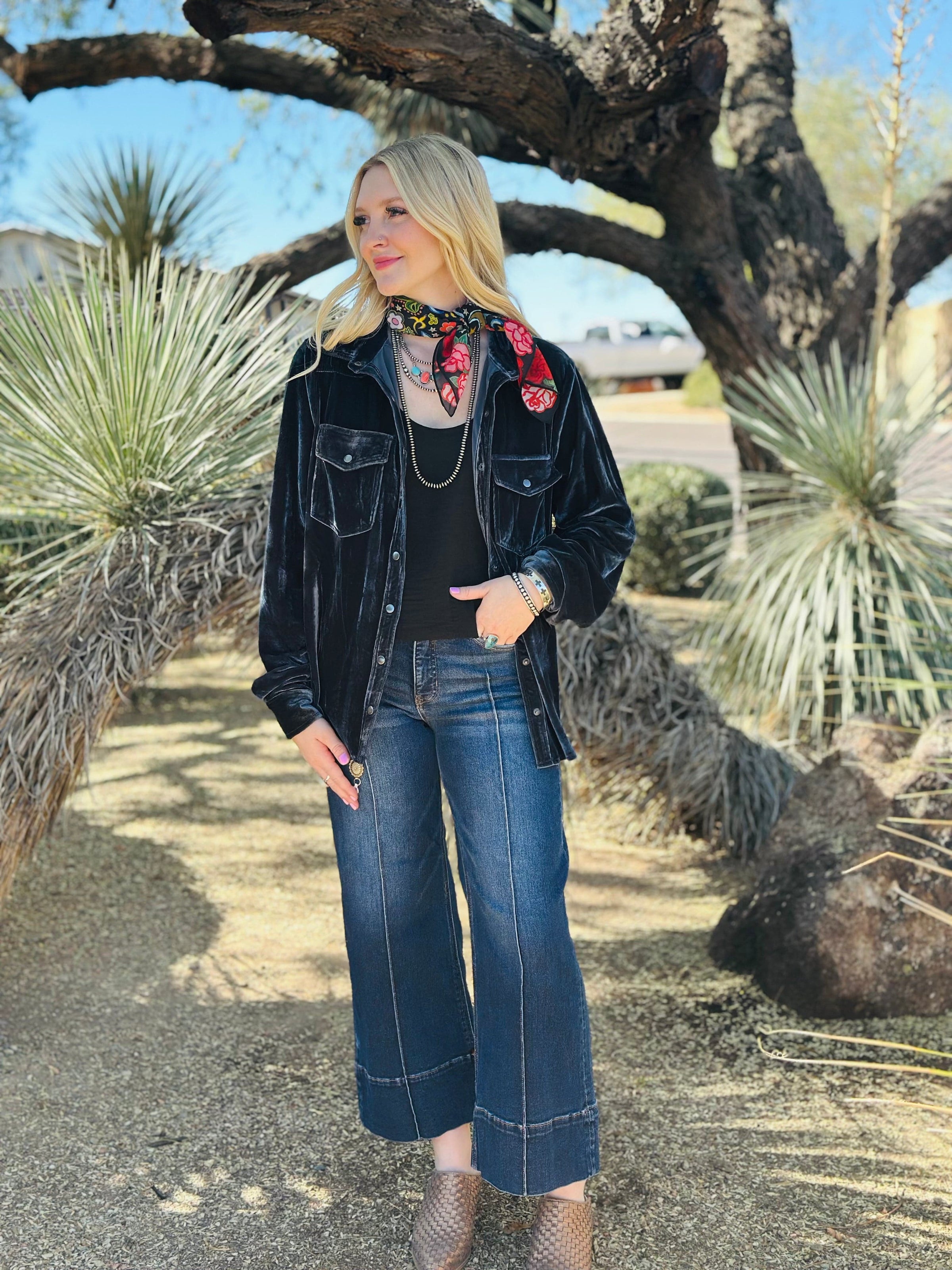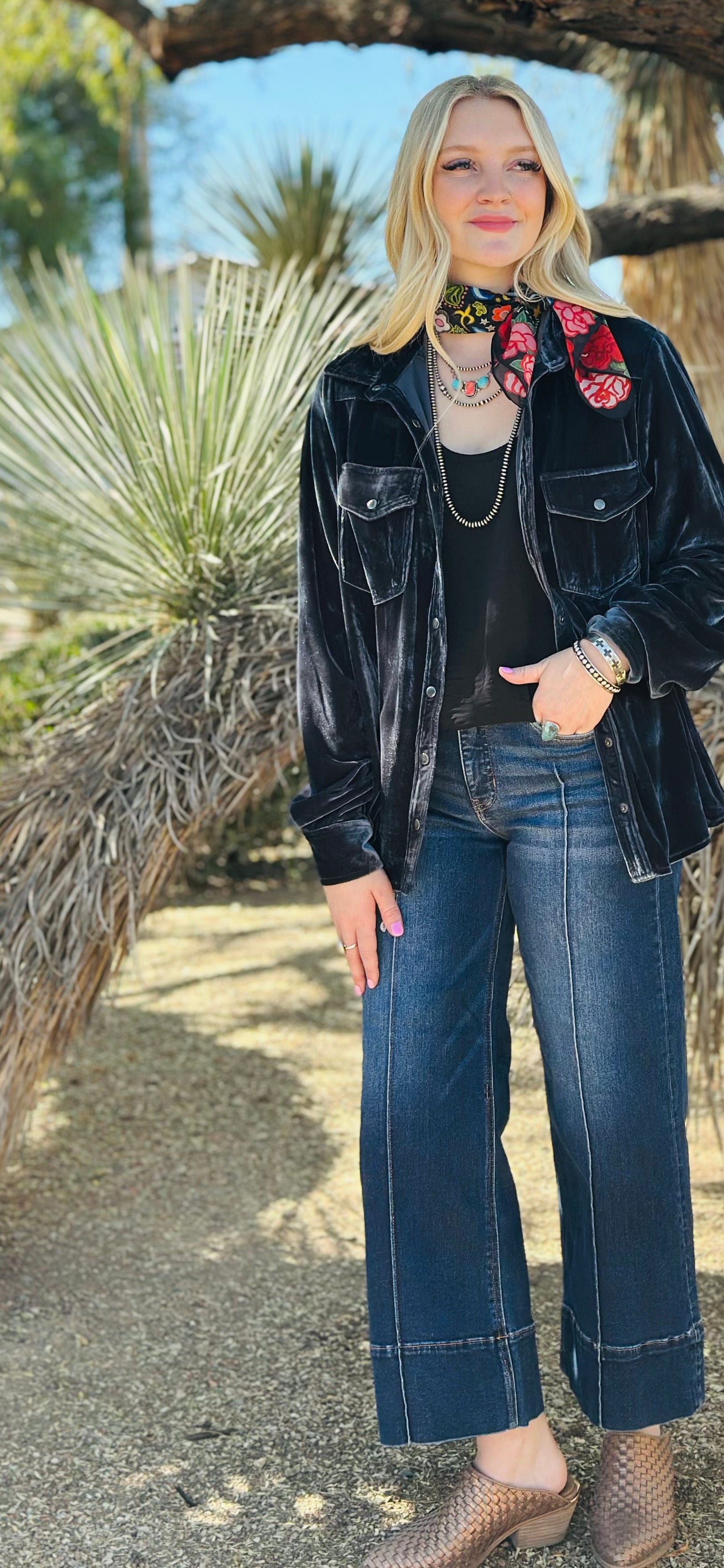 This Deep Teal Blue Velvet Jacket is pure western elegance š¤ š Styled like your favorite denim jacket but with the soft, luxe feel of velvet, itās the perfect mix of rodeo charm and holiday glam. The snap-front design and western yoke give it that true cowgirl touch, while the flattering fit makes it easy to dress up or wear casual.