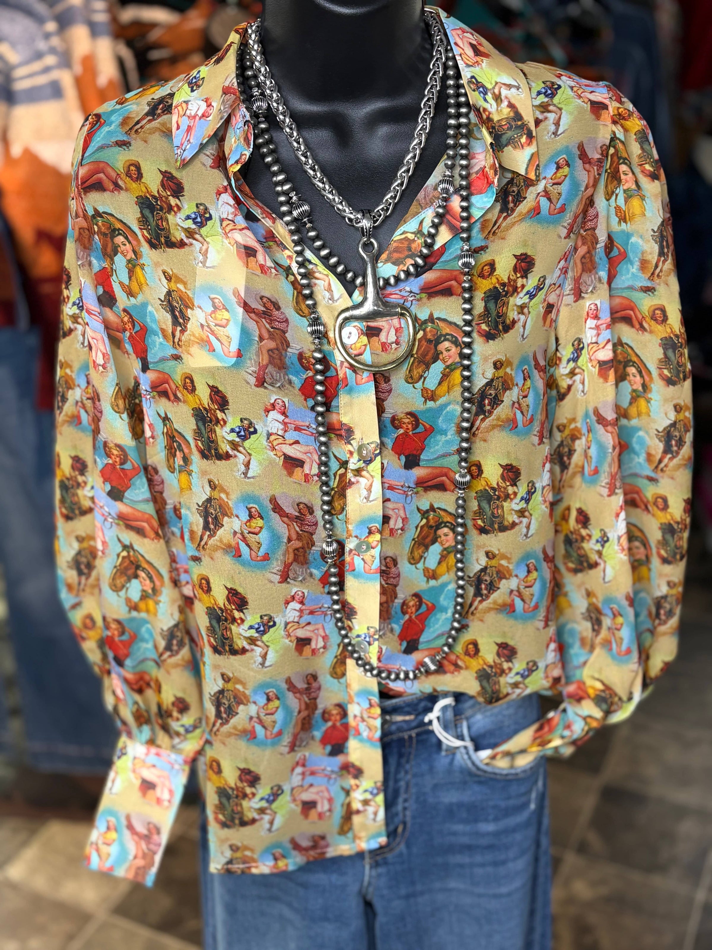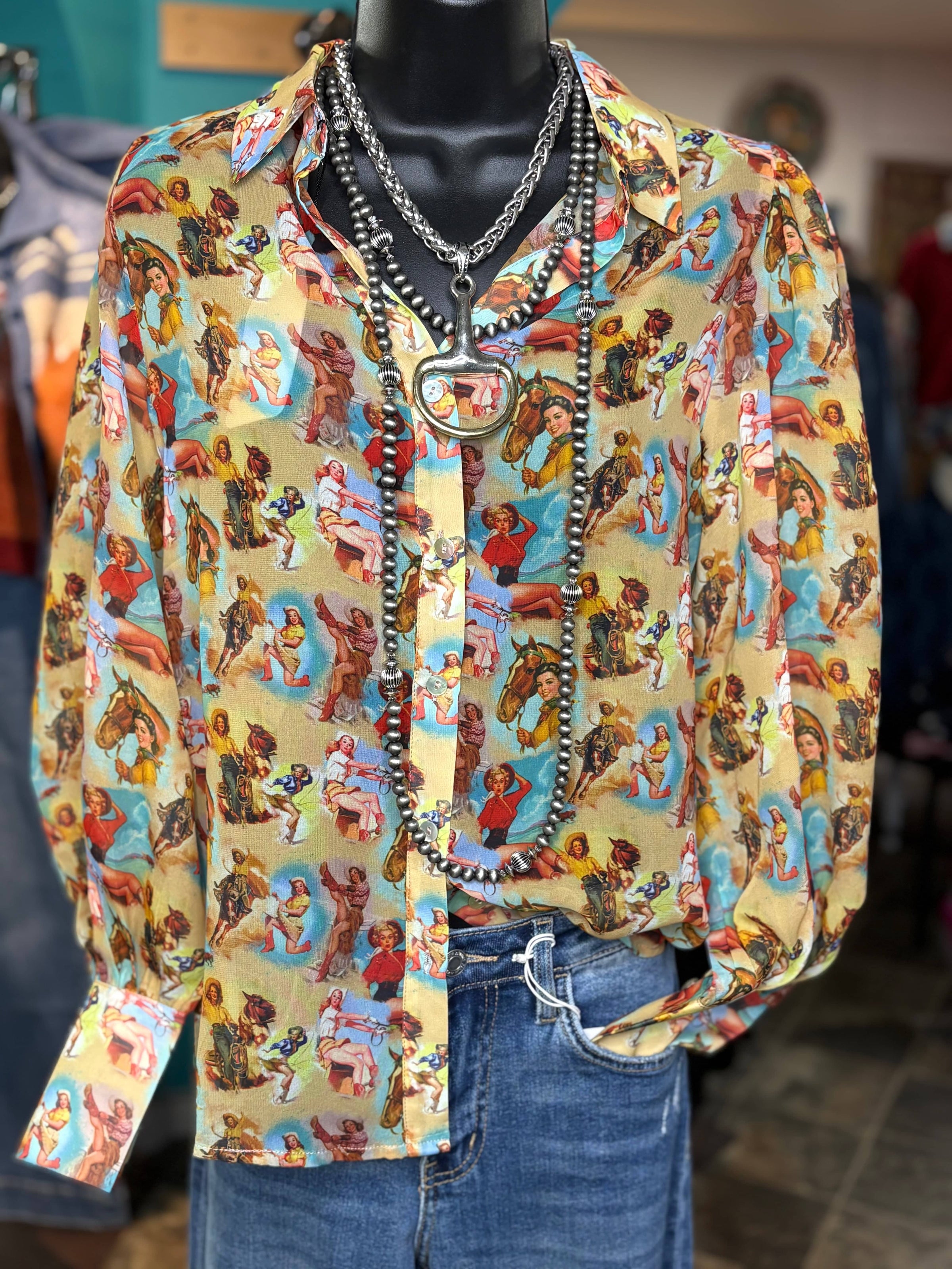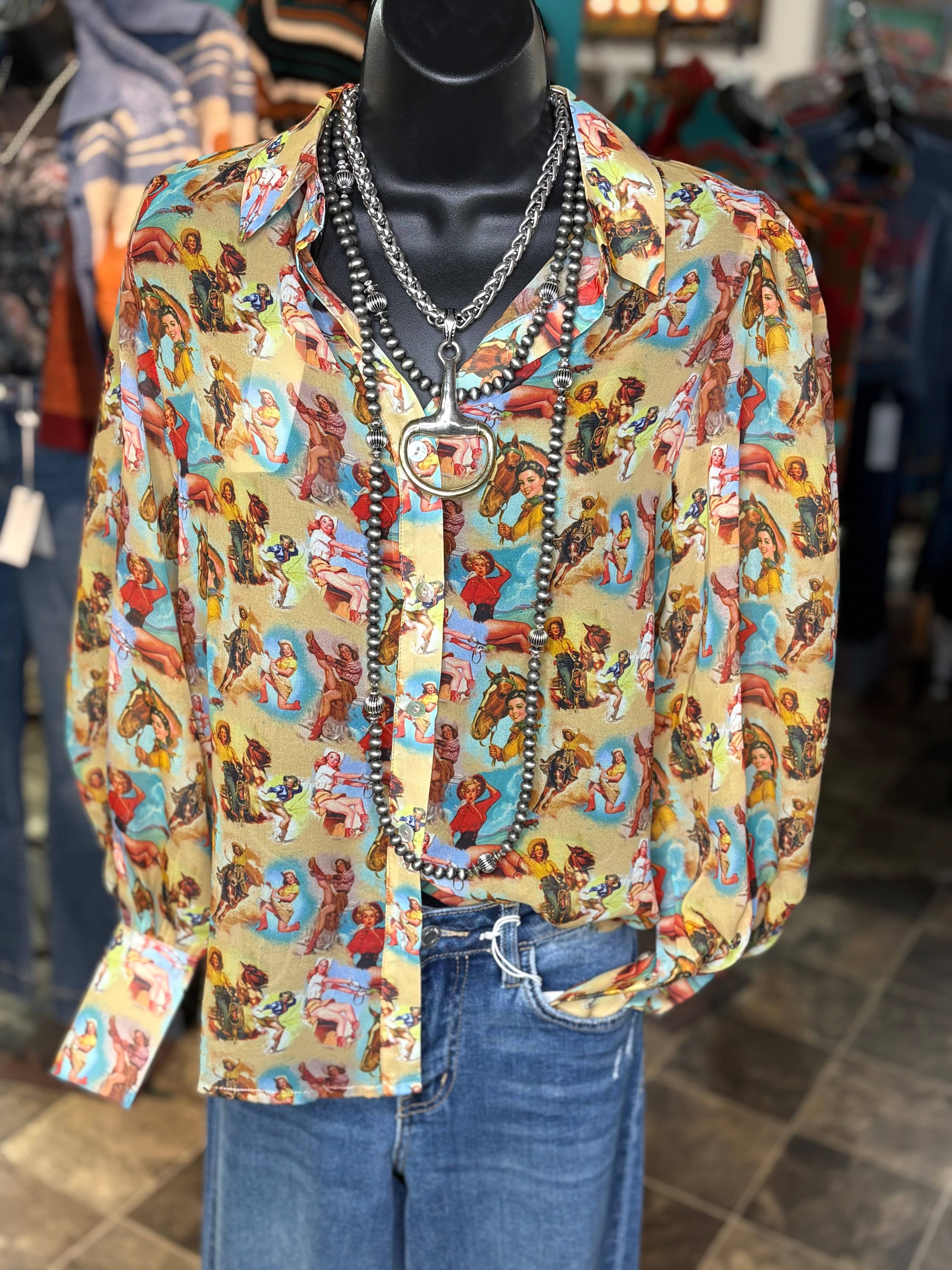 From one of my favorite makers, this top is gorgeous! A fun western pin up cowgirl pattern all on the prettiest chiffon top! This fun button up can be worn as a top or a jacket! Meets dress code for the arena too! We just got a restock - it sold out in a day at nfr!