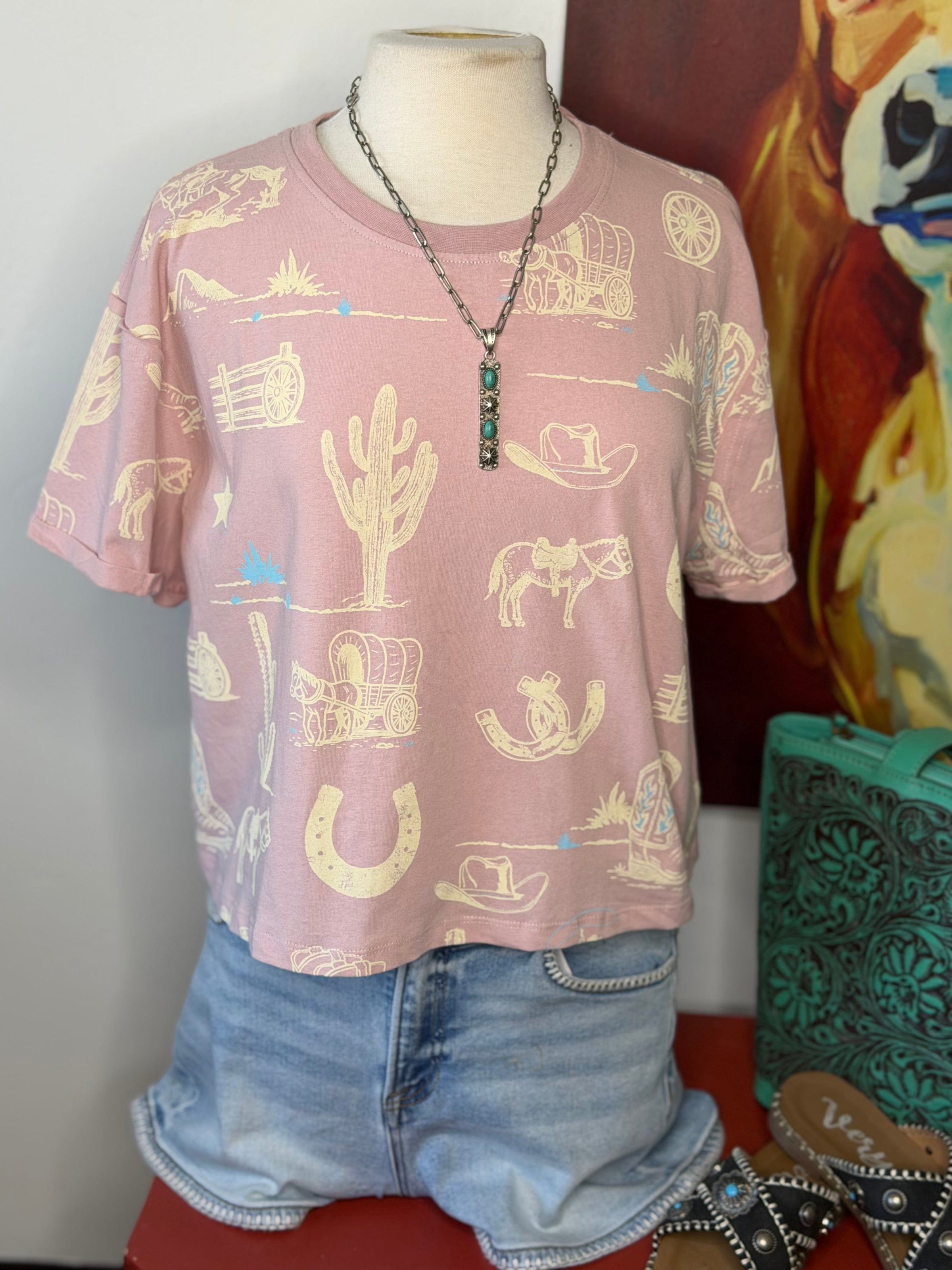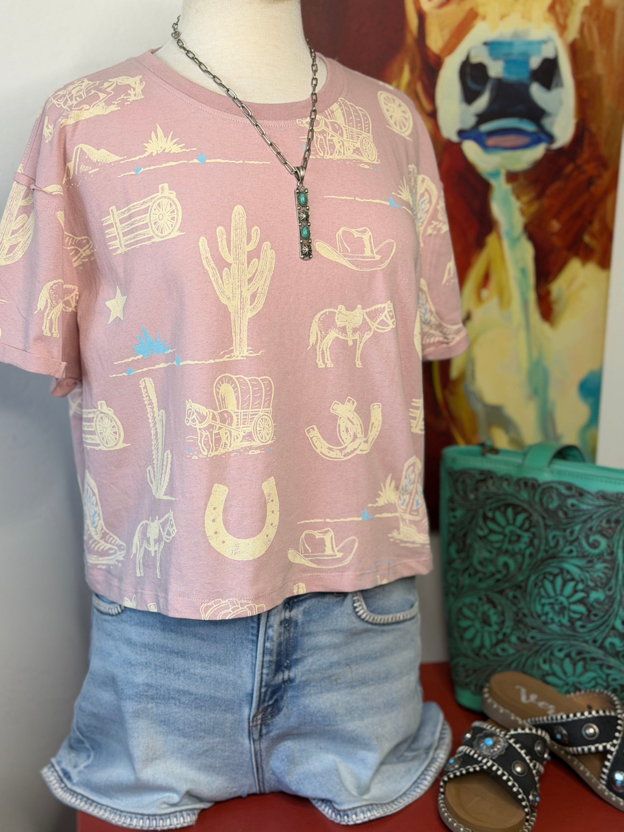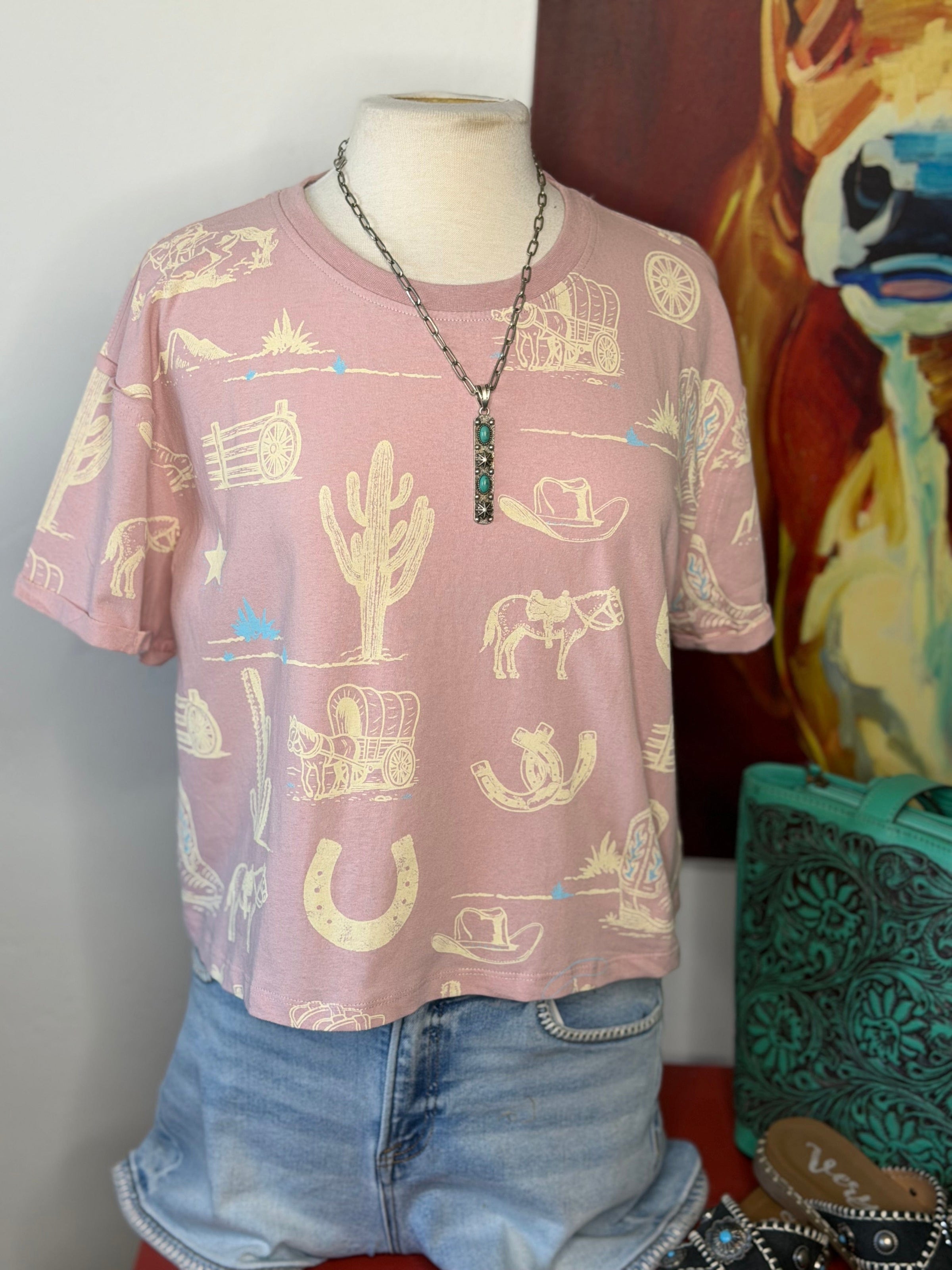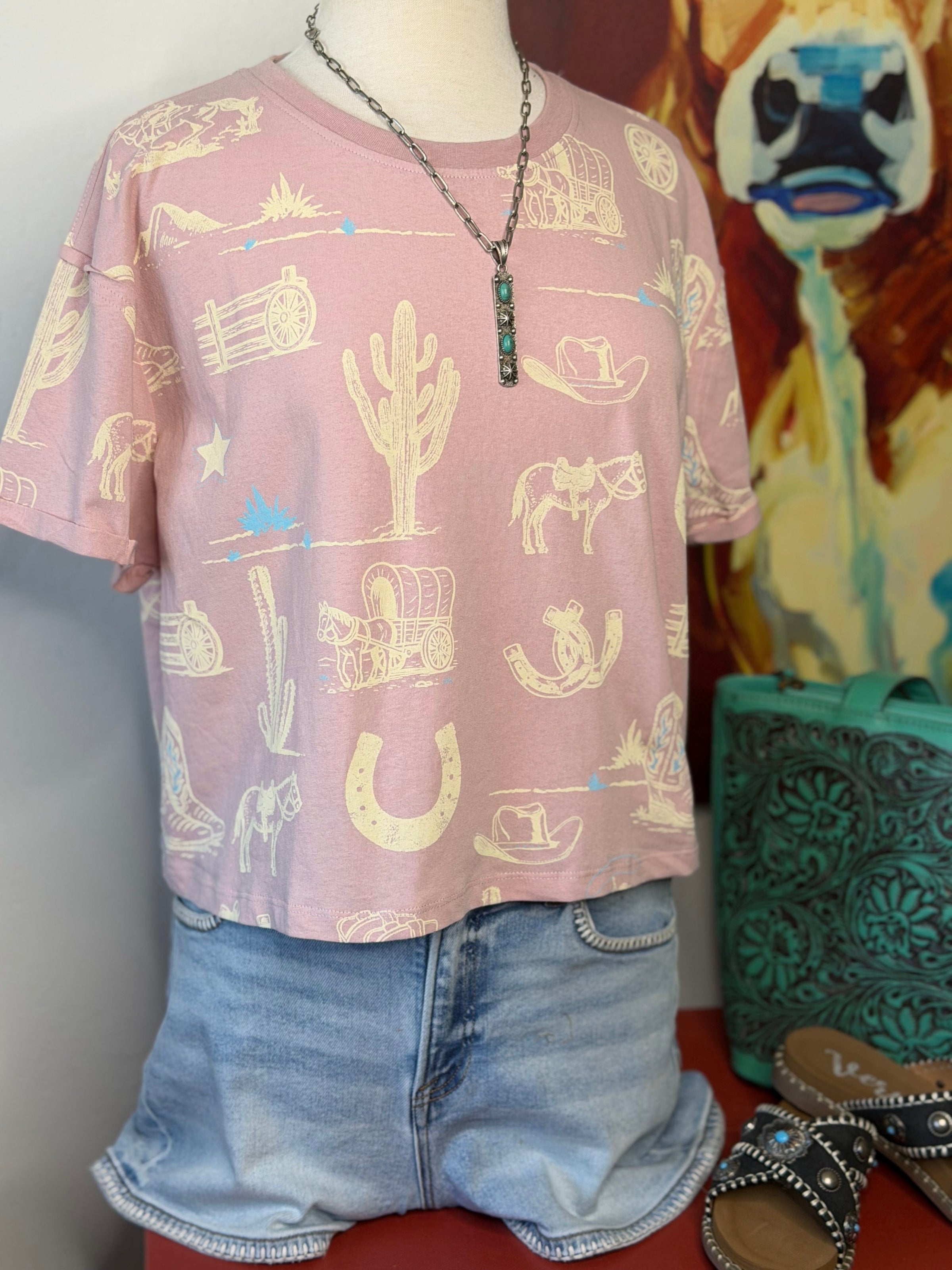 Super soft mom crop Tee from one of my fav makers, with a southwestern print featuring cactus, cowboy boots, horses & a desert scene  - this is my new personal fav!  Cute cuff sleeve and a roomy fit that’s just perfect for fall!  Looks great with denim too