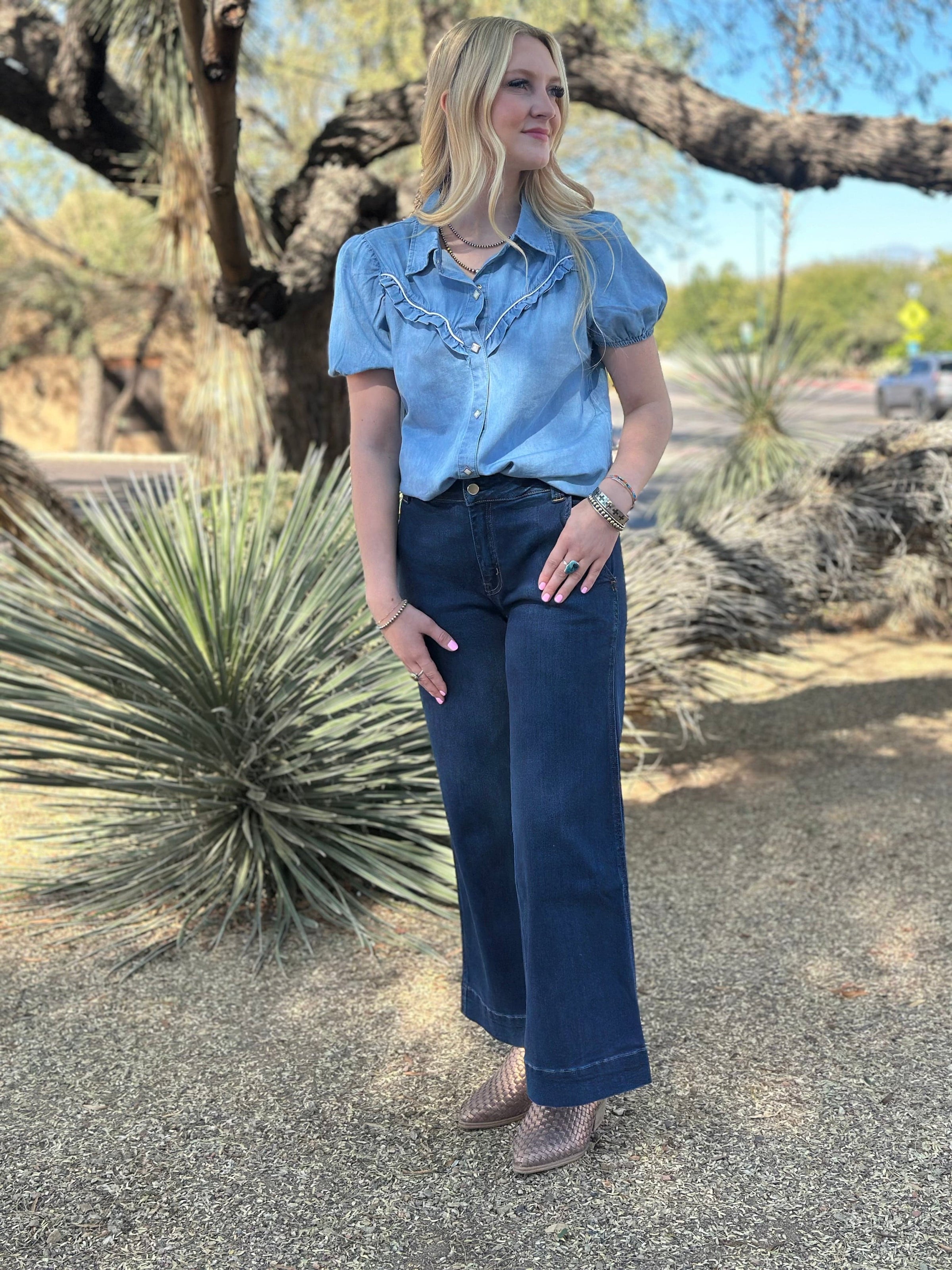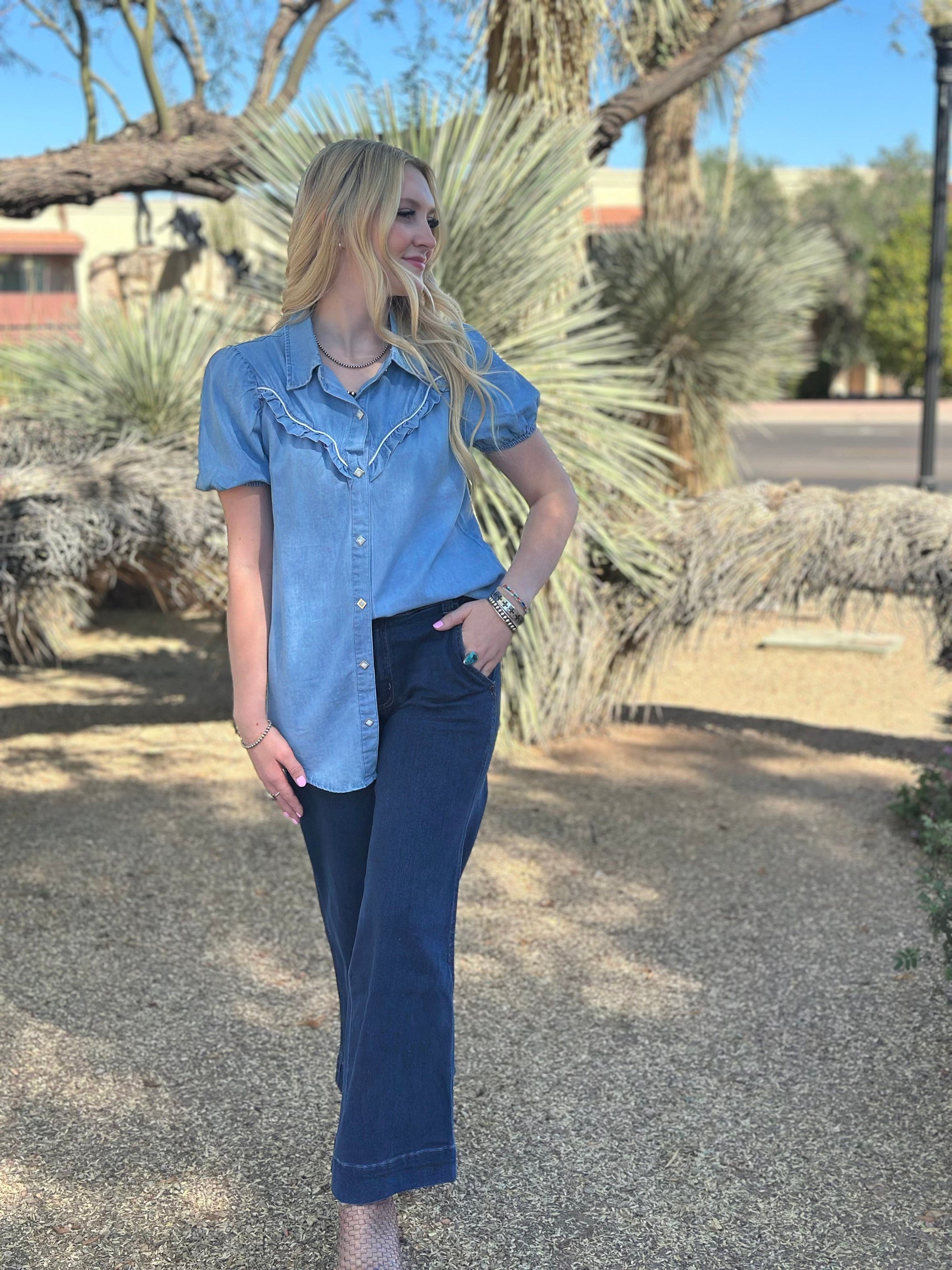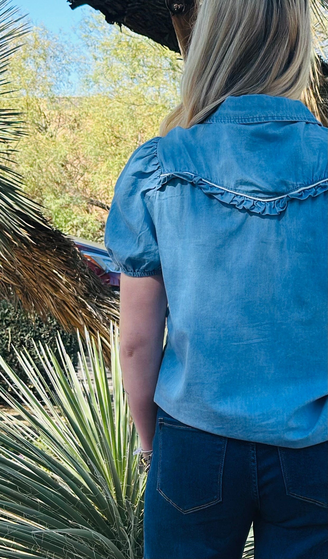 Soft and sweet with a Western twist — this chambray top is a must-have! Crafted from soft, lightweight chambray fabric, it features charming puff sleeves and delicate piping with ruffle details along the front and back for a touch of feminine flair. Finished with a classic pearl snap front, this top perfectly blends cowgirl charm with everyday comfort.