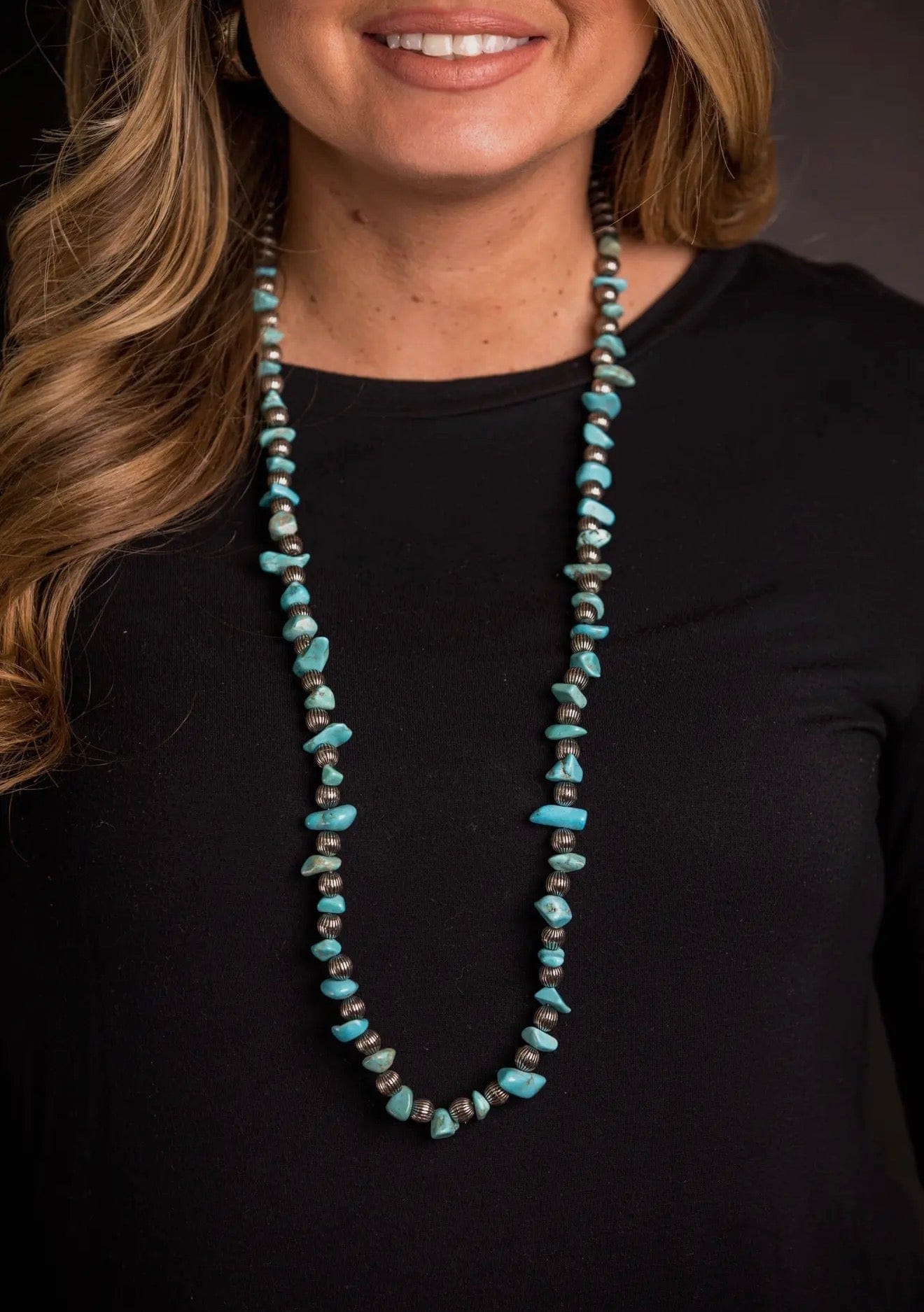 The 32-inch length makes it perfect for layering over graphic tees, Aztec cardigans, denim jackets, or rodeo-ready dresses. Whether you’re styling for everyday Western wear, a country concert, or NFR season, this turquoise statement necklace adds Southwestern charm and vibrant color.
