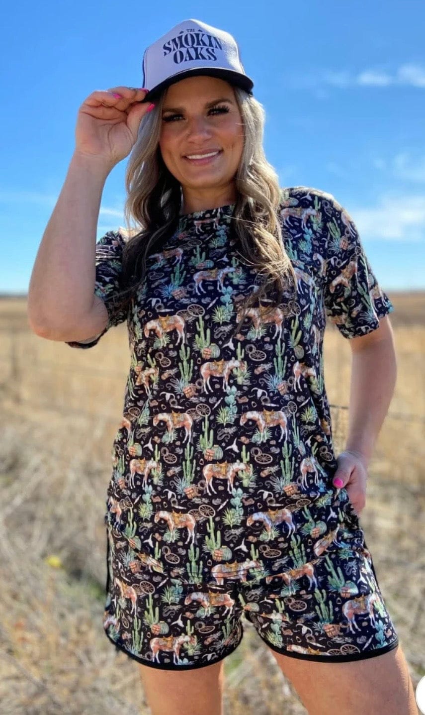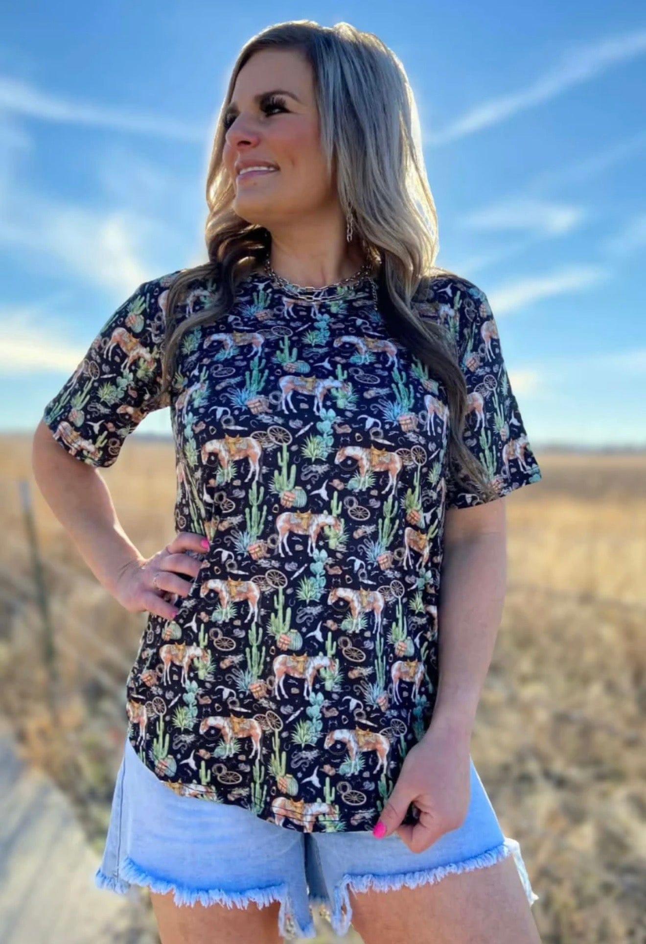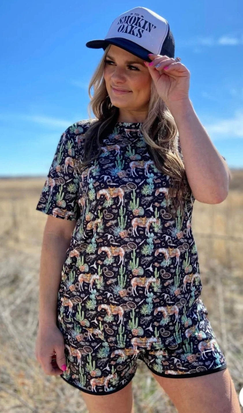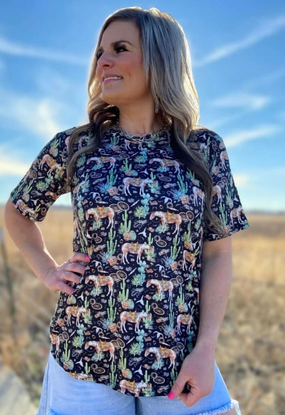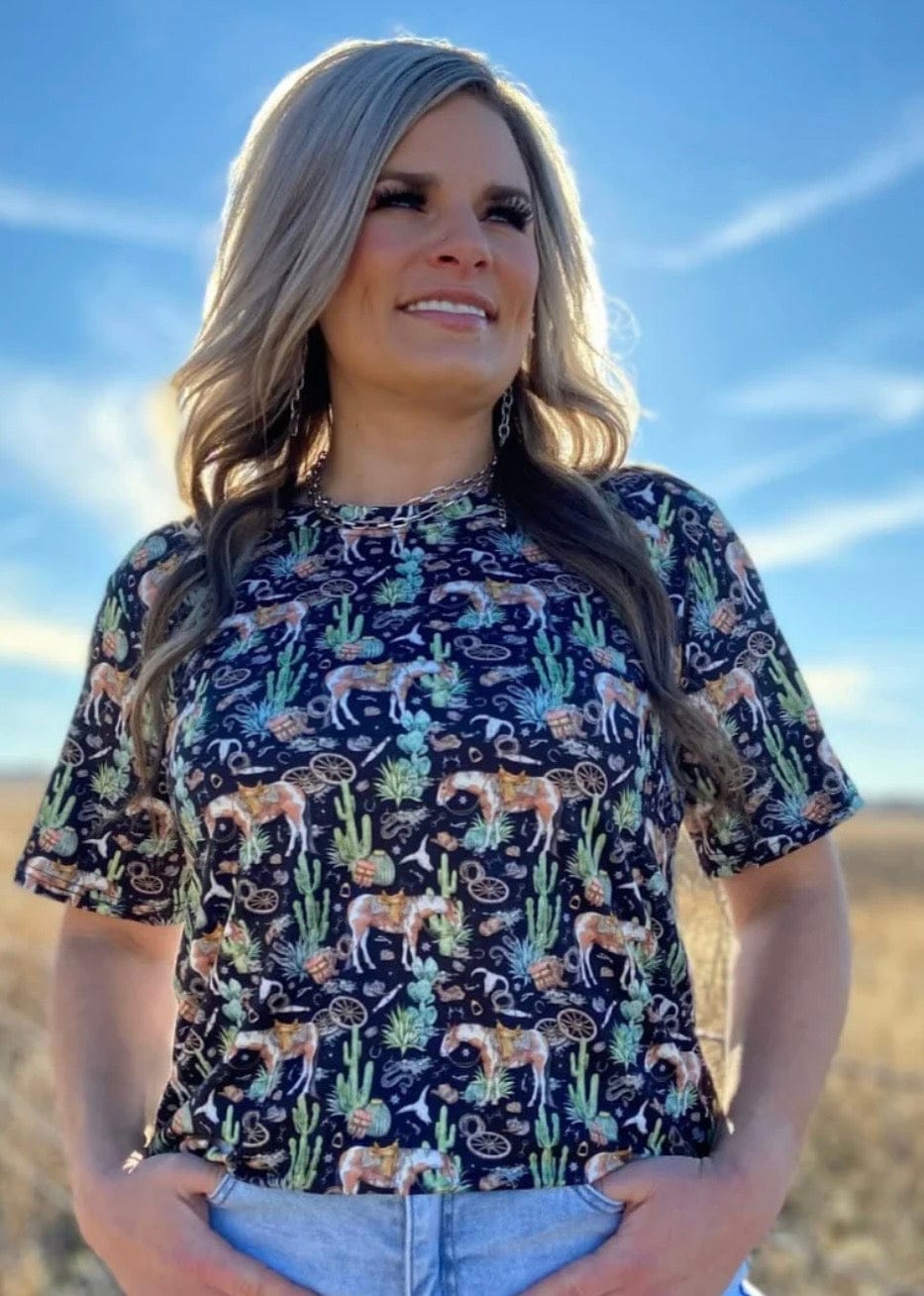 Bring the desert vibes wherever you go in our Summer Of Cactus Top 🌵✨ This fun black top features our favorite horses, desert cacti, and Southwest-inspired artwork that captures the spirit of the open range. Bold, playful, and full of western charm, it’s the perfect piece for cowgirls who love a little desert attitude in their style.