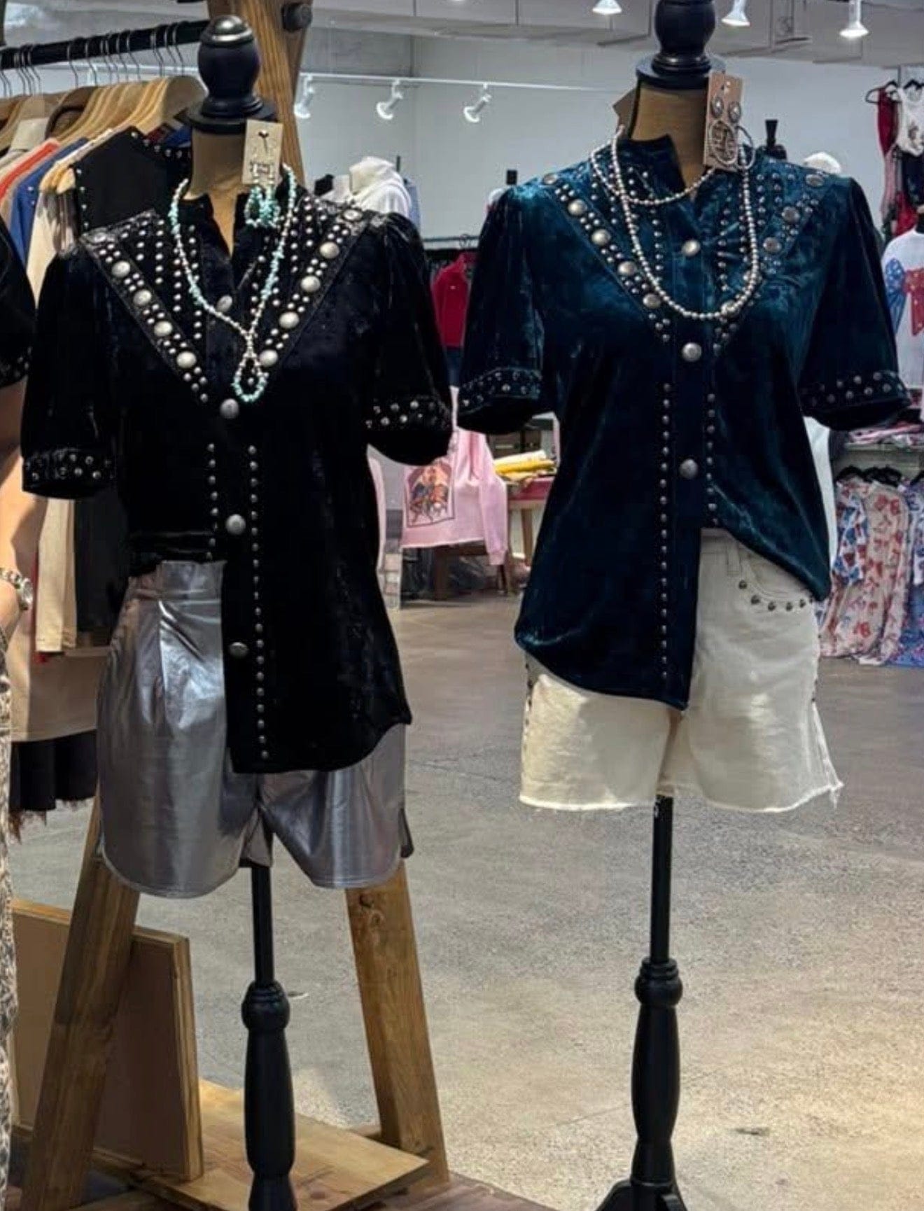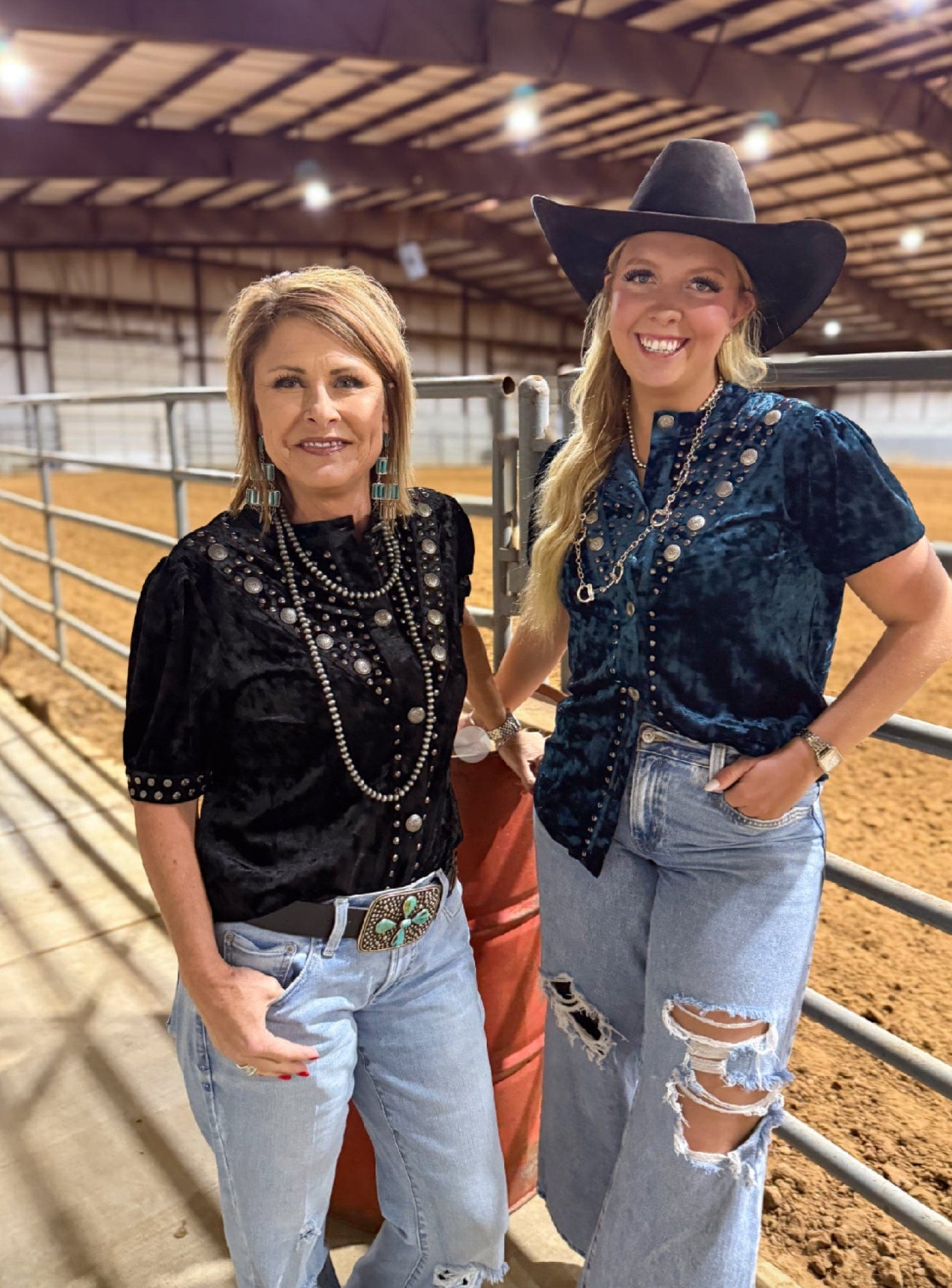This gorgeous teal velvet piece features eye-catching studded details and a classic Old Southwest style we can’t get enough of. The rich velvet texture paired with the bold teal color gives it a timeless Western feel that’s both elevated and wearable. Perfect for dressing up your everyday cowgirl look or adding a statement piece to your rodeo-ready wardrobe. A must-have for lovers of vintage Western style and Southwest-inspired fashion.