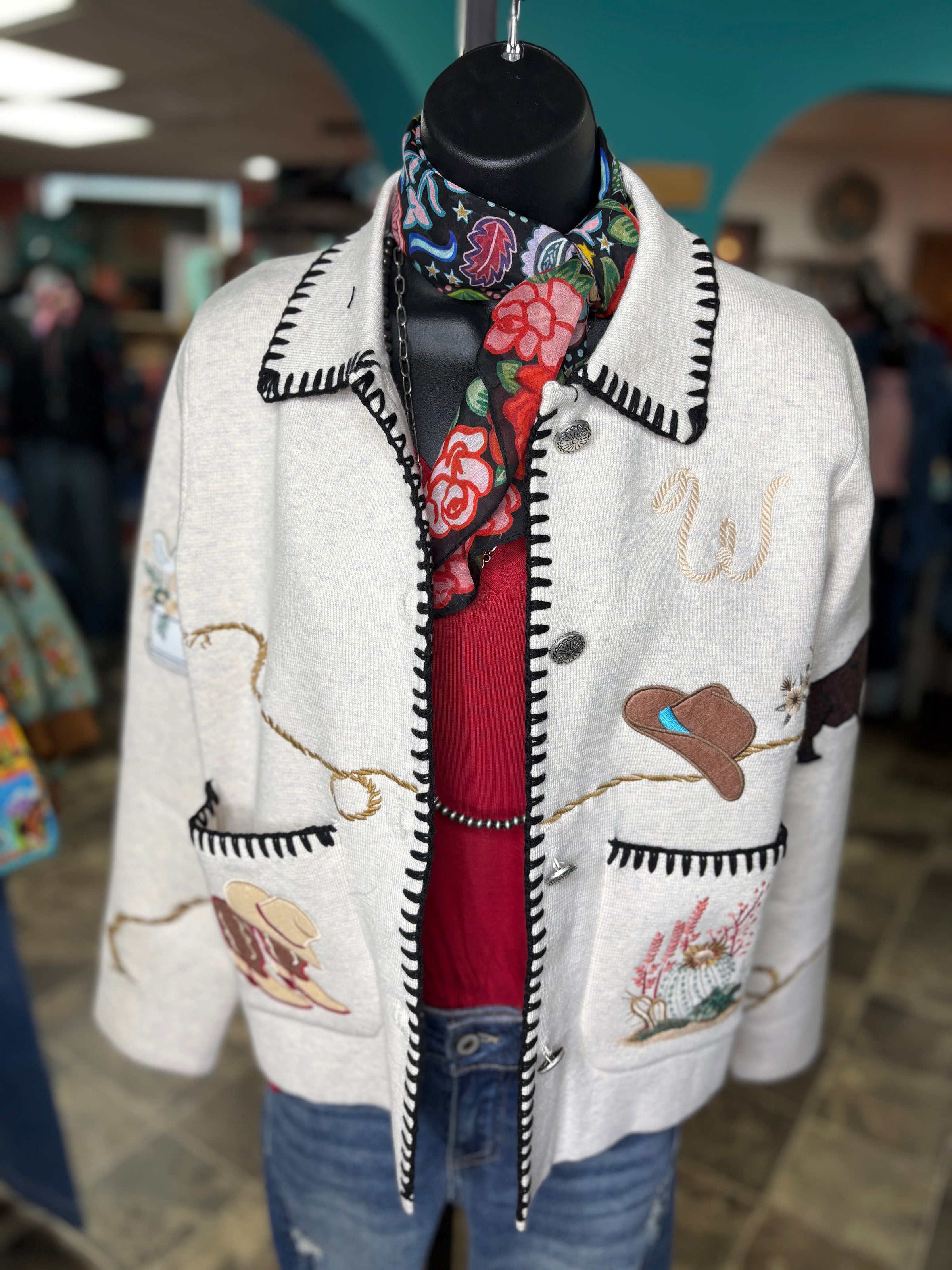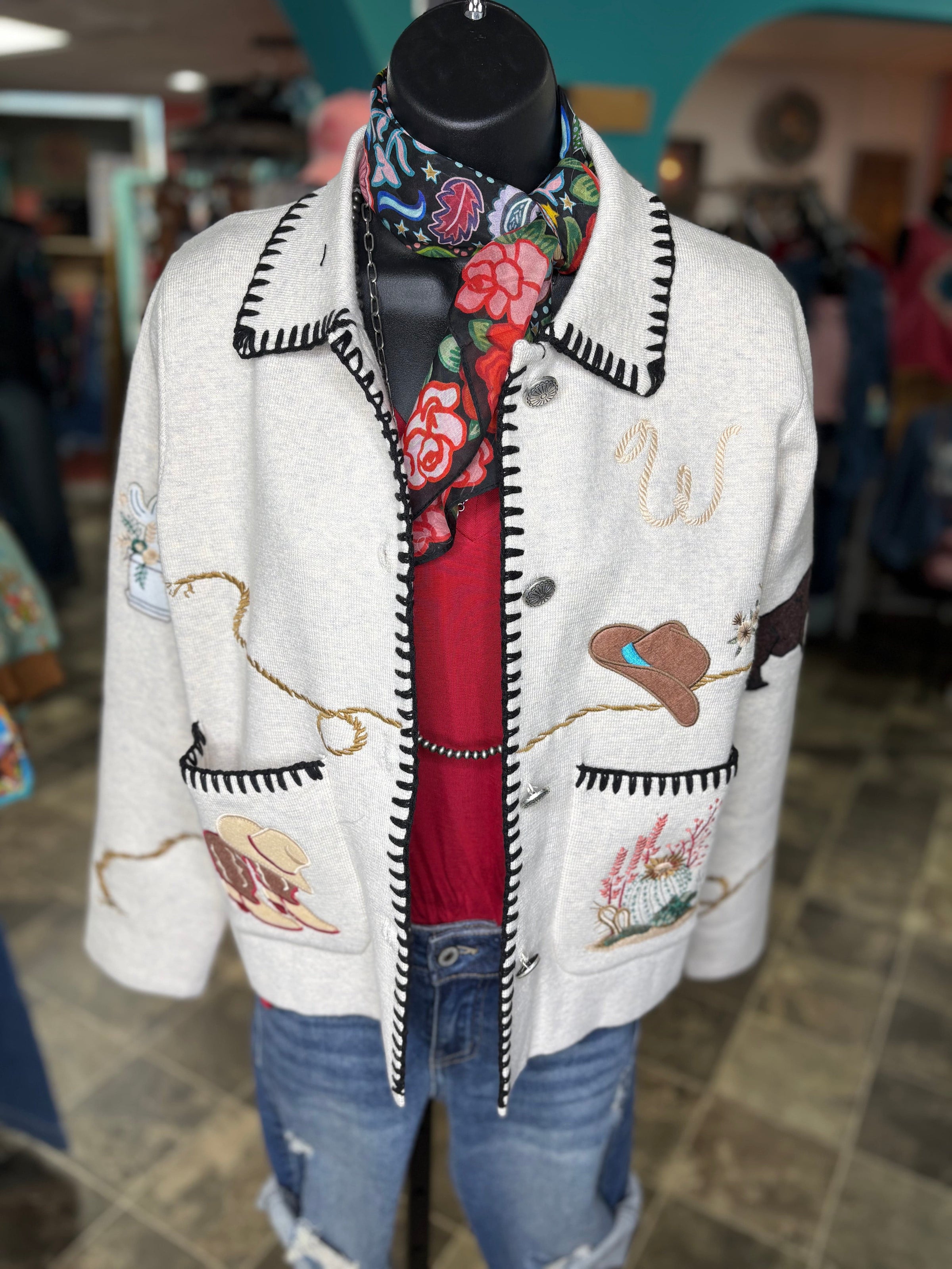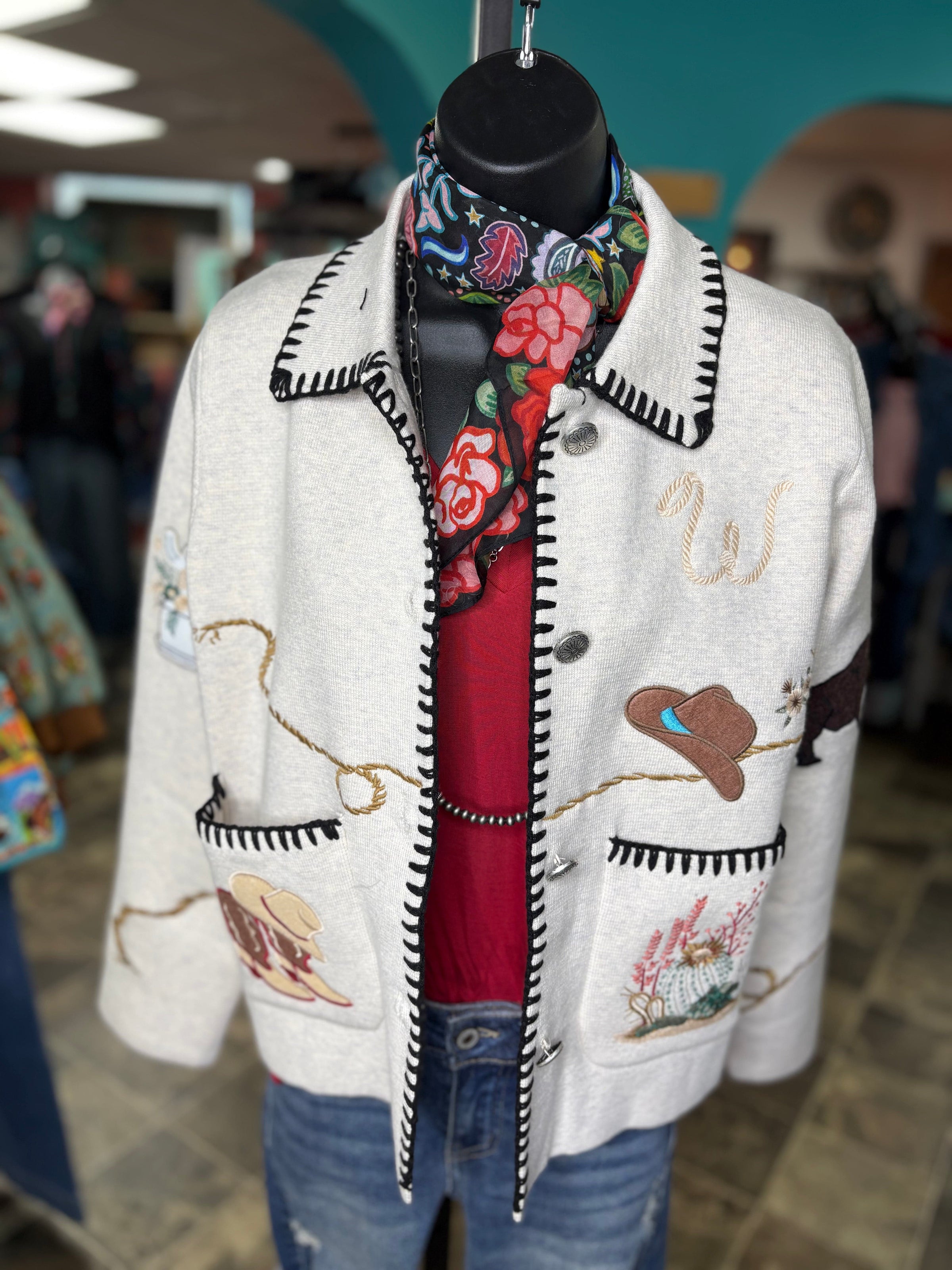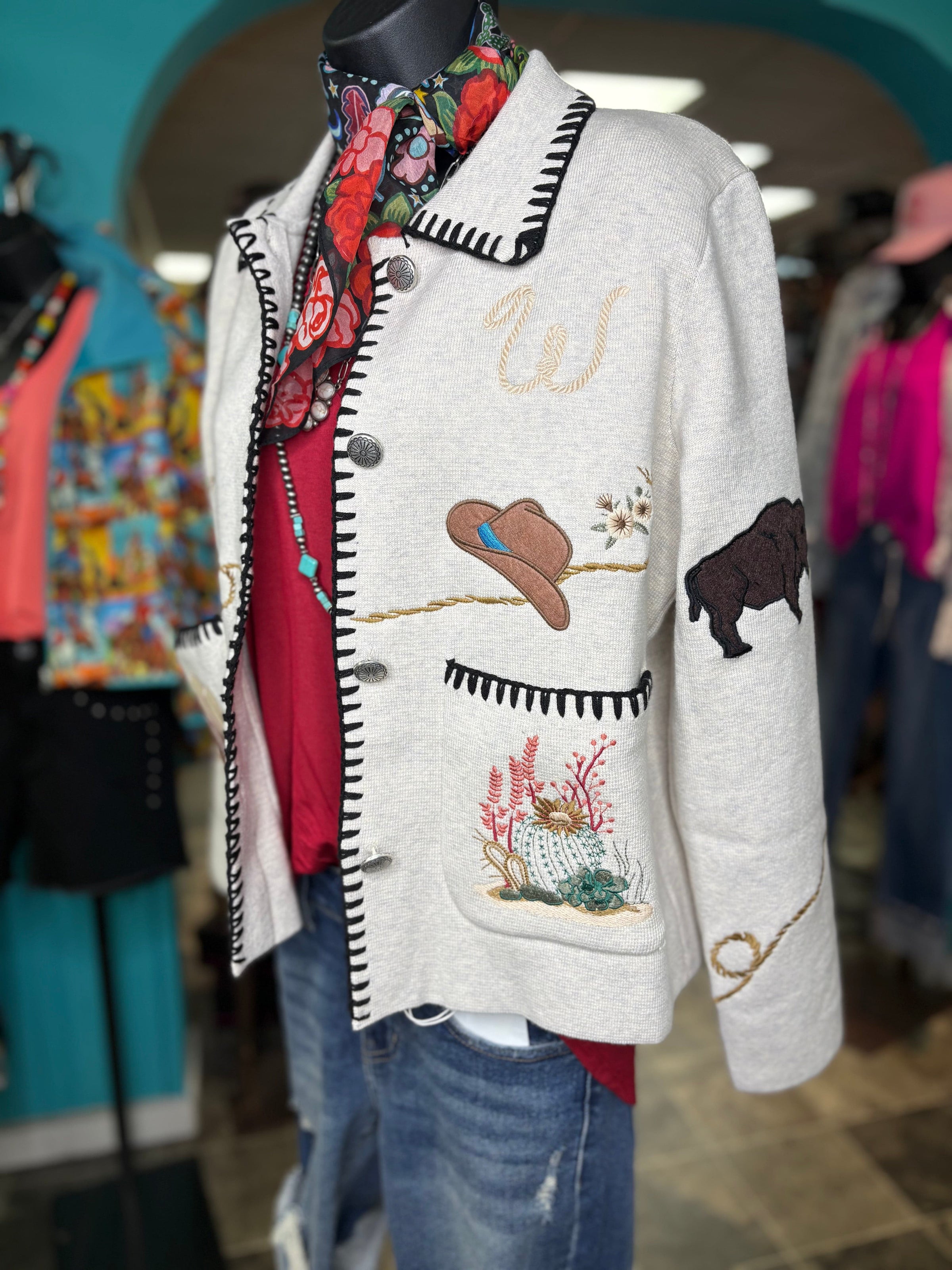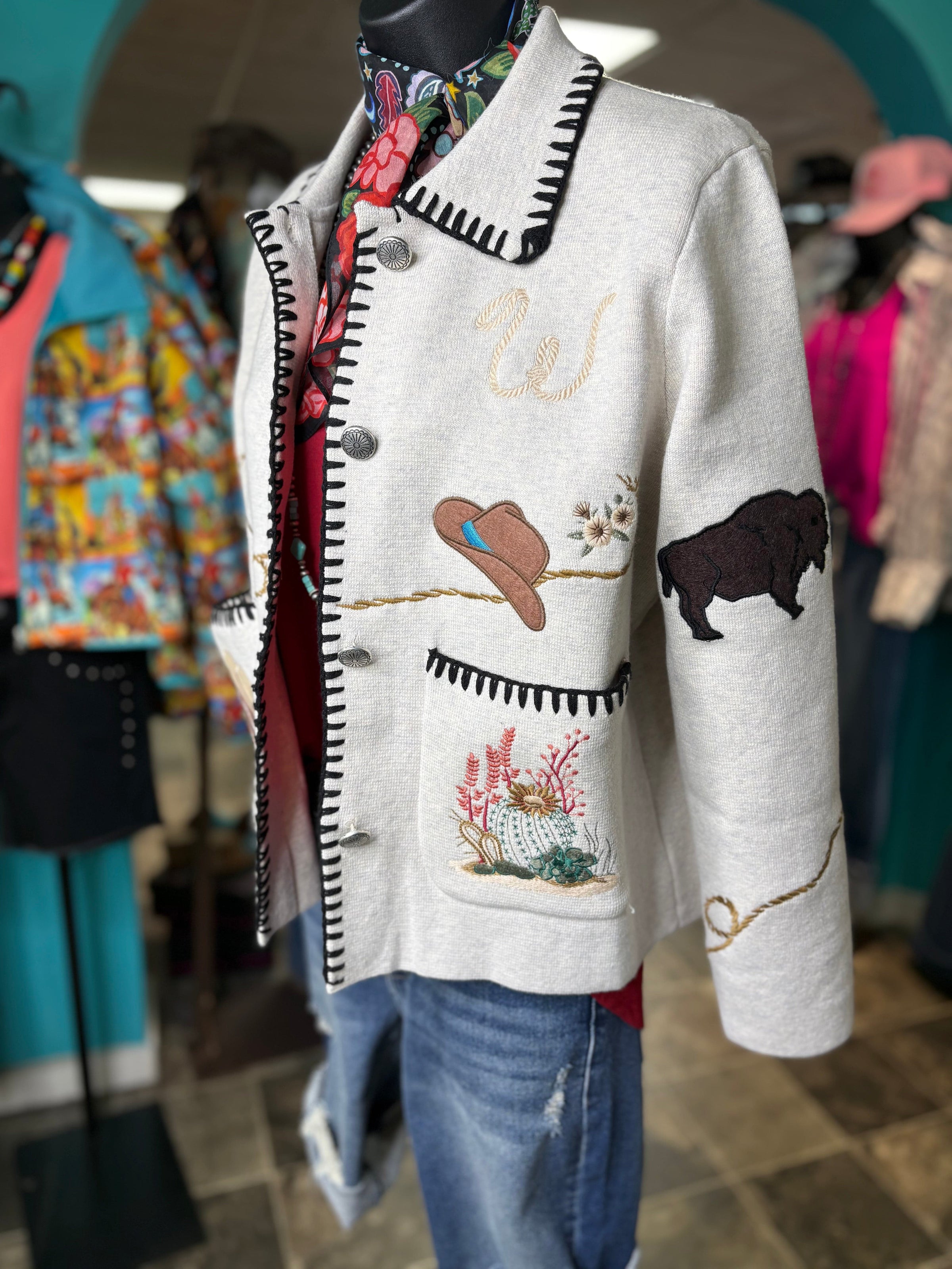 Get ready to turn heads, cowgirl — this western beauty is serving full Southwest style! From the embroidered cactus and steerhead details to the rope-border trim and whip stitch, every inch of this piece screams rodeo-ready charm. It’s warm, it’s bold, and it’s basically your new statement jacket for every western adventure.