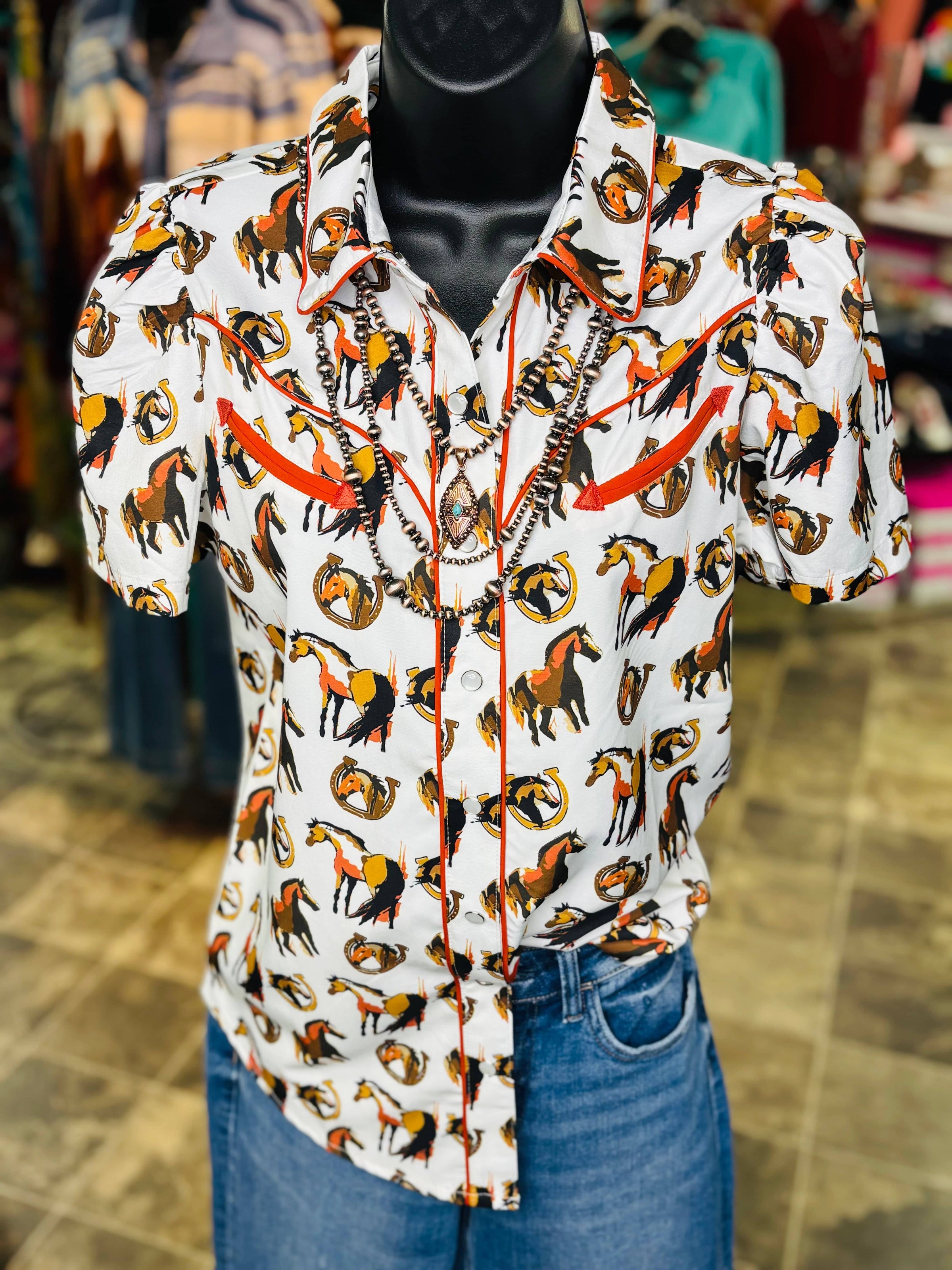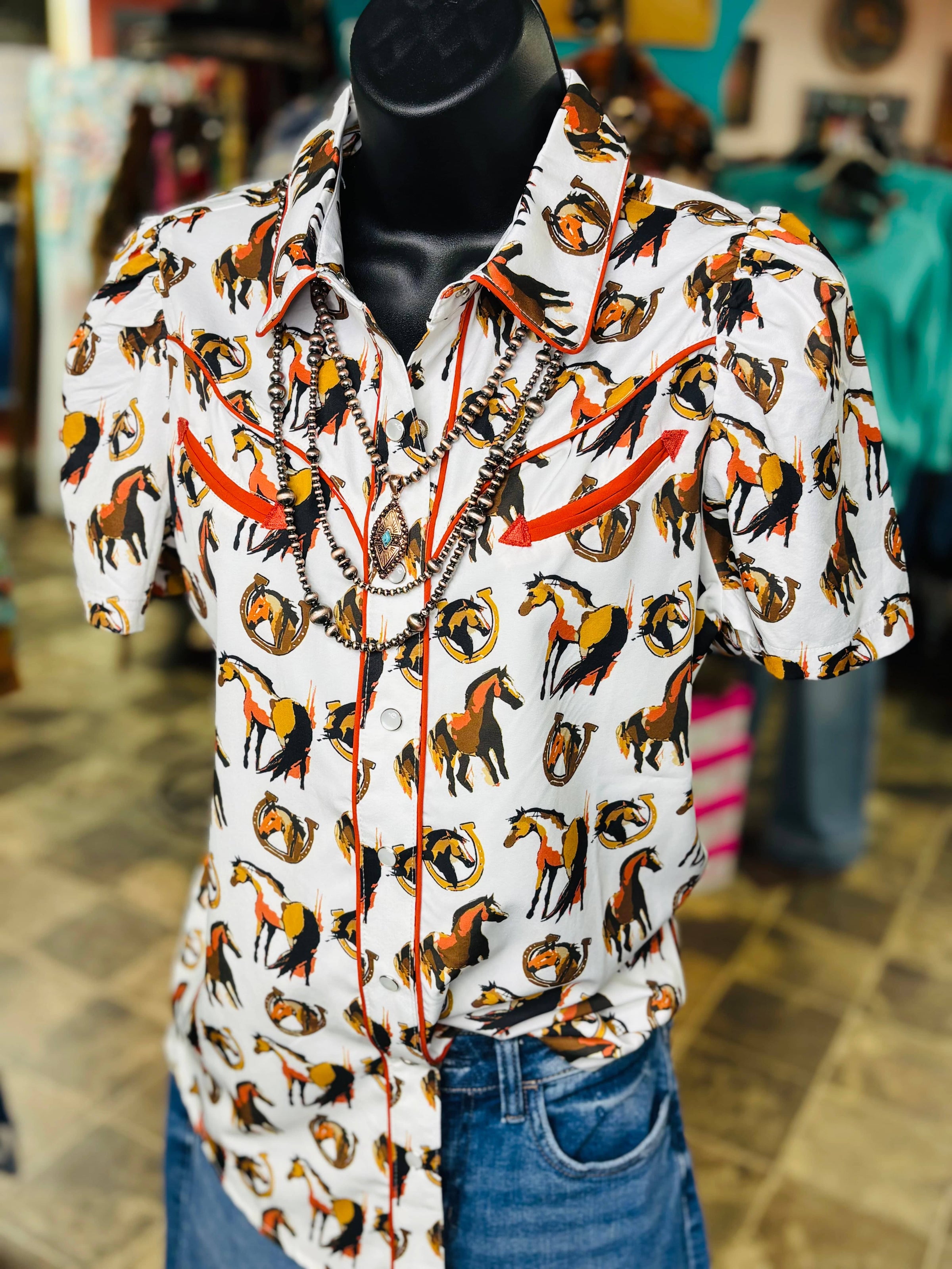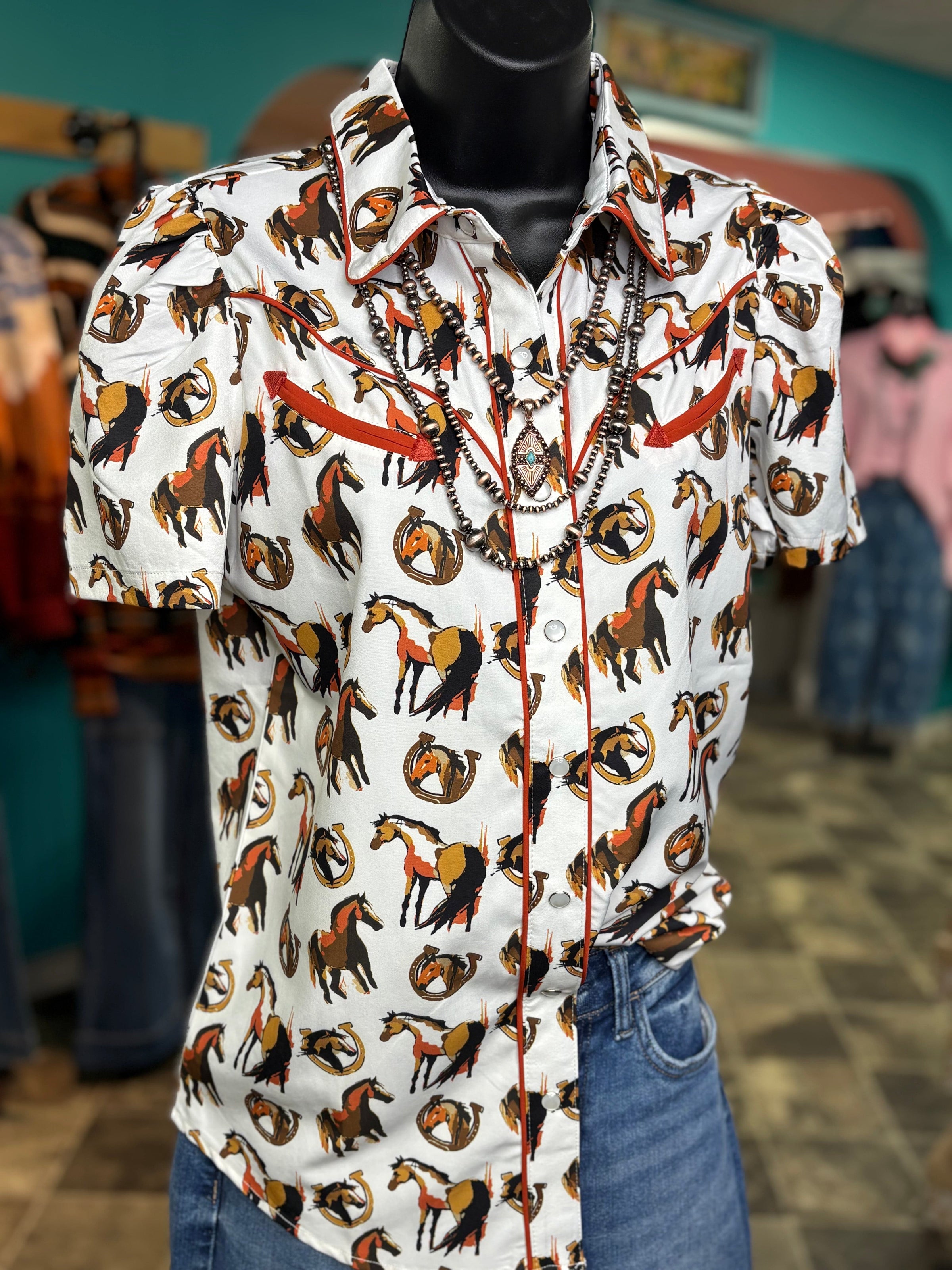 The Winnemucca Days Retro Western Horses Top will have you feeling like a true rodeo star with its western styled piping, smile pockets, and snap front. This flash back styled top is both adorable and functional, perfect for wrangling horses or just looking stylish!
