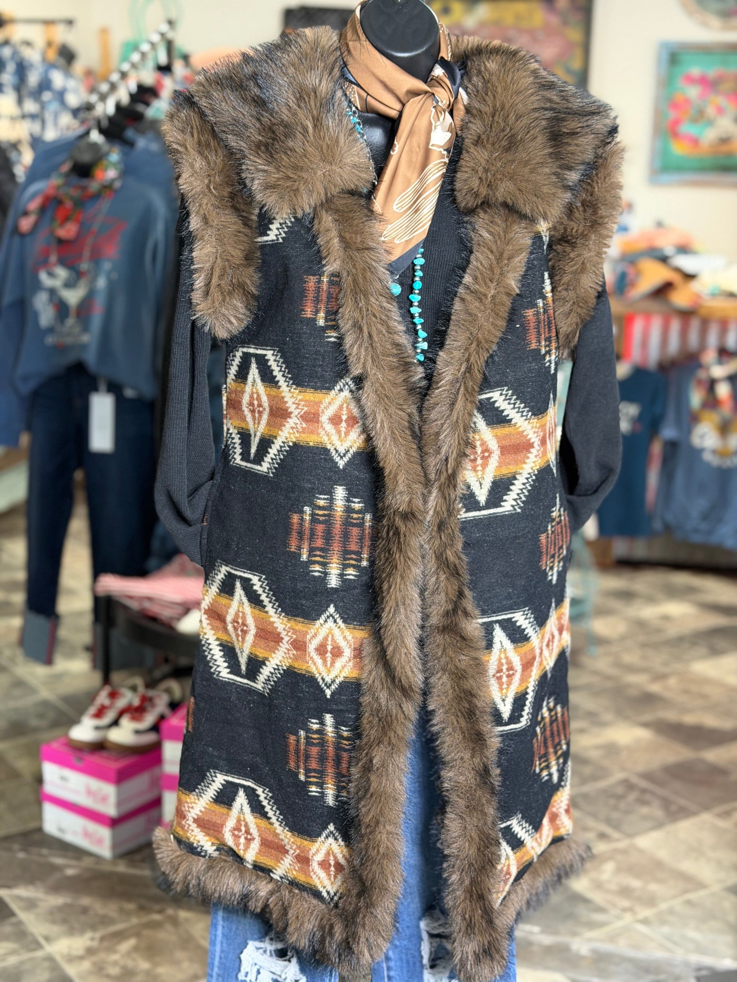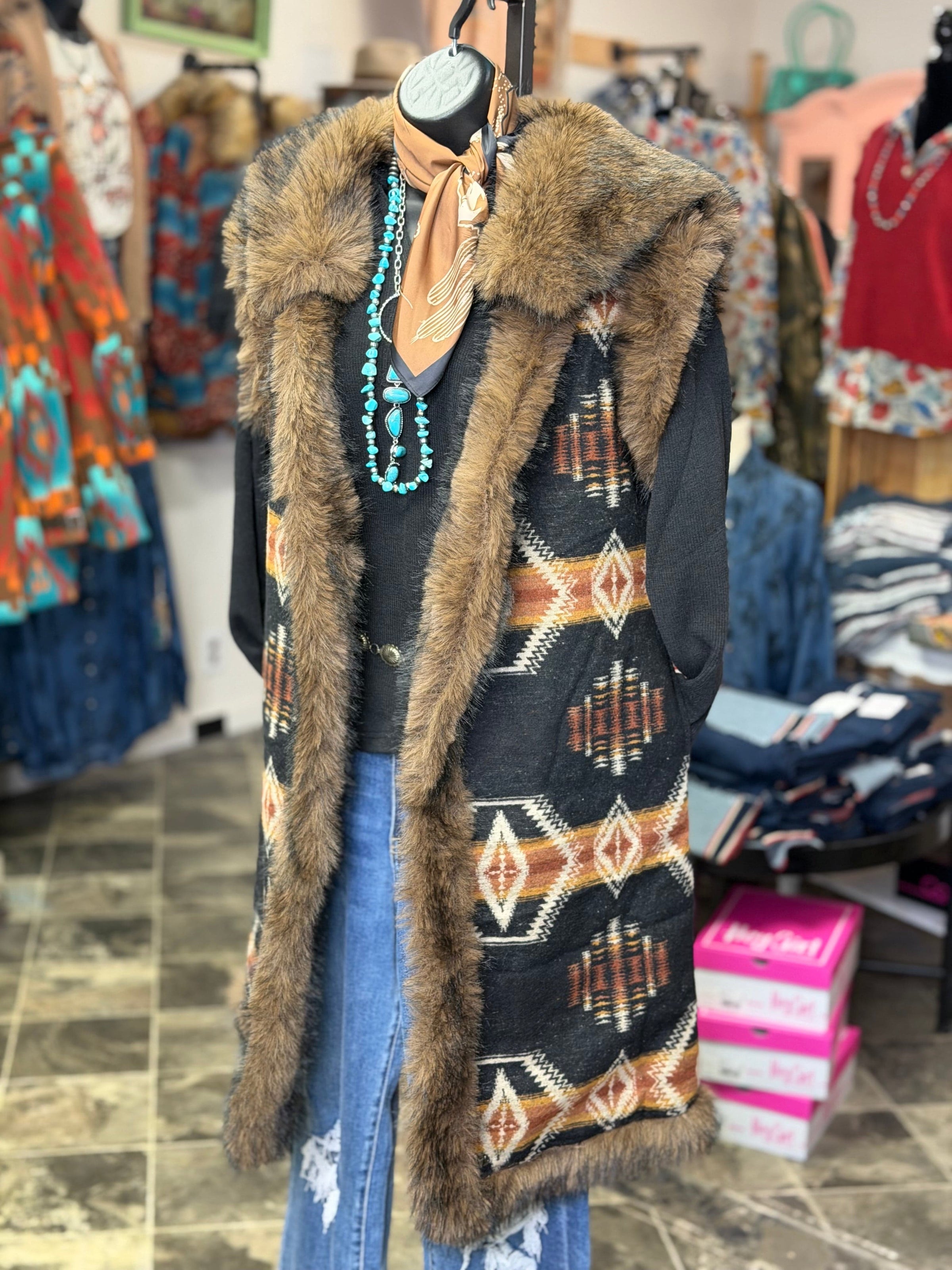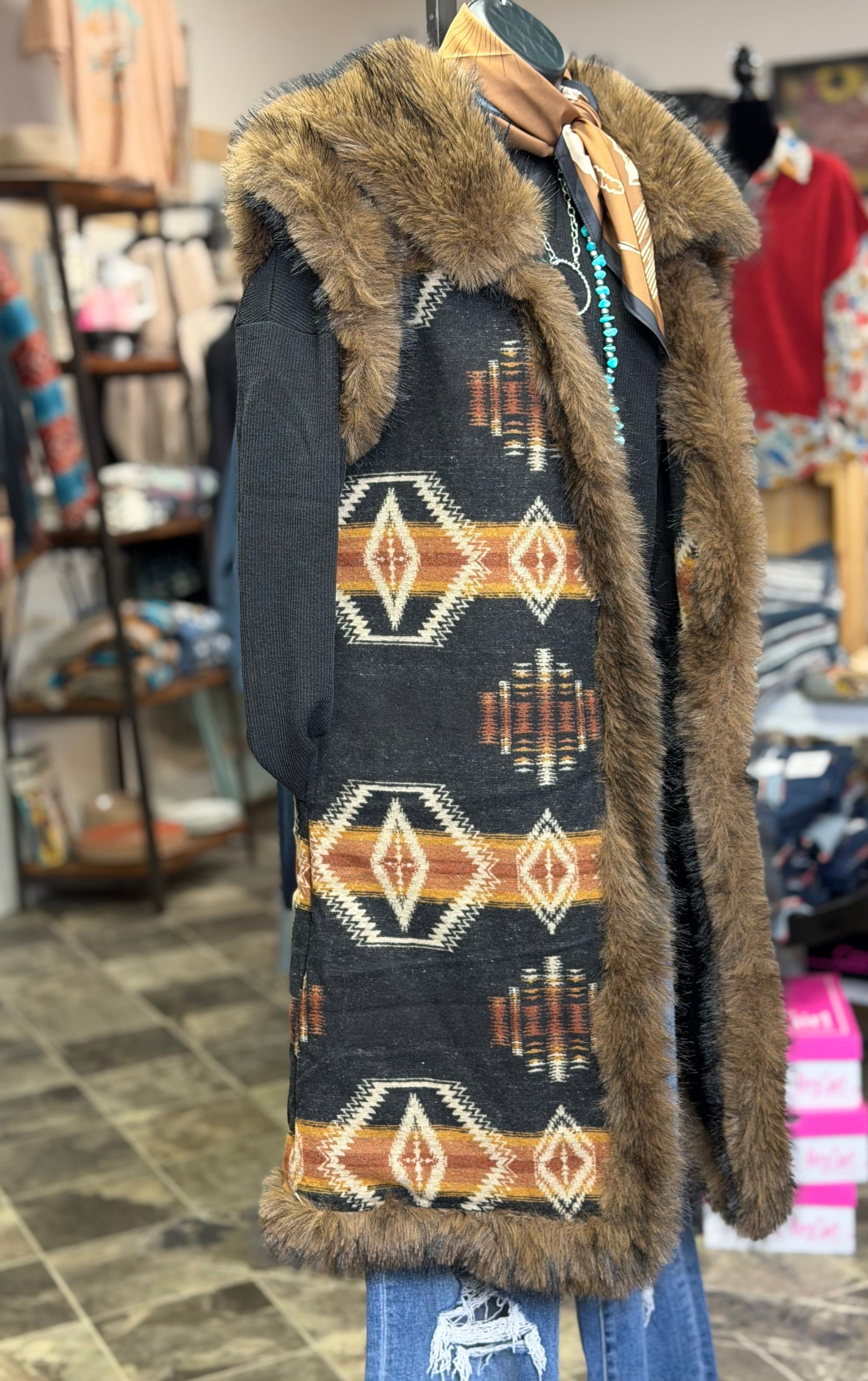 Add some serious pizazz to your cold weather look with this fur trimmed Aztec vest! Featuring bold Southwestern patterns and a fun faux fur trim, this standout layering piece lets you switch up your style with ease. Wear it with the fur for extra style or remove it for a classic, everyday Western vibe. Blending timeless Southwest style with modern flair, this vest is perfect for rodeos, stock shows, concerts, and cool-weather events. Limited availability—don’t miss out on this must-have statement piece!