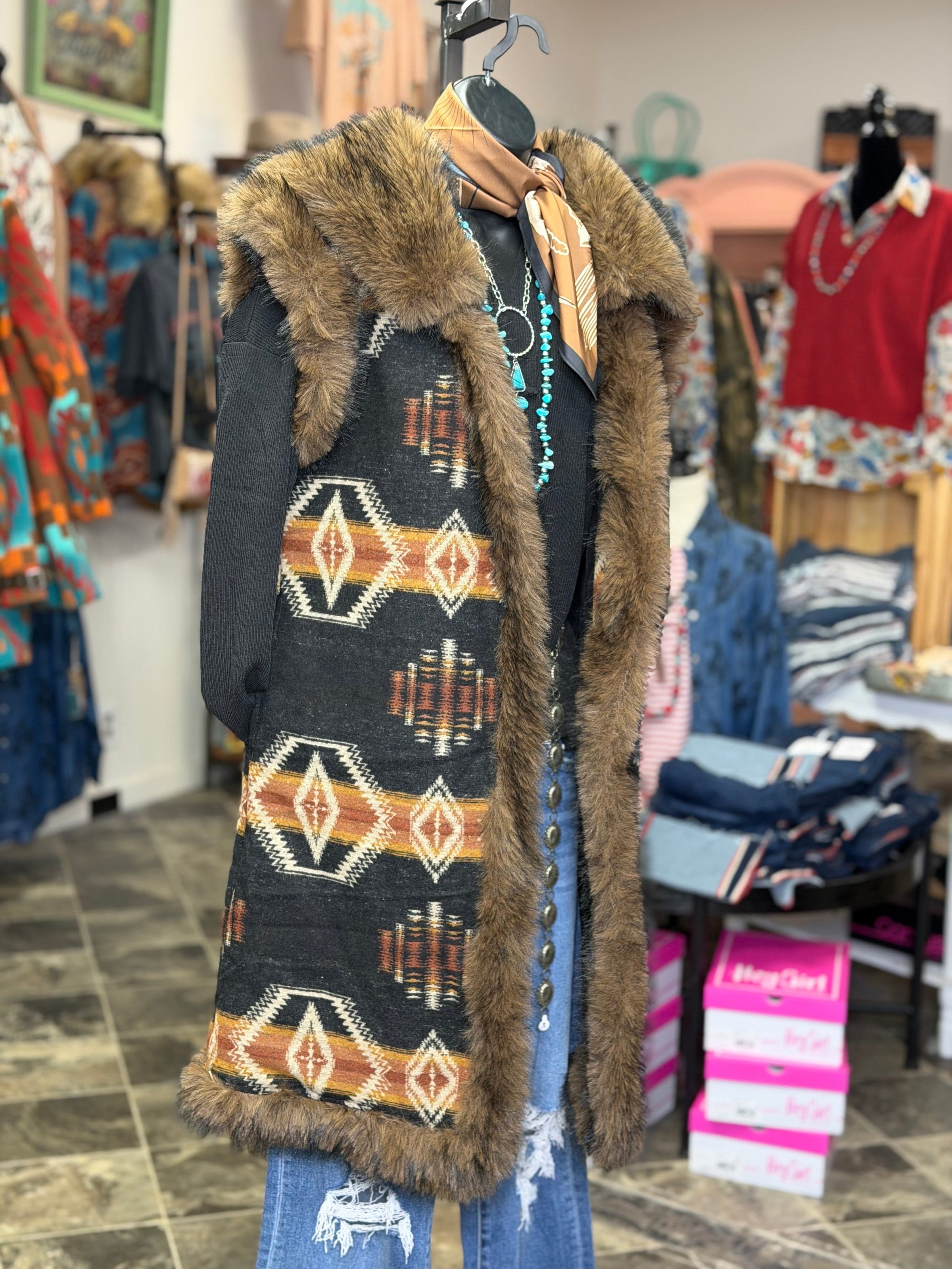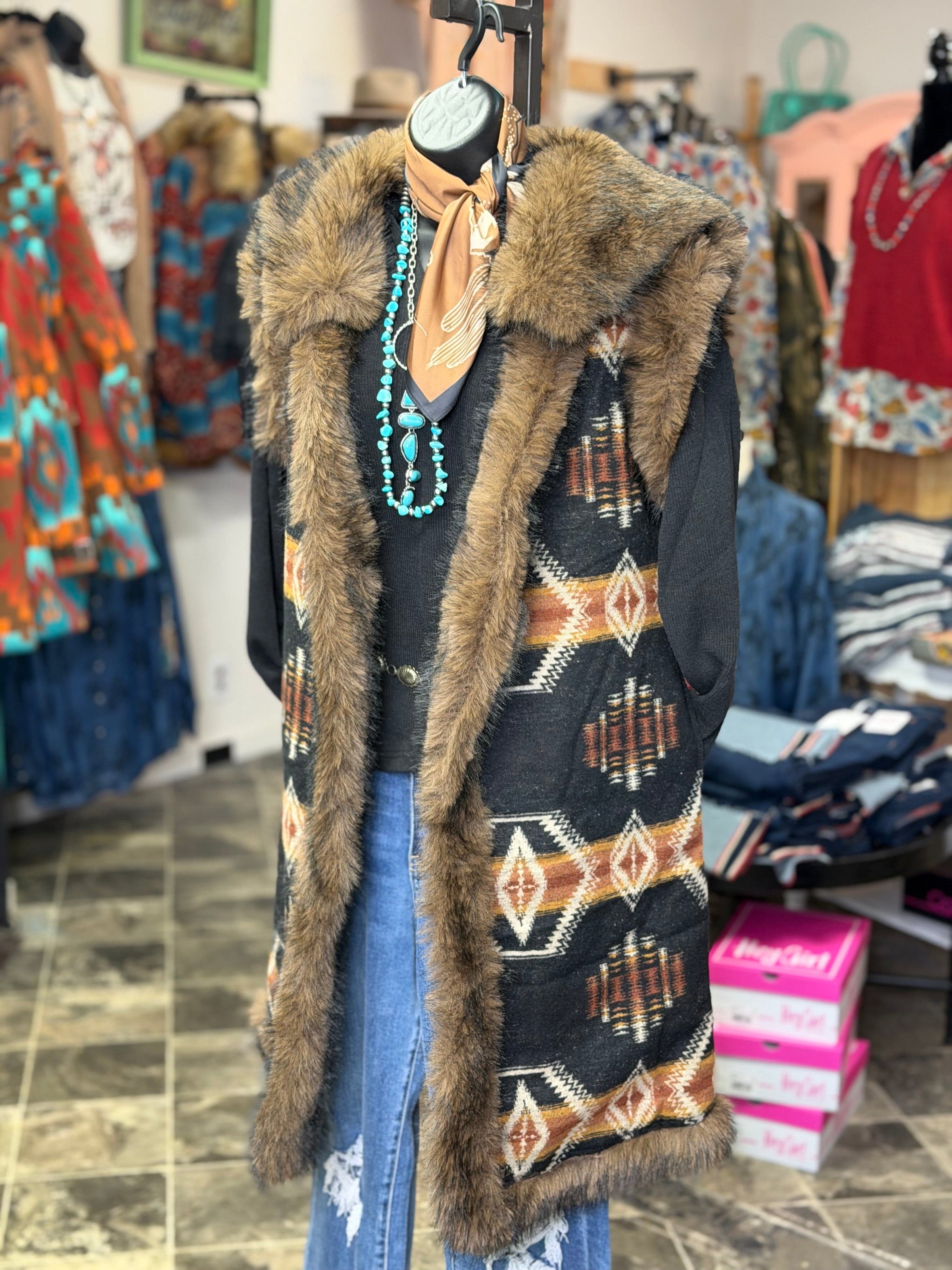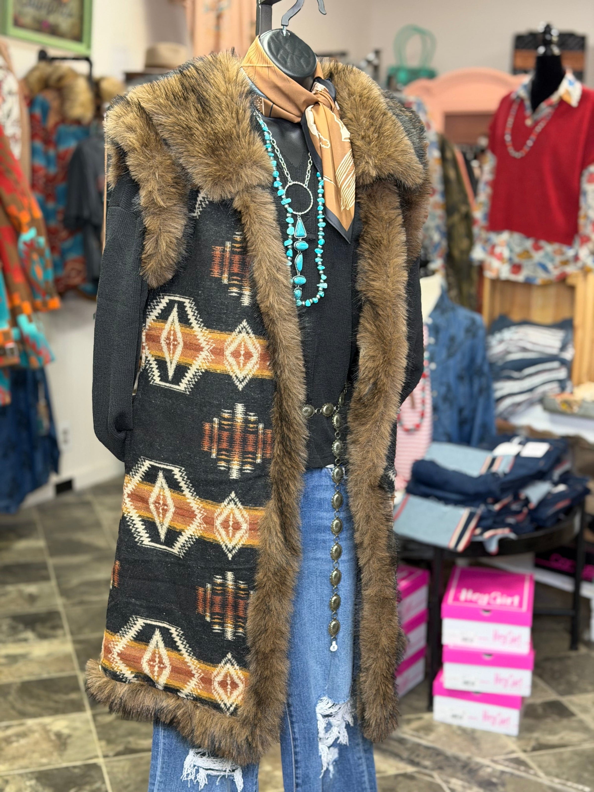Add some serious pizazz to your cold weather look with this fur trimmed Aztec vest! Featuring bold Southwestern patterns and a fun faux fur trim, this standout layering piece lets you switch up your style with ease. Wear it with the fur for extra style or remove it for a classic, everyday Western vibe. Blending timeless Southwest style with modern flair, this vest is perfect for rodeos, stock shows, concerts, and cool-weather events. Limited availability—don’t miss out on this must-have statement piece!