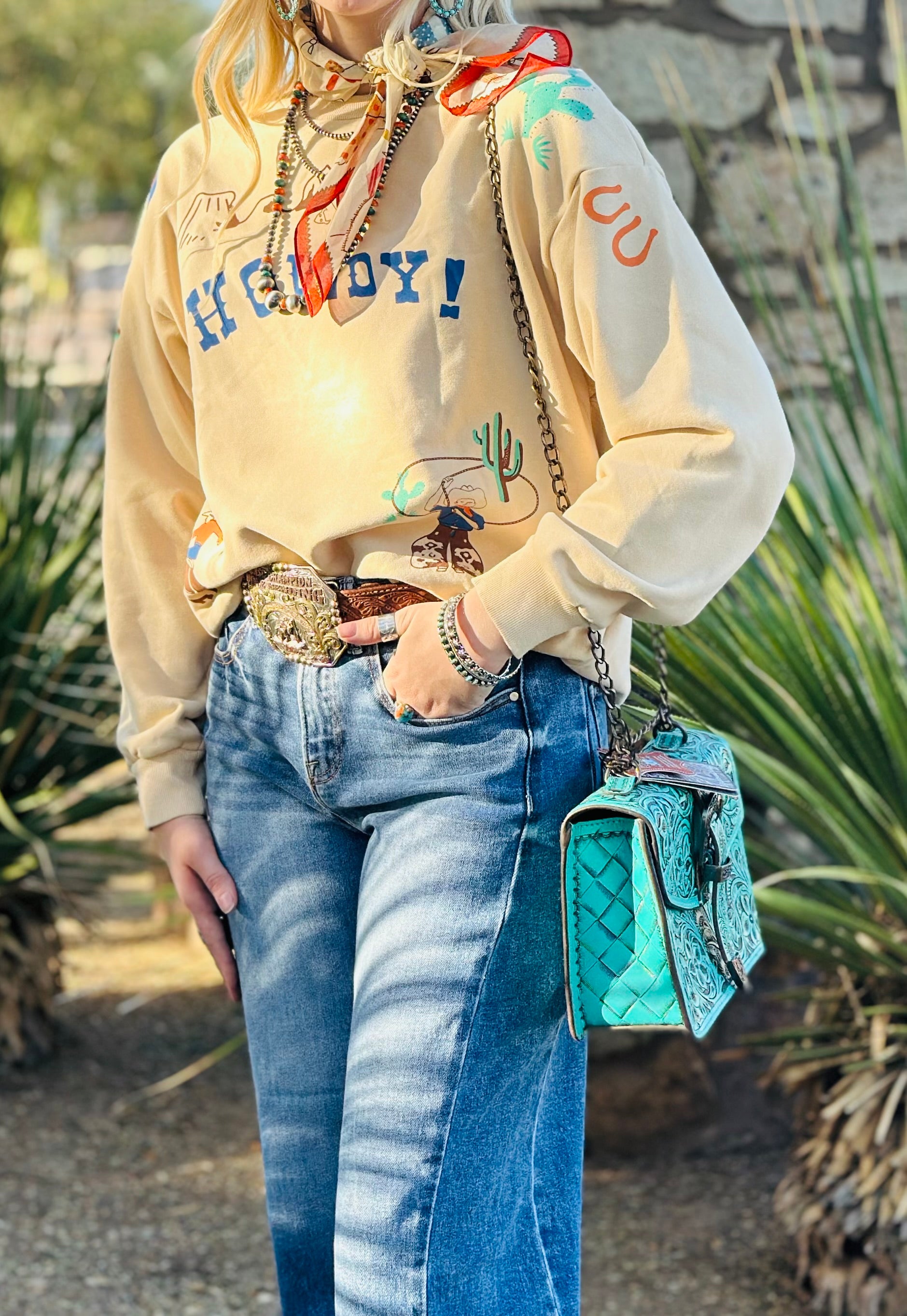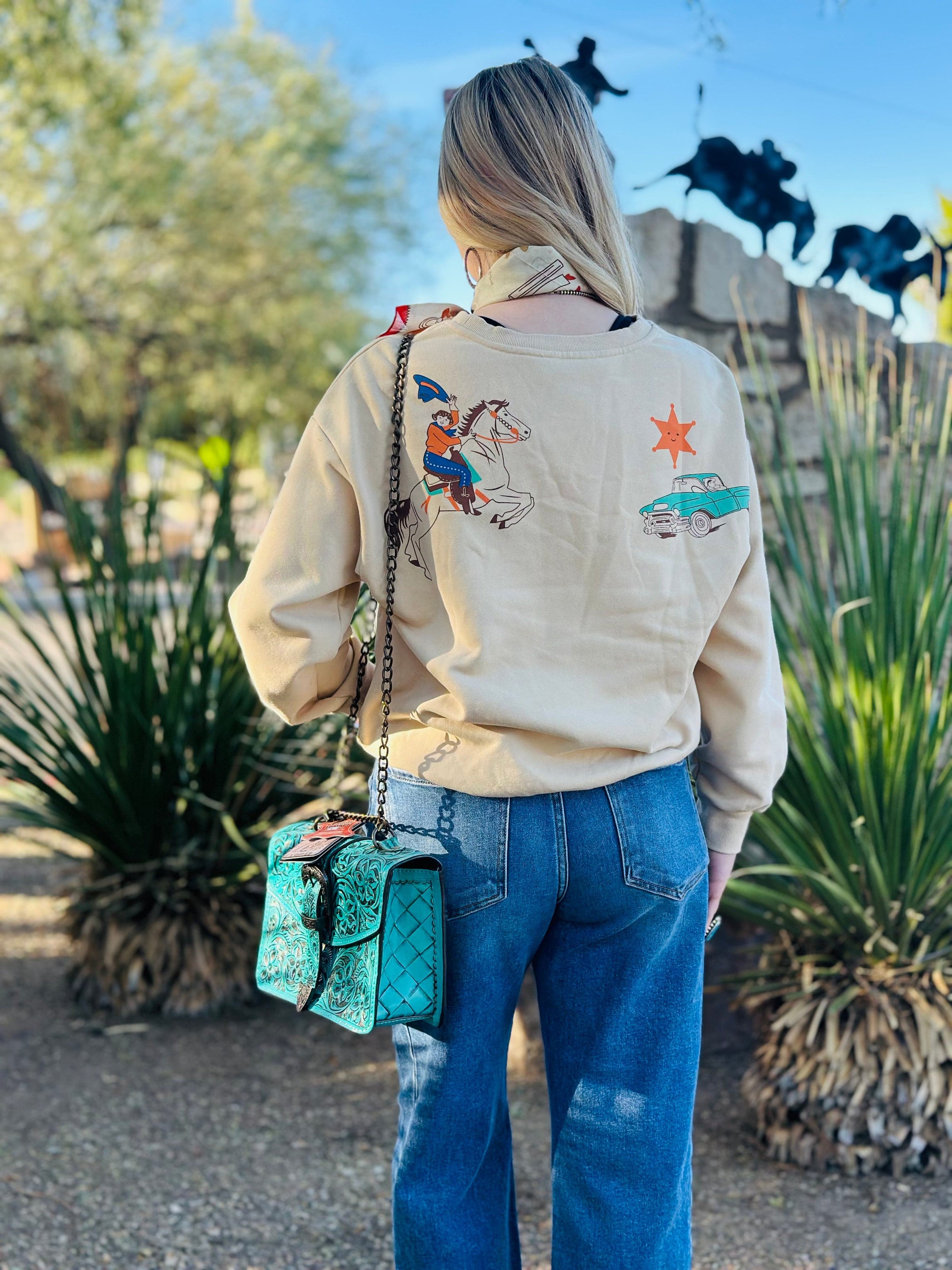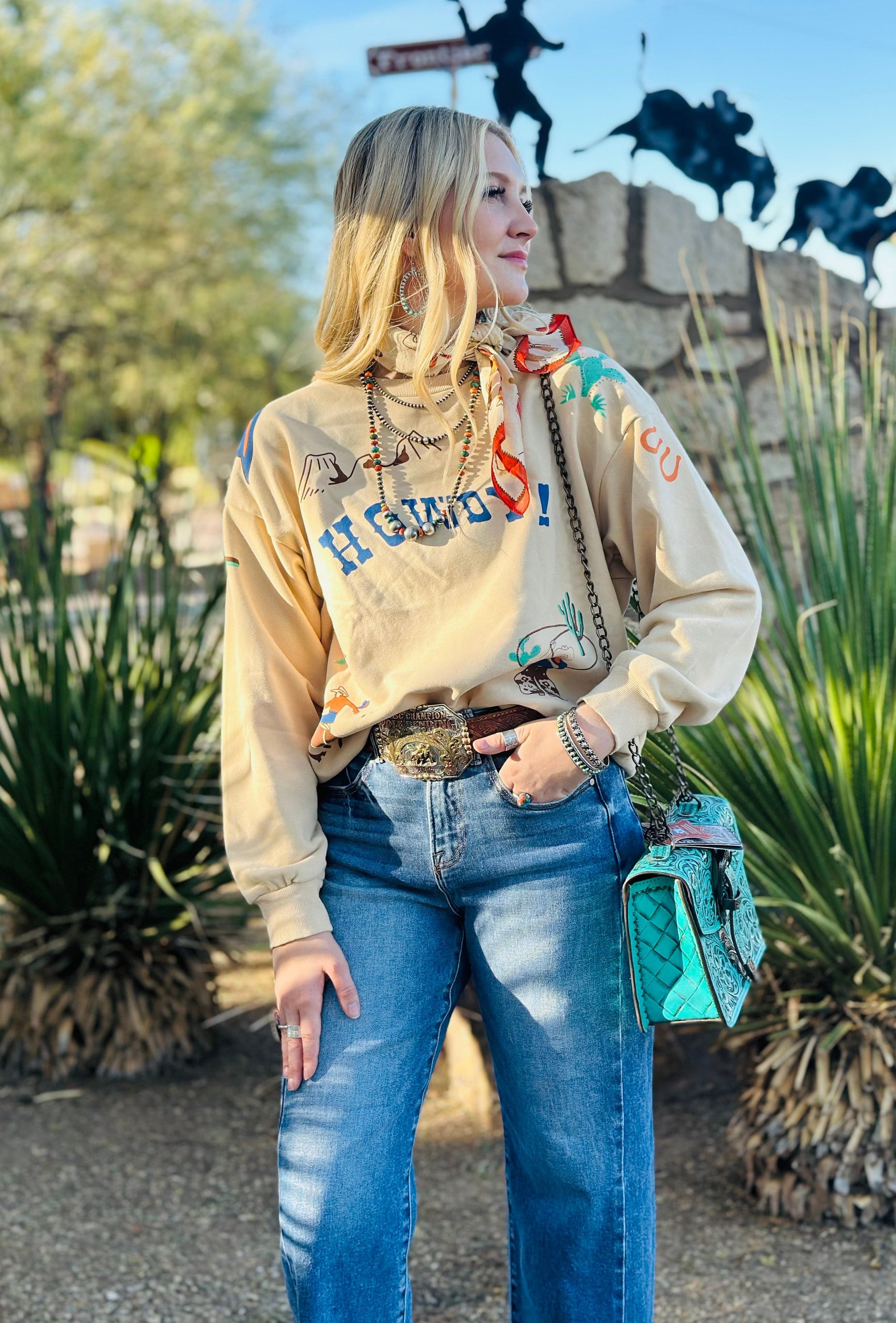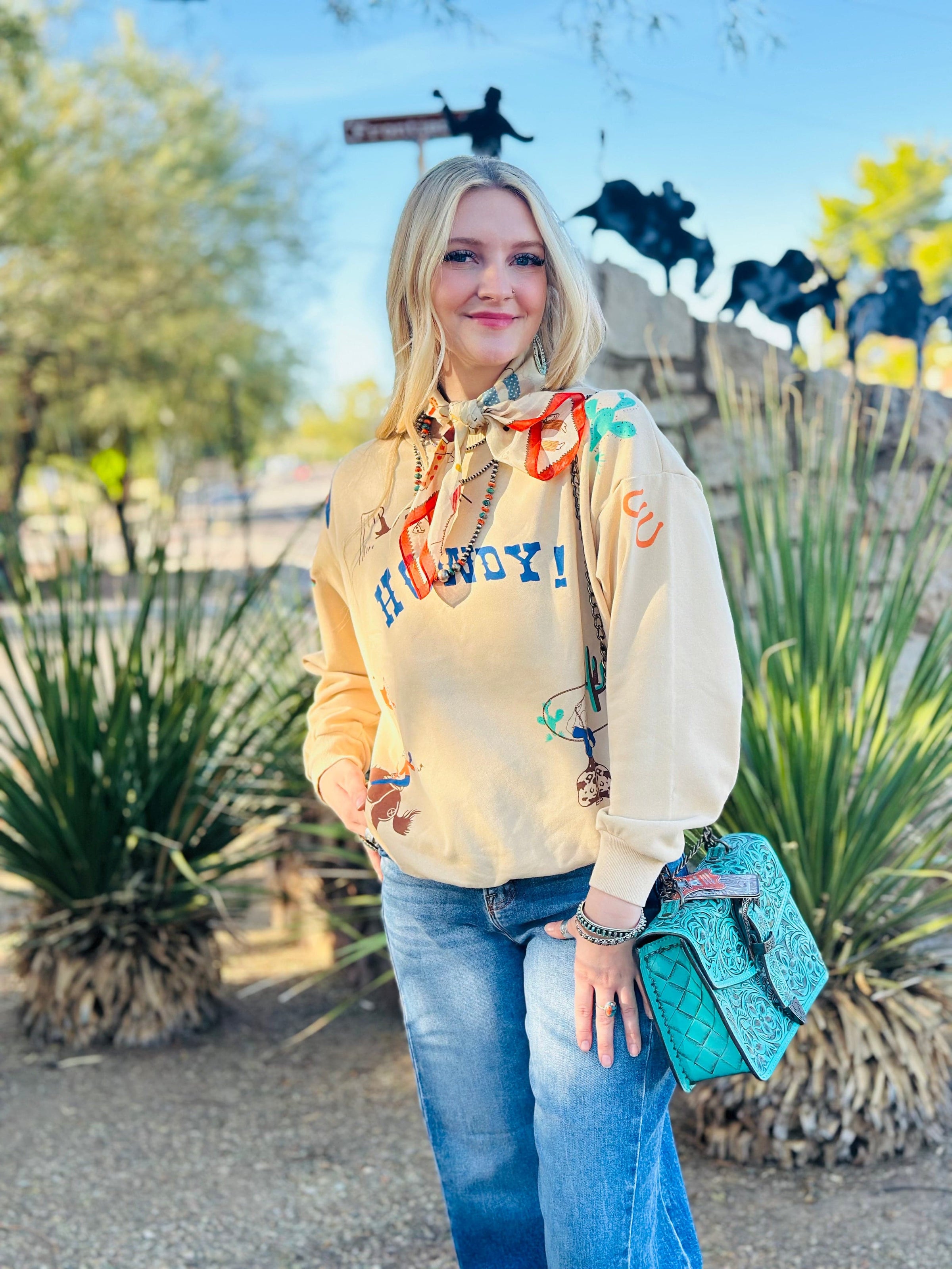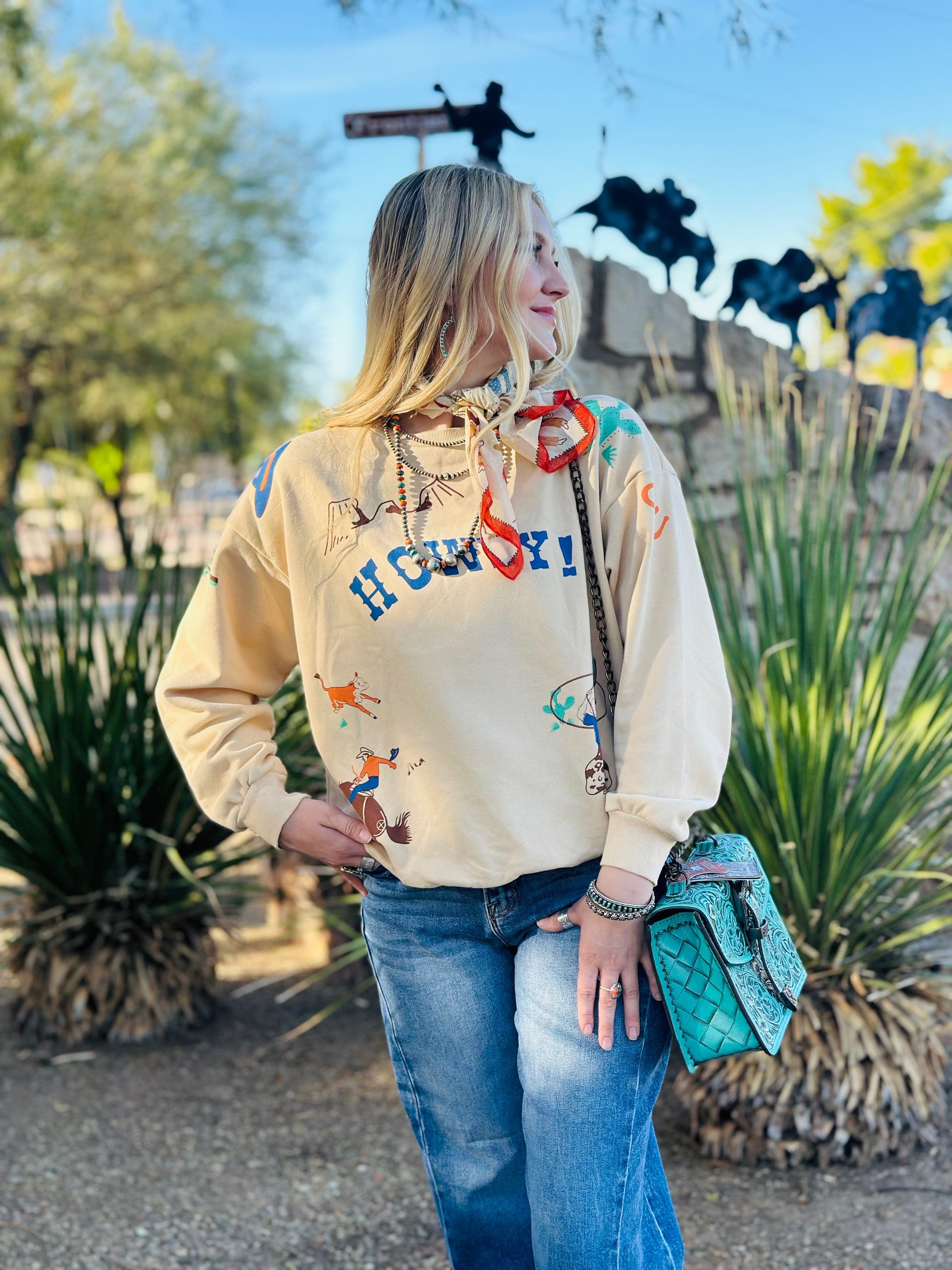 Say howdy to your new favorite graphic! 🤠 This fun Western-inspired light beige pullover features classic rodeo icons that bring all the cowgirl vibes. Made from a soft, lightweight French terry fabric, it’s perfect for those easygoing days when you still want to look rodeo ready.