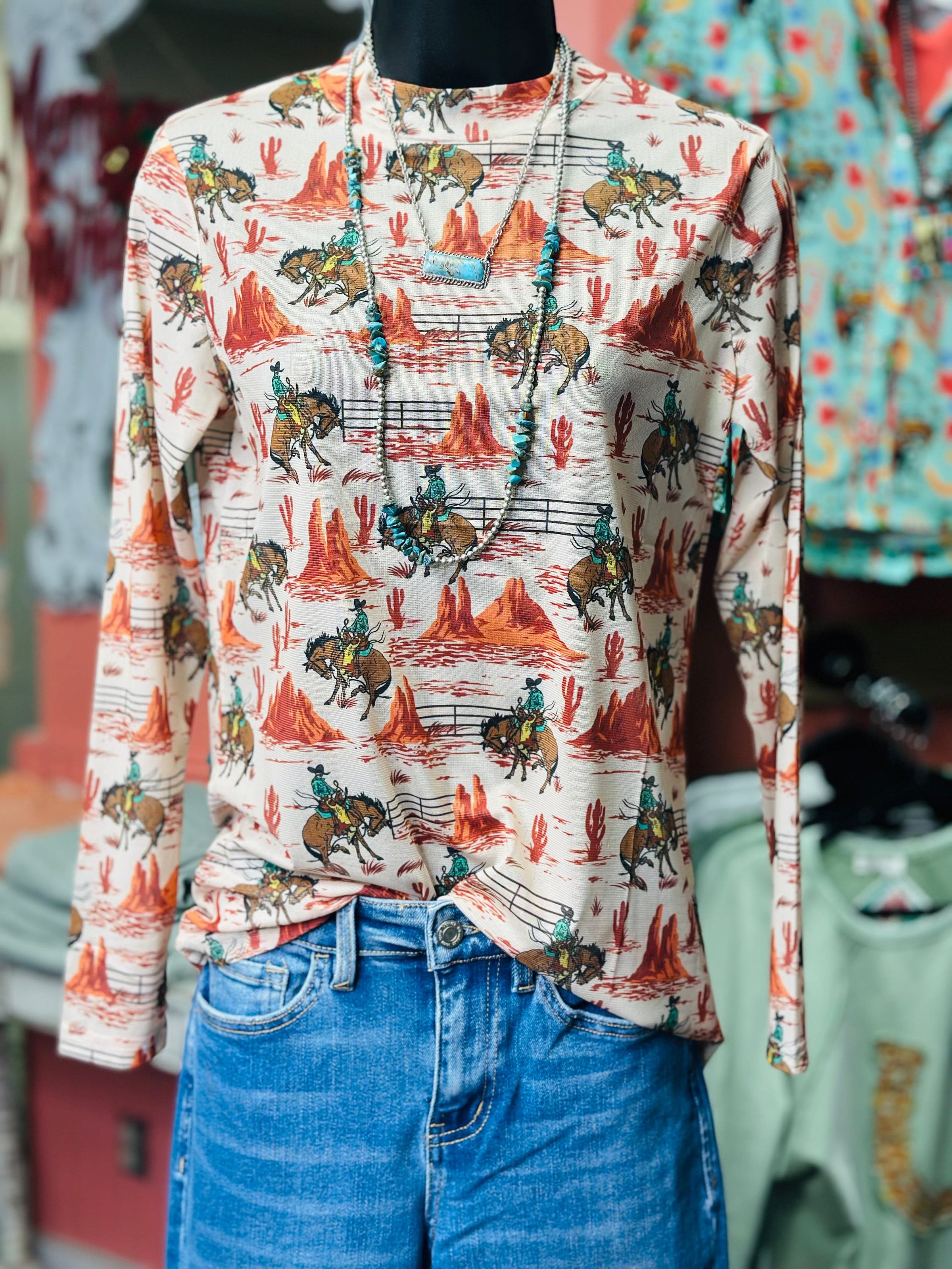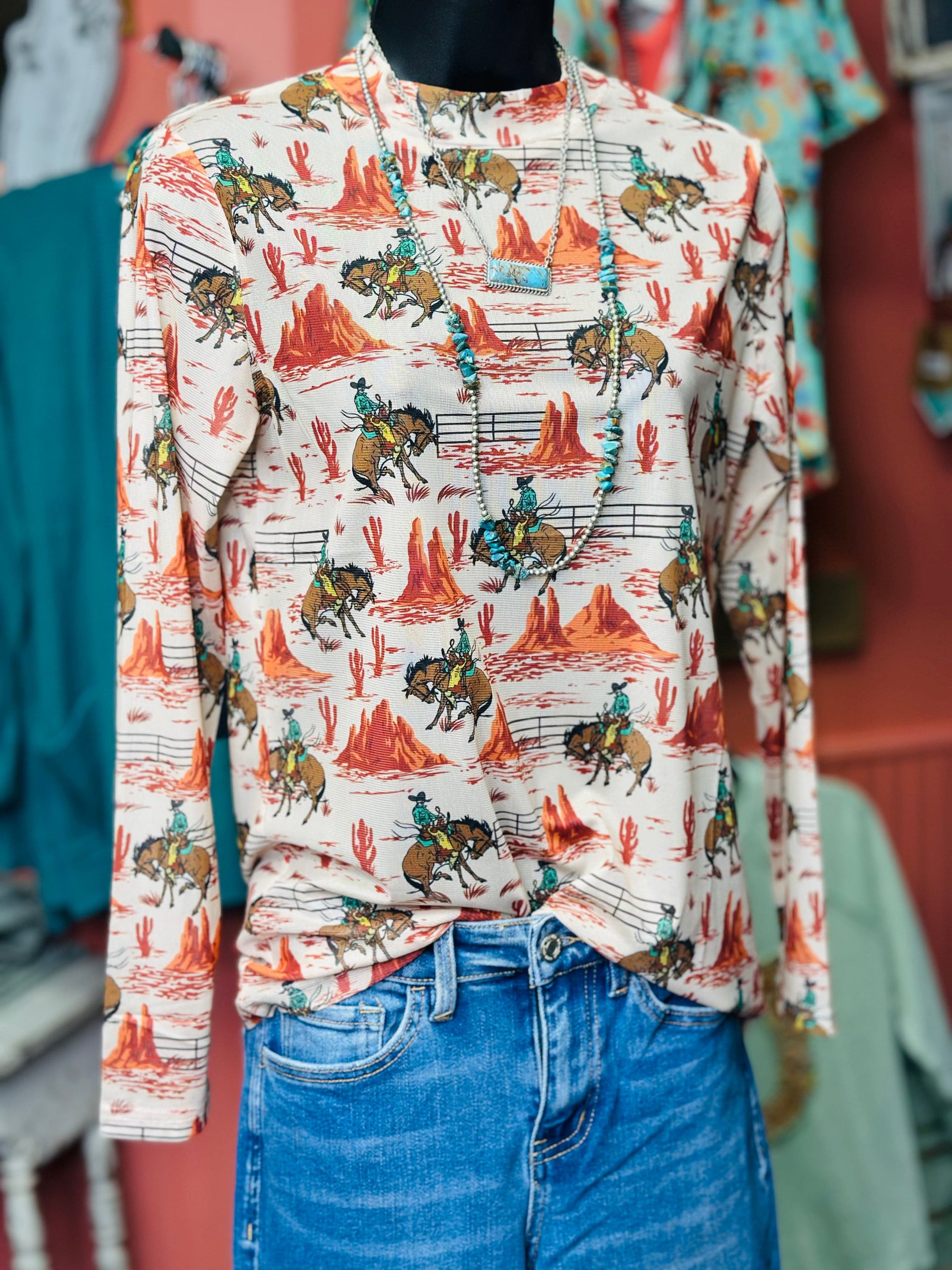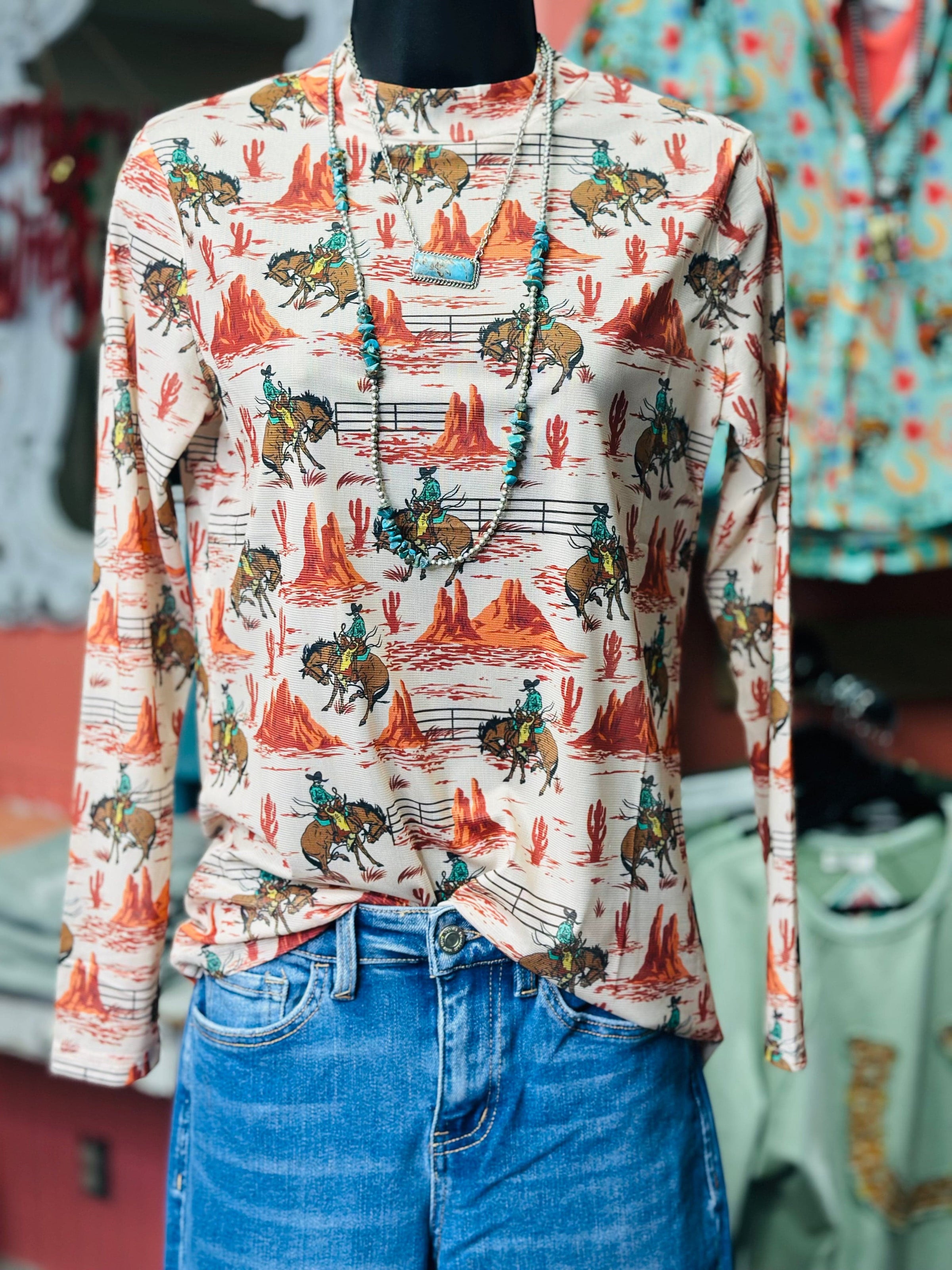 New and so cute! This great-fitting Western mesh top is a must-have for layering season. Featuring all-over Western style graphics with cowboys, desert scenes, and cactus details, this lightweight mesh top brings major cowgirl energy.!
