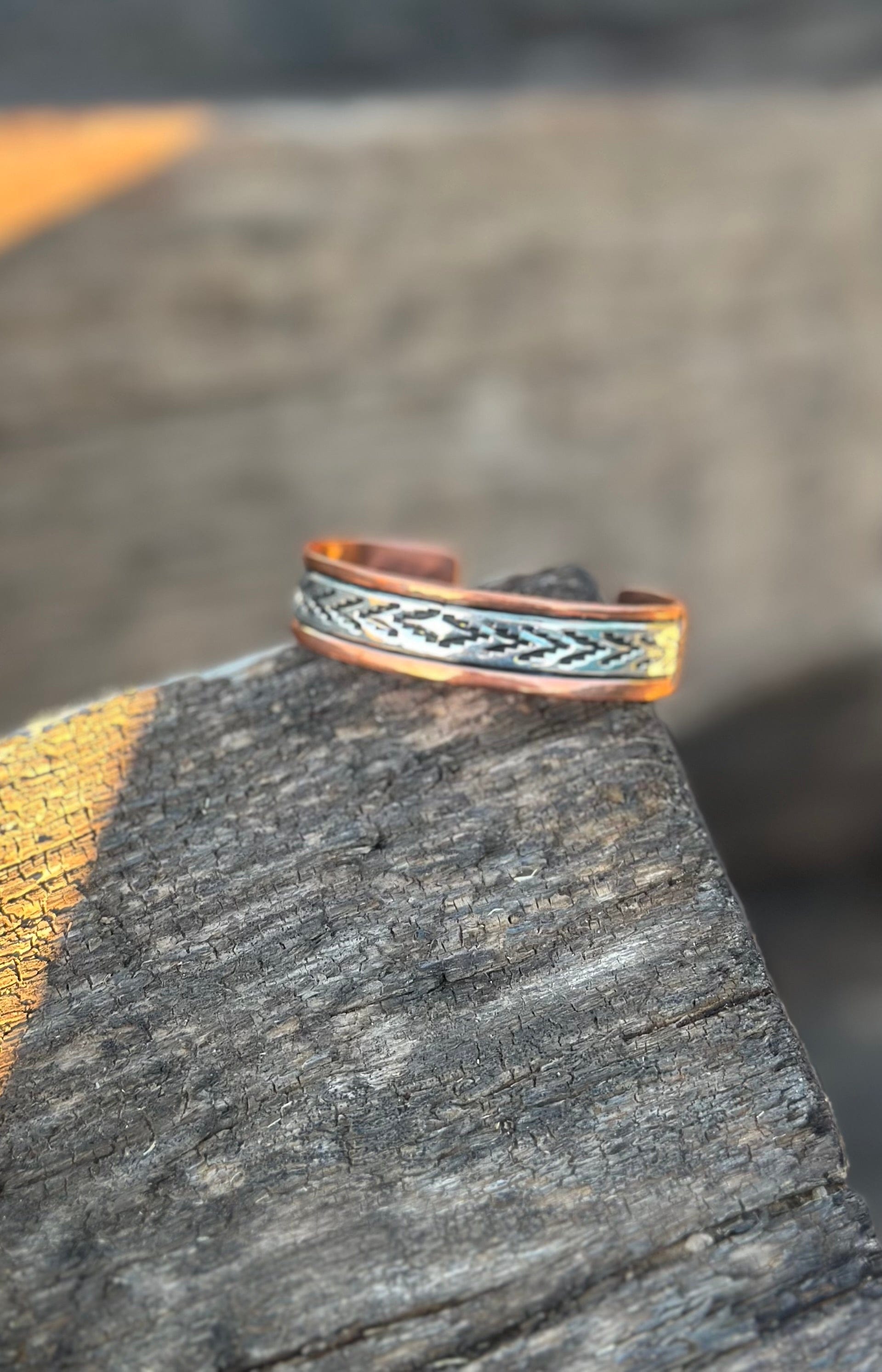 This southwest Native American made cuff bracelet is a statement piece! Gorgeous hand done sterling silver & copper for a timeless and classy look!   Don’t miss out on this fab one!