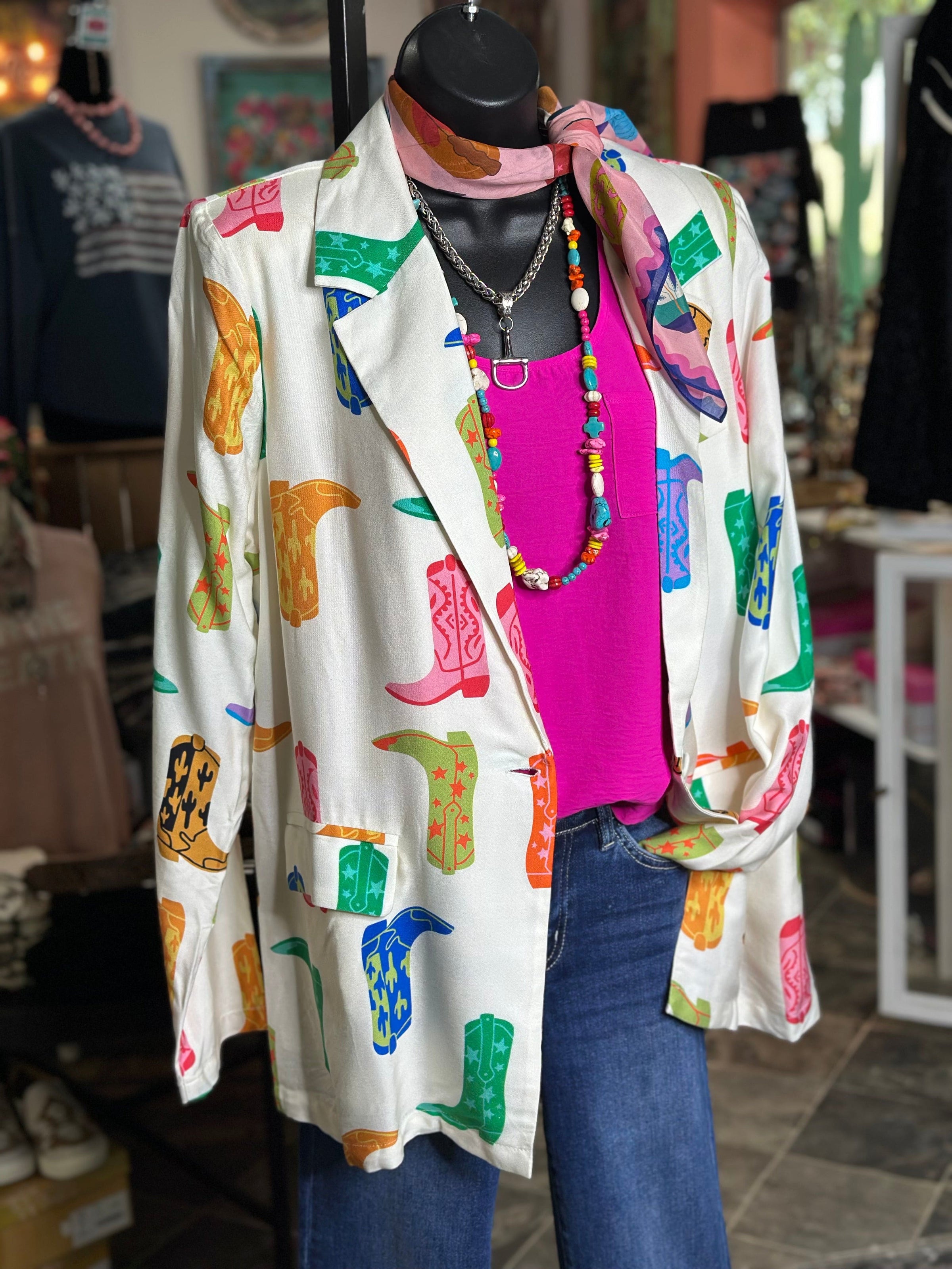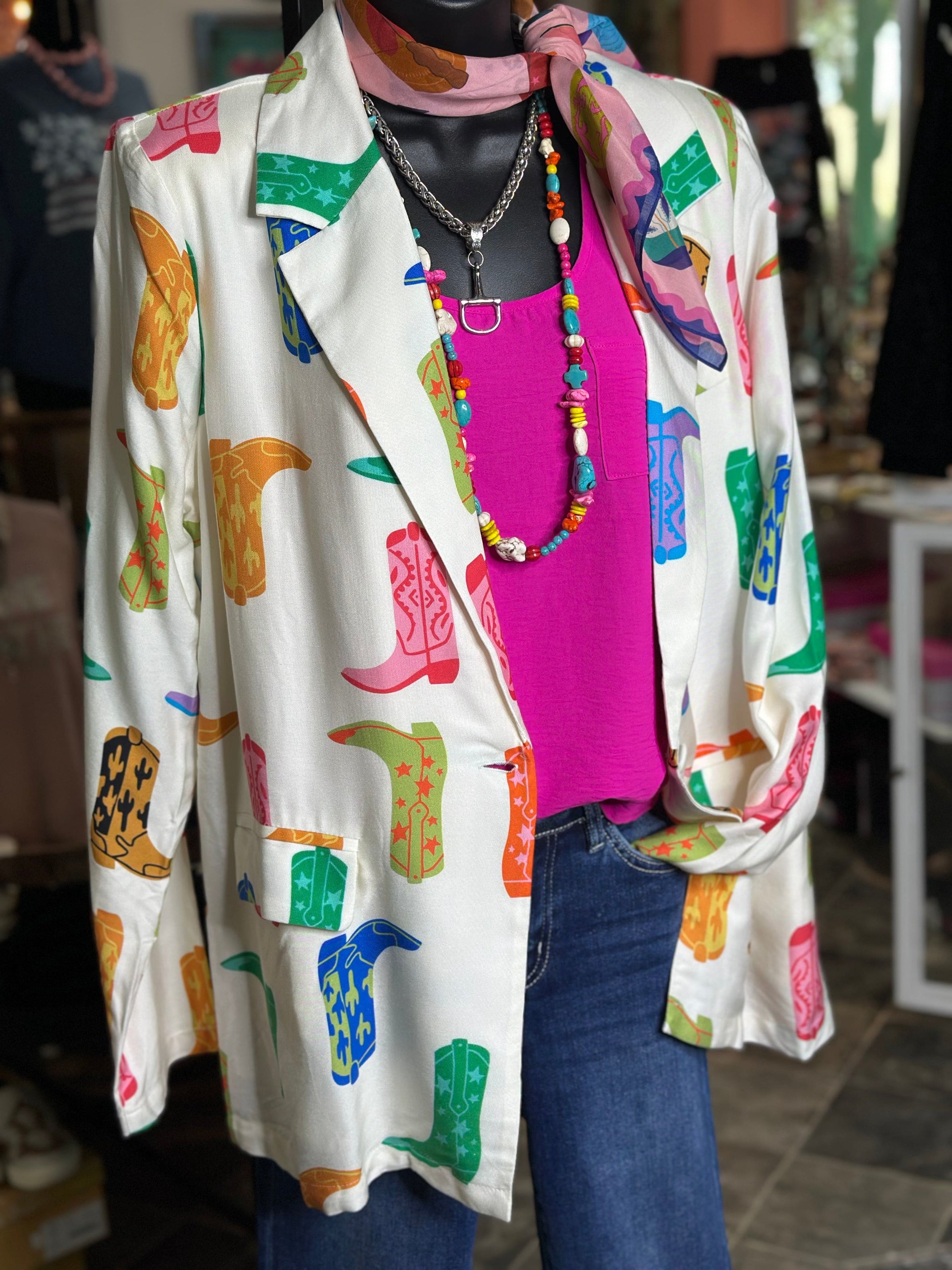 This blazer brings the perfect balance of professional and playful, styled with colorful cowgirl boots for a look that truly stands out. With a flattering, easy fit and just the right amount of structure, it’s a versatile piece you can dress up for work or dress down for everyday wear. Pair it with denim, a graphic tee, or one of our favorite Western tops for effortless style with personality.