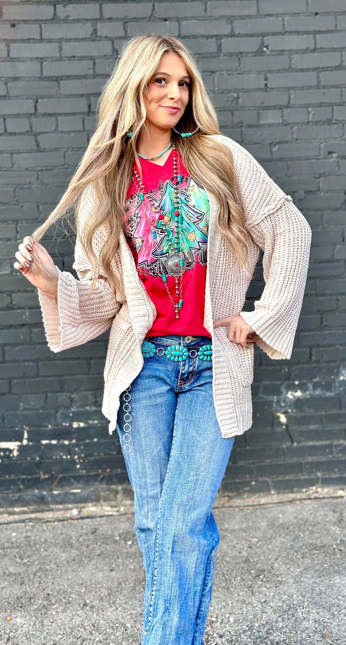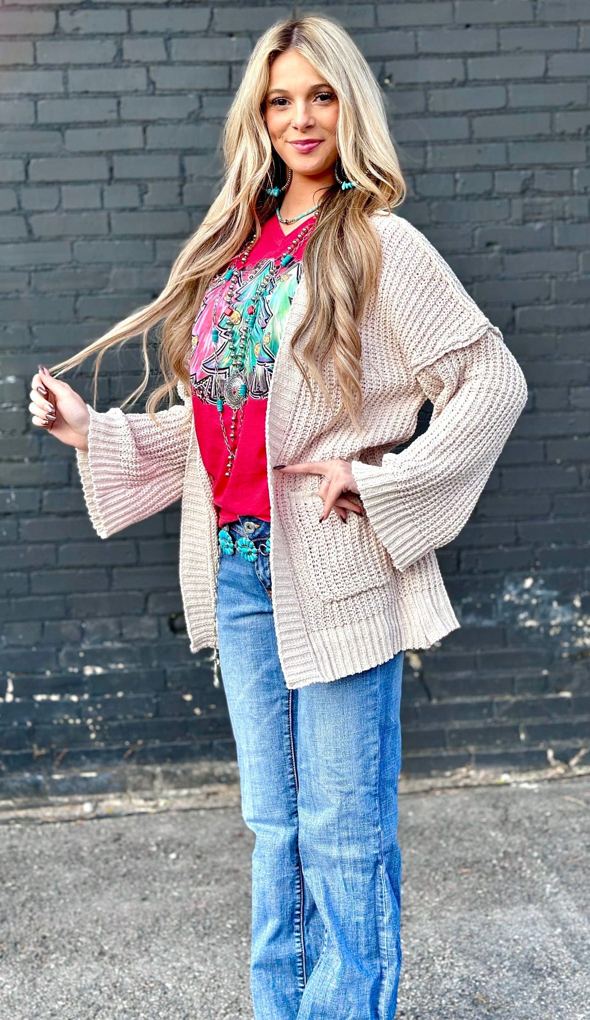 This beautiful sweater has a super flattering fit!  Extra soft with its cozy weave and will be a go to in your closet!  It’s the perfect match to our Penelope cow tee too!