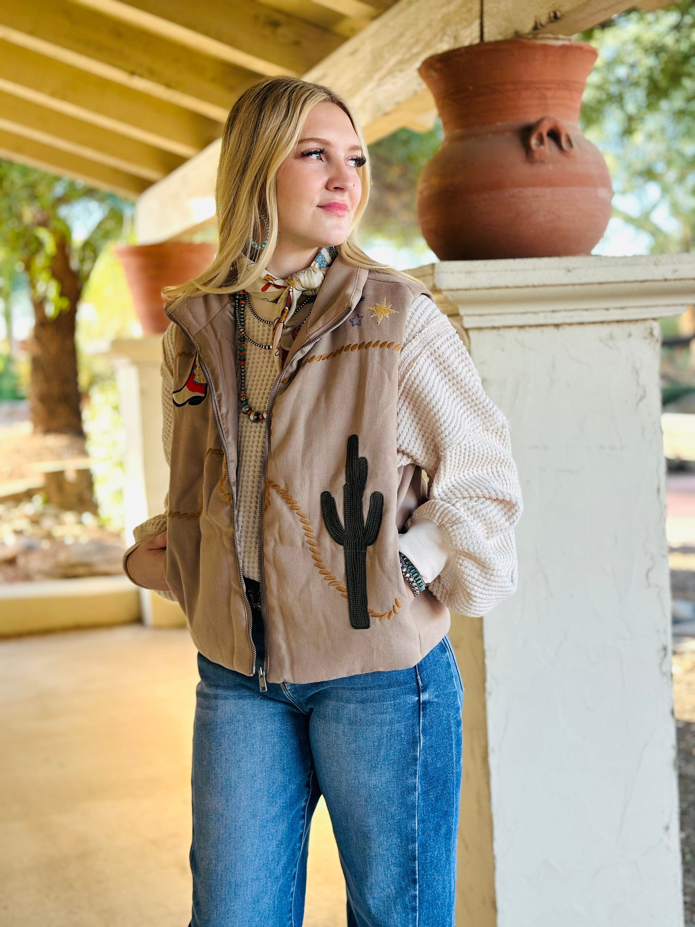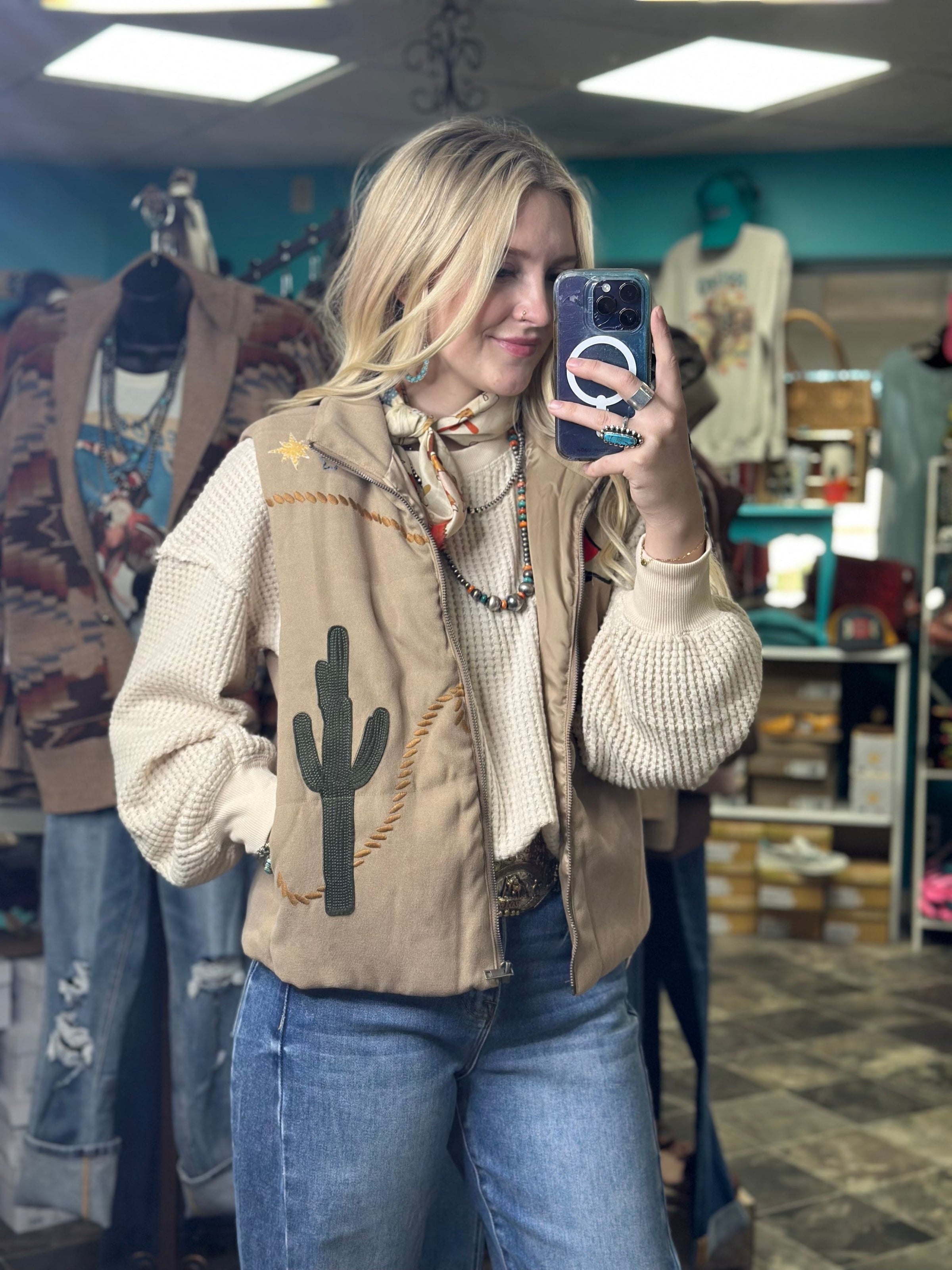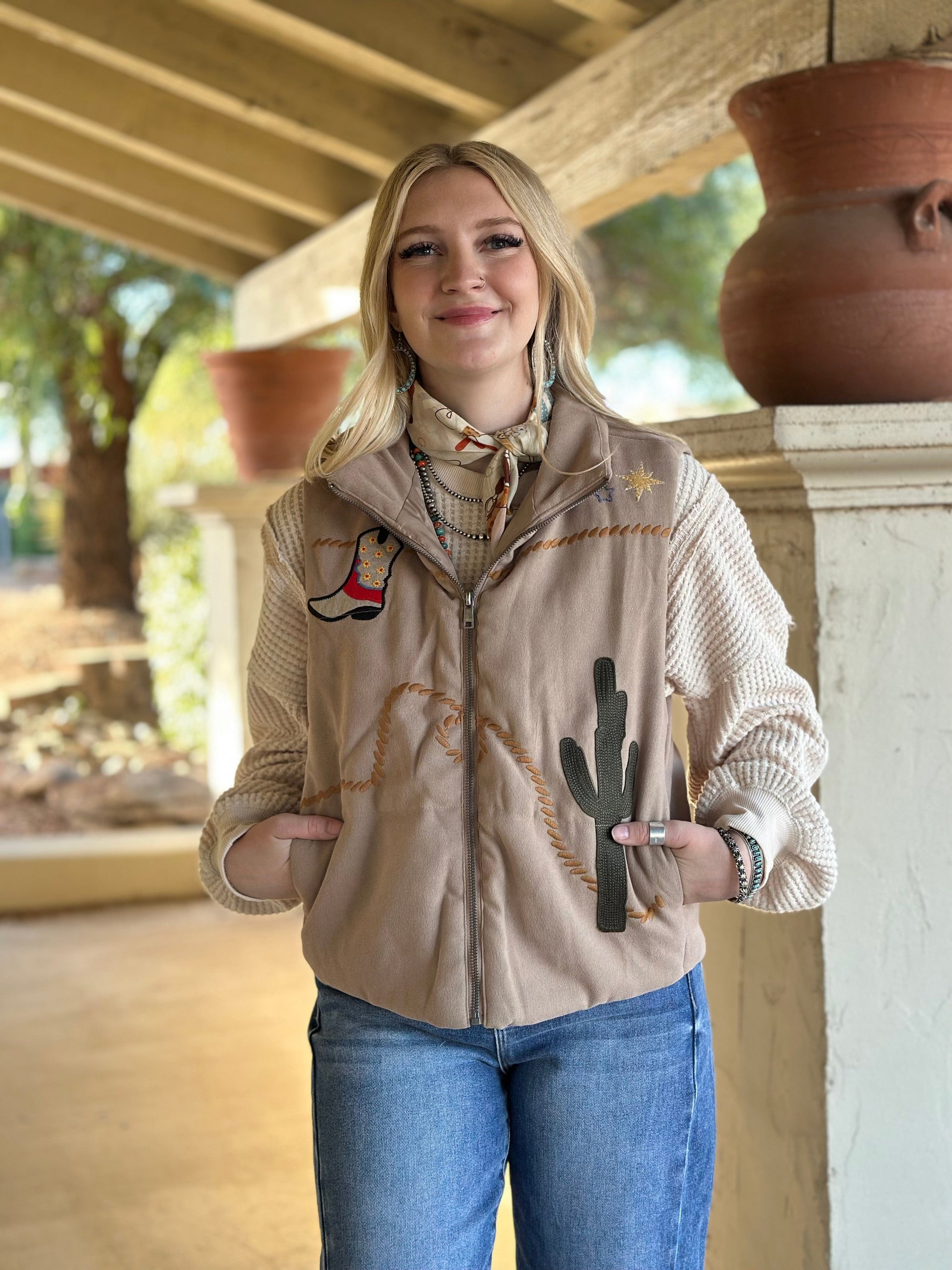 Ride into the sunset in style with the Call Me Western Cactus & Boots Embroidered Vest! Made by one of our favorite companies, this vest features an embroidered rope detail, & cactus and hat, giving it a cute Western look. Perfect for NFR outfits or just adding some flair to your closet! Snag yours today, we can’t reorder!