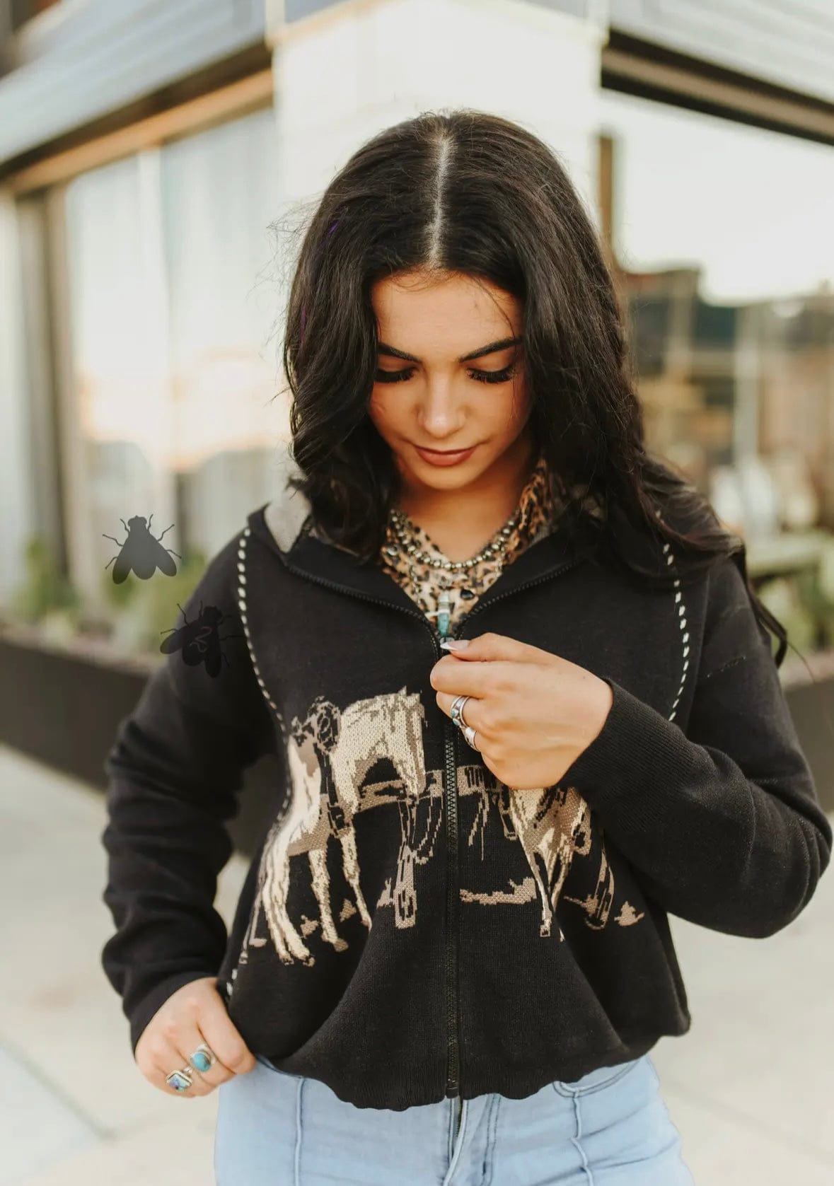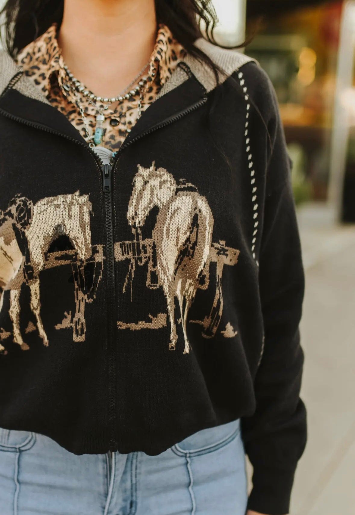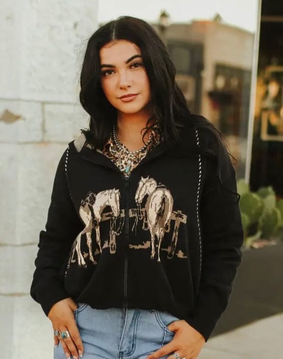 Cowgirl up in the cutest Western layer of the season! This hooded zip-up sweater brings all the ranch vibes with bold horses front and center— classic Western charm. The stitch detailing gives it that handmade look we love, and the cozy knit makes it perfect for chilly feed runs or rodeo nights.