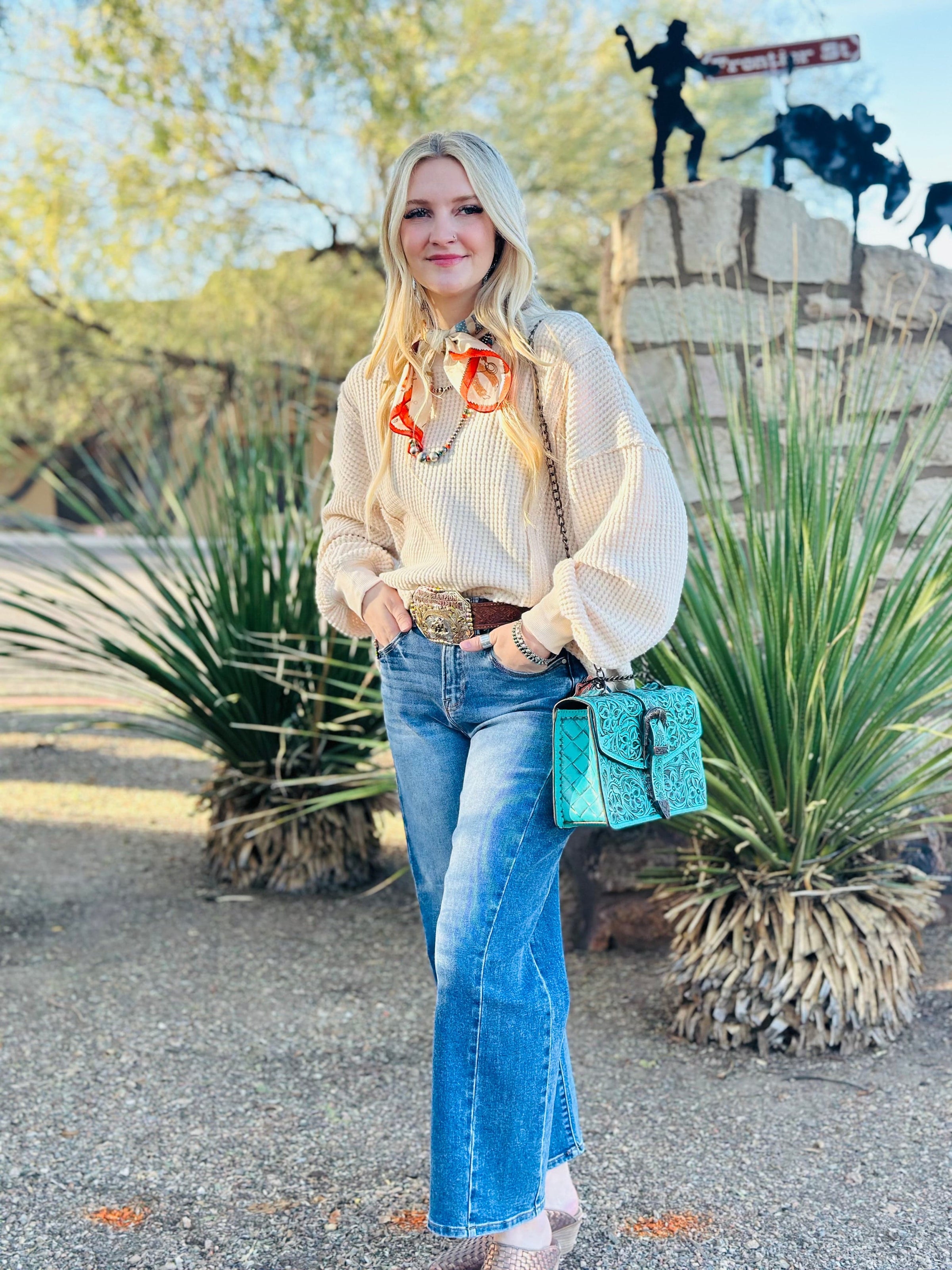 This is the perfect top to head to school, to the movies, or running errands! This cream colored top was a hit in the shop, and is so flattering, and the stitch detail gives it even more style! You will love this great fitting, ultra soft top! . Fall dressing at its best!