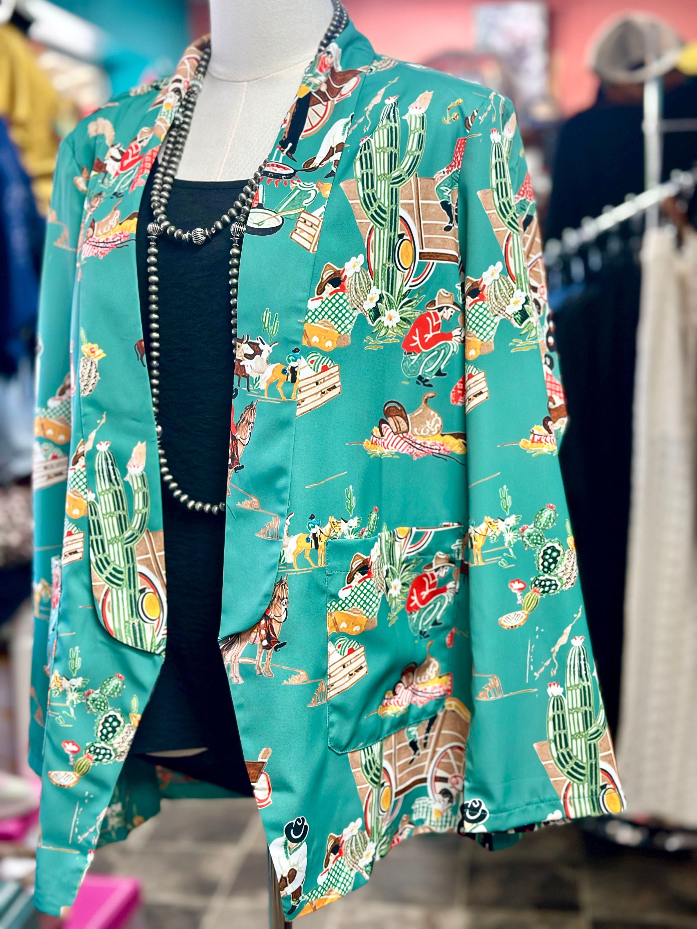 We Absolutely adore the fit and feel of this gorgeous Wagon Trail blazer! Stunning as a traditional blazer, with the most darling fit! The retro wagon trail scene add a fun touch of western style too! Perfect for a day at the office or a night out, it can be dressed up or down!