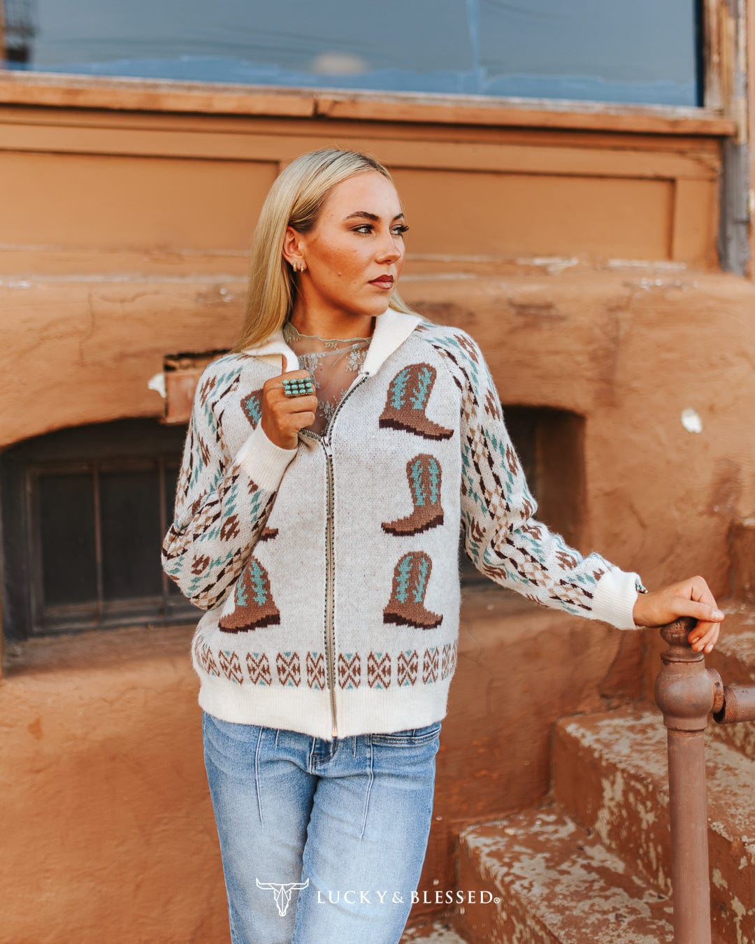 Showstopper! We love this pretty sweater that has a classic southwest look with its fun boot & Aztec pattern, zip up style, and a super soft feel. All the great colors you need for fall combine in a soft, great fitting sweater!